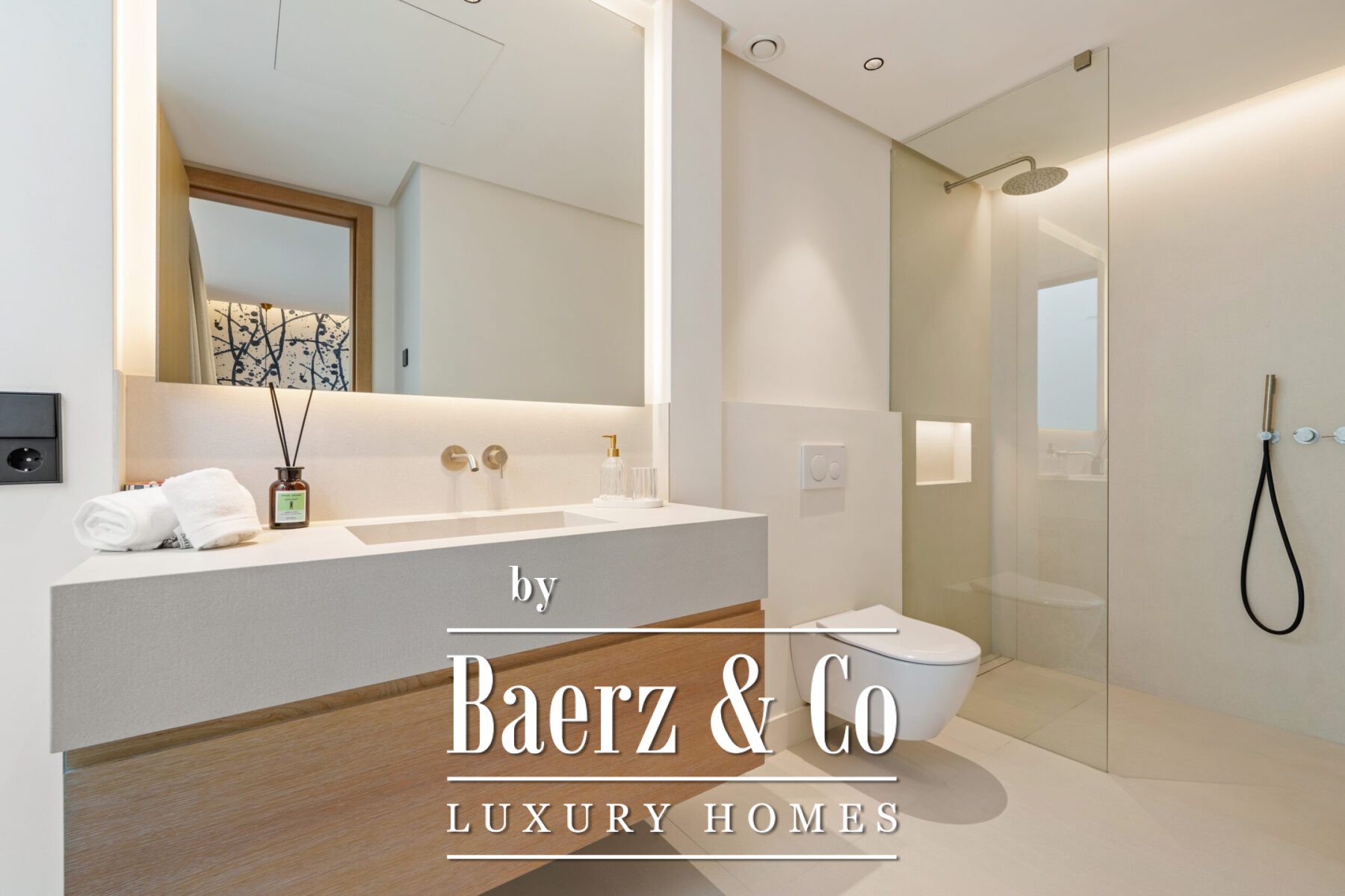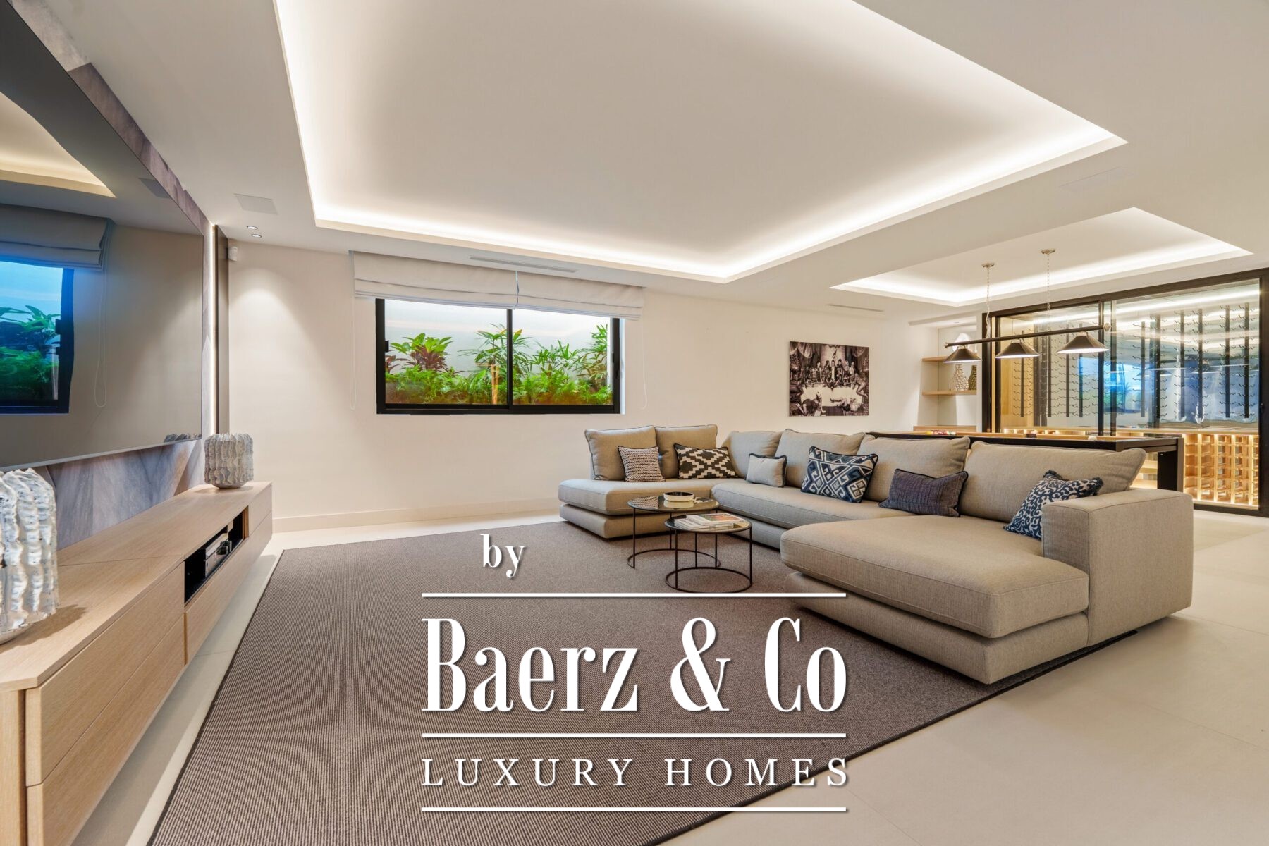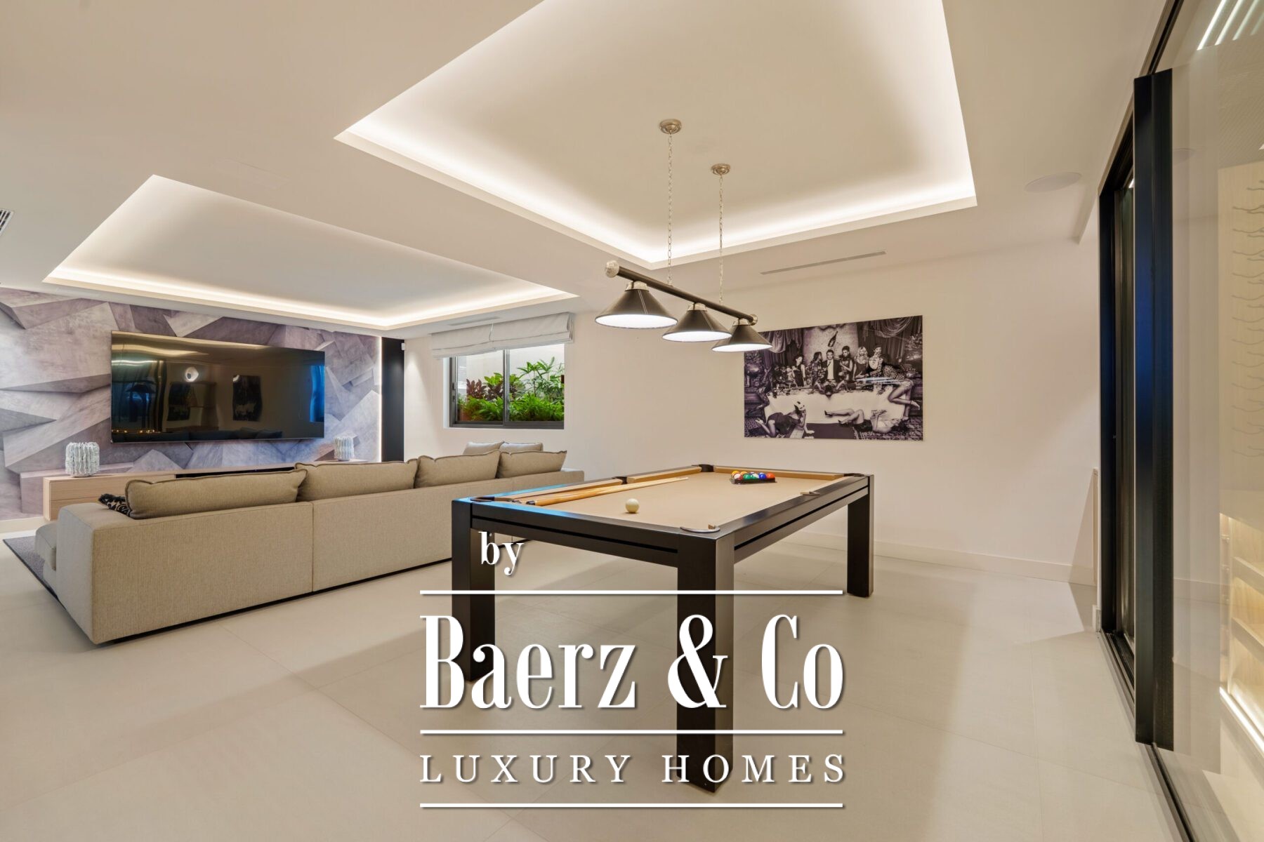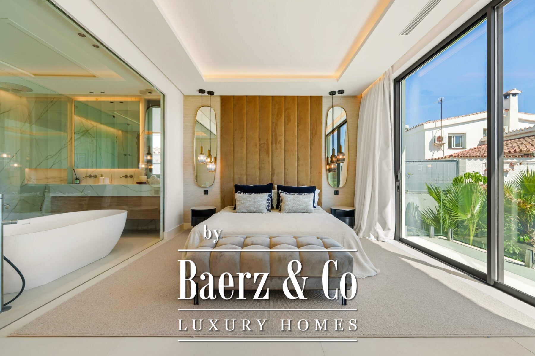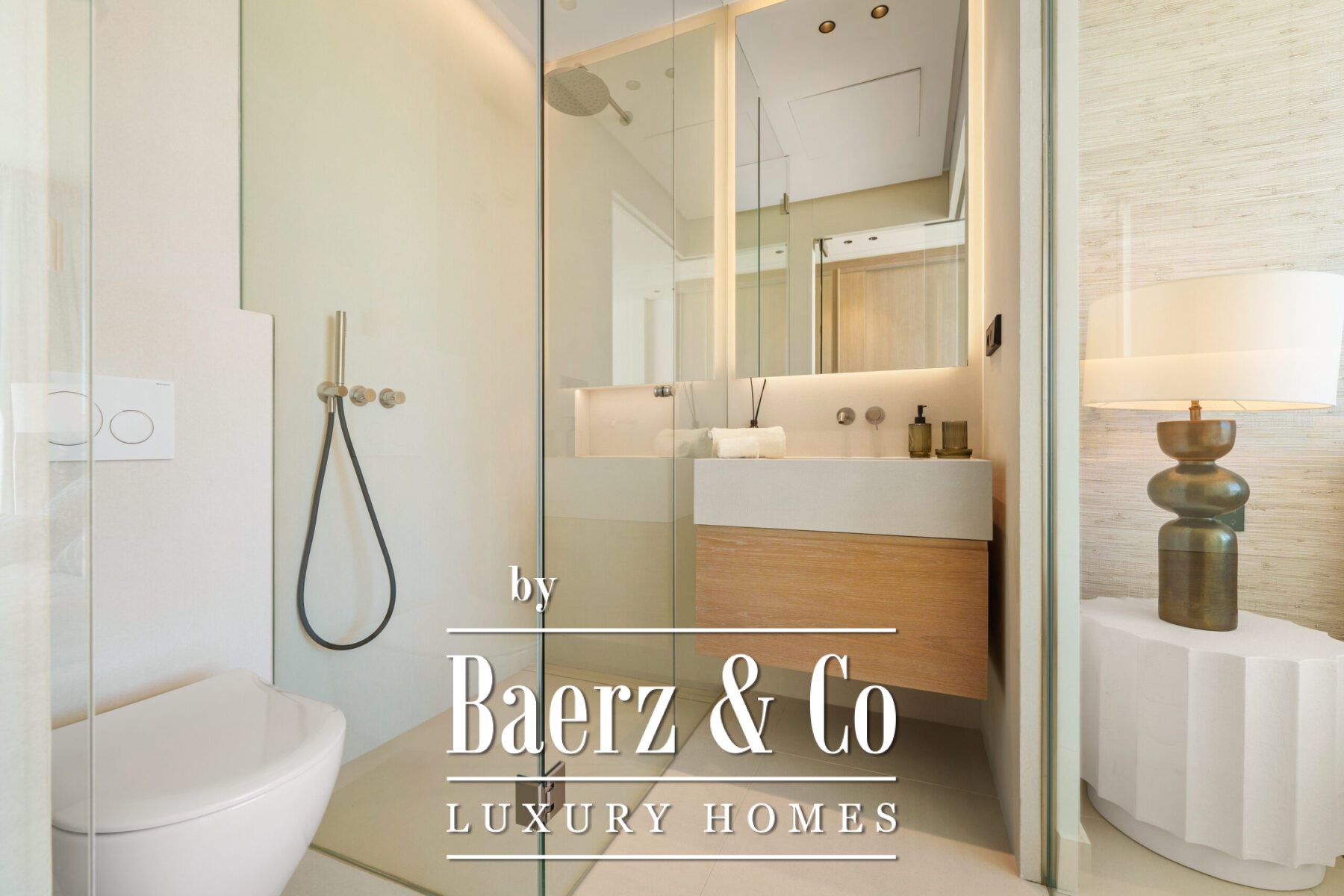 Vijf serene slaapkamers bieden direct toegang tot het terras en zijn ieder voorzien van een en-suite badkamer met marmeren afwerking, zwevende wastafels en vrijstaande baden. De mastersuite onderscheidt zich door zijn royale omvang en een zonnig privéterras, perfect als rustige schuilplaats. Op de benedenverdieping bevindt zich een volledig uitgeruste fitnessruimte, glazen sauna en stoombad voor een persoonlijke wellnessbeleving. Een beveiligde garage, luxe entree en uitzicht op de bergen geven verdere verfijning aan dit perceel van 612 m², waarmee het moderne comfort zich op steenworp afstand bevindt van Marbella’s golfbanen, stranden en lokale voorzieningen. Deze luxe villa te koop in Marbella vertegenwoordigt een verheven benadering van eigentijds mediterraan wonen.