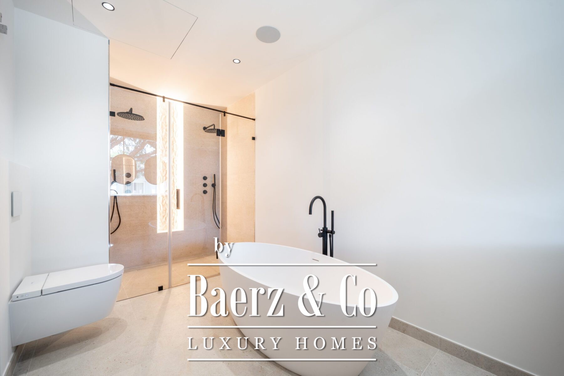 De begane grond biedt een lichte living en eetkamer met open indeling rondom een sfeervolle haard, direct verbonden met een Amerikaanse keuken voorzien van de nieuwste apparatuur. Een suite op deze verdieping biedt privacy voor gasten of als hoofdslaapkamer, aangevuld met een gastentoilet. Buiten vormen het verwarmde infinity-zwembad en een lounge met open haard en volledig uitgeruste zomerkeuken het intieme decor voor ontspannen avonden tussen weelderige mediterrane beplanting.