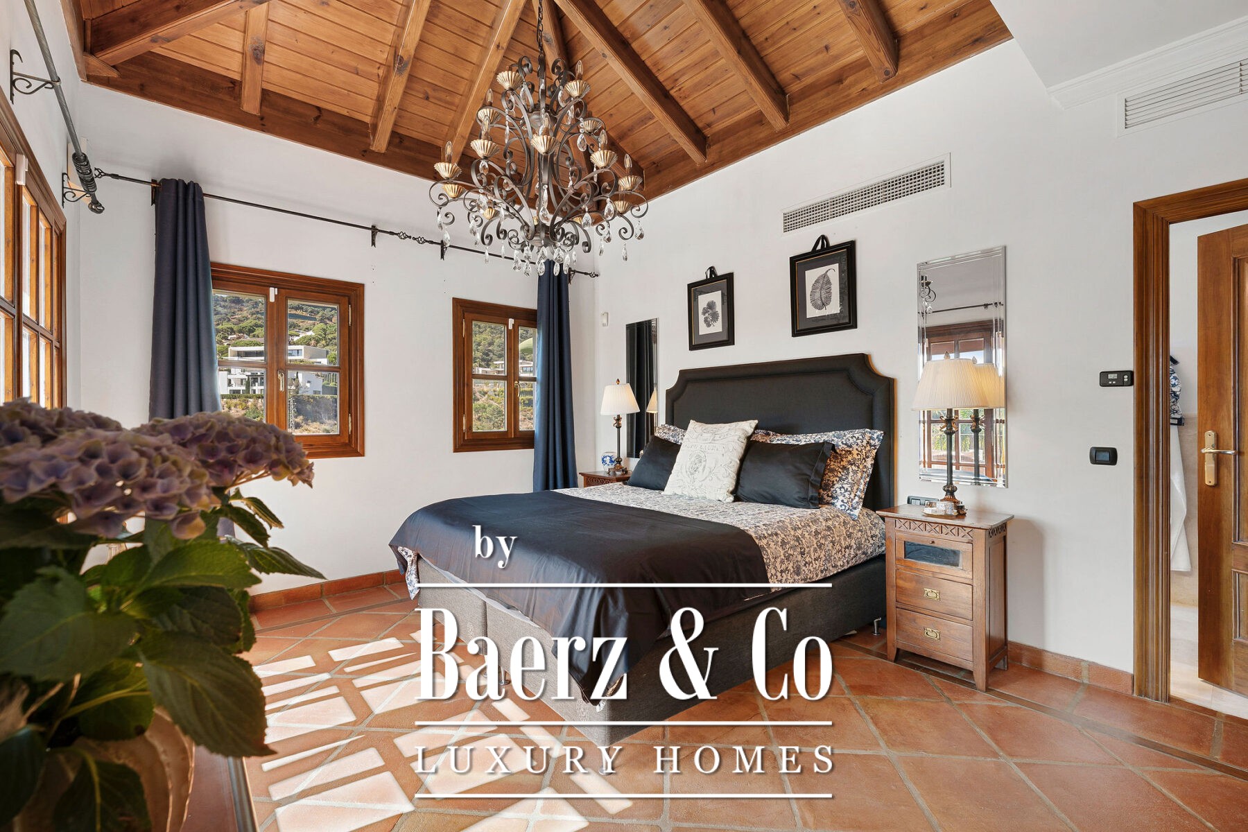 Het interieur ademt mediterrane elegantie, gekenmerkt door hoge plafonds, gracieuze bogen en open ruimtes die vloeiend overlopen van formeel naar informeel wonen. De vier slaapkamers en vier badkamers zijn zo gesitueerd dat privacy en comfort samengaan, terwijl de master suite beschikt over een inloopkast. Vloerverwarming, airconditioning voor zowel warm als koud, en een geïntegreerd surround sound systeem waarborgen gemoedsrust en welzijn. Daarnaast biedt de privé bioscoopruimte en de TV-lounge ultieme flexibiliteit voor ontspanning of gezelschap.