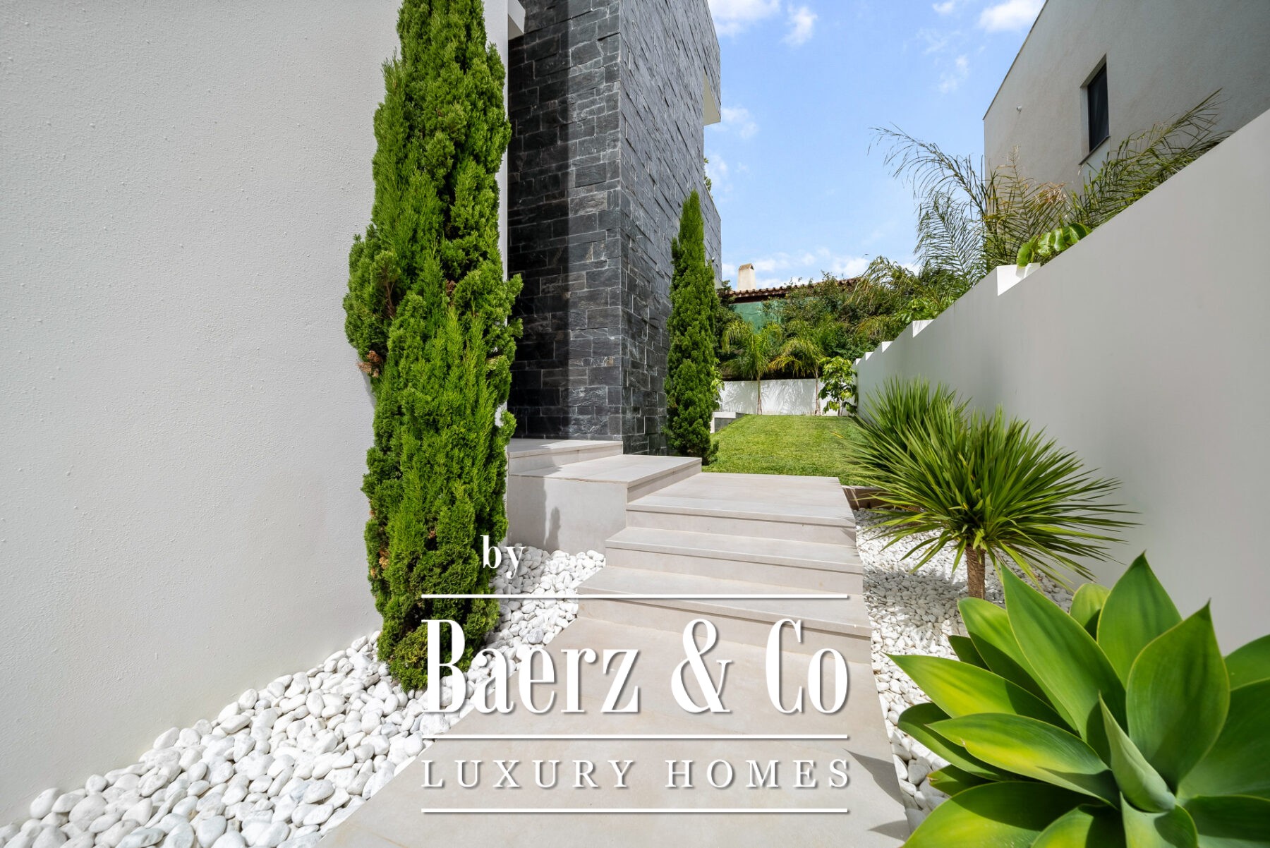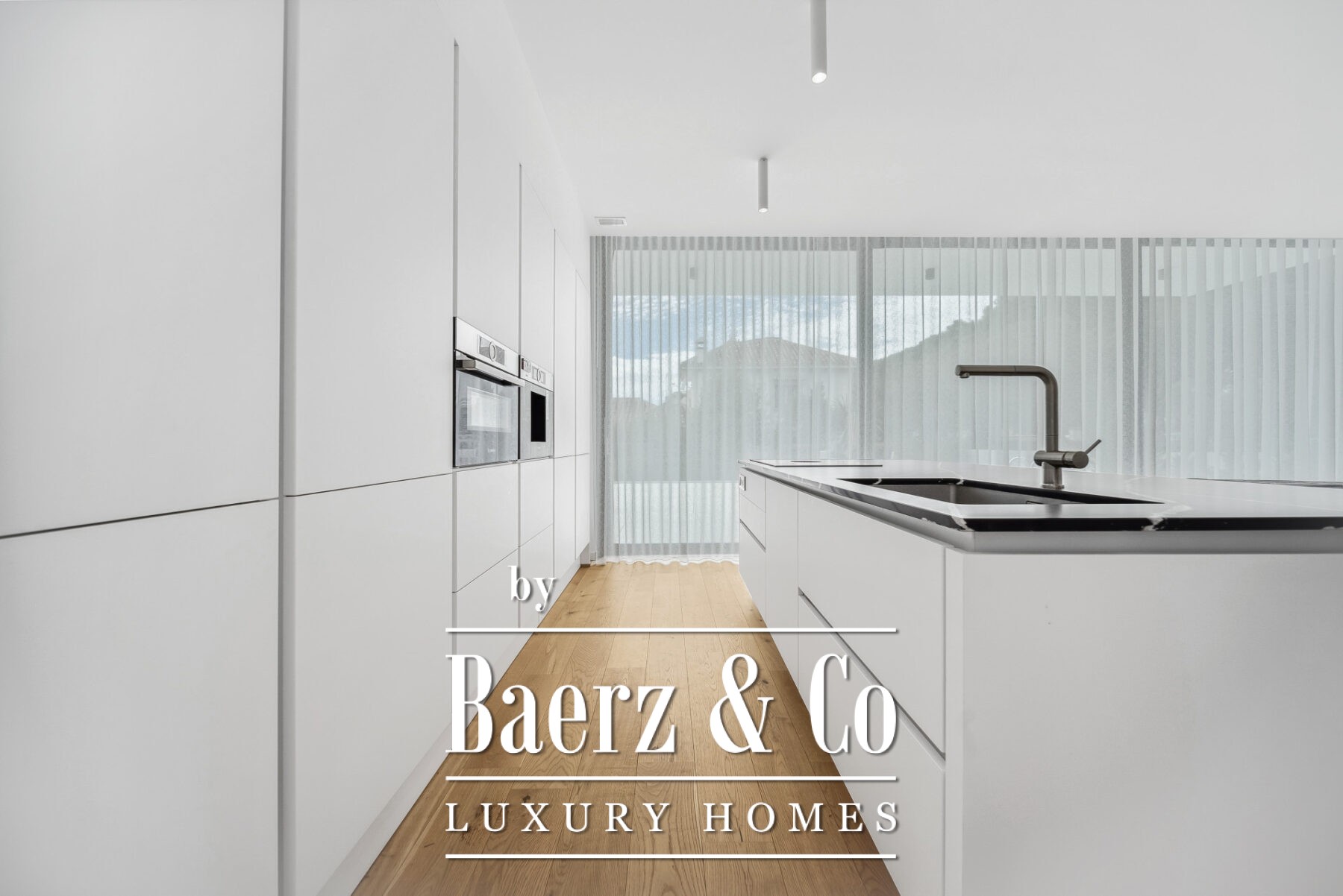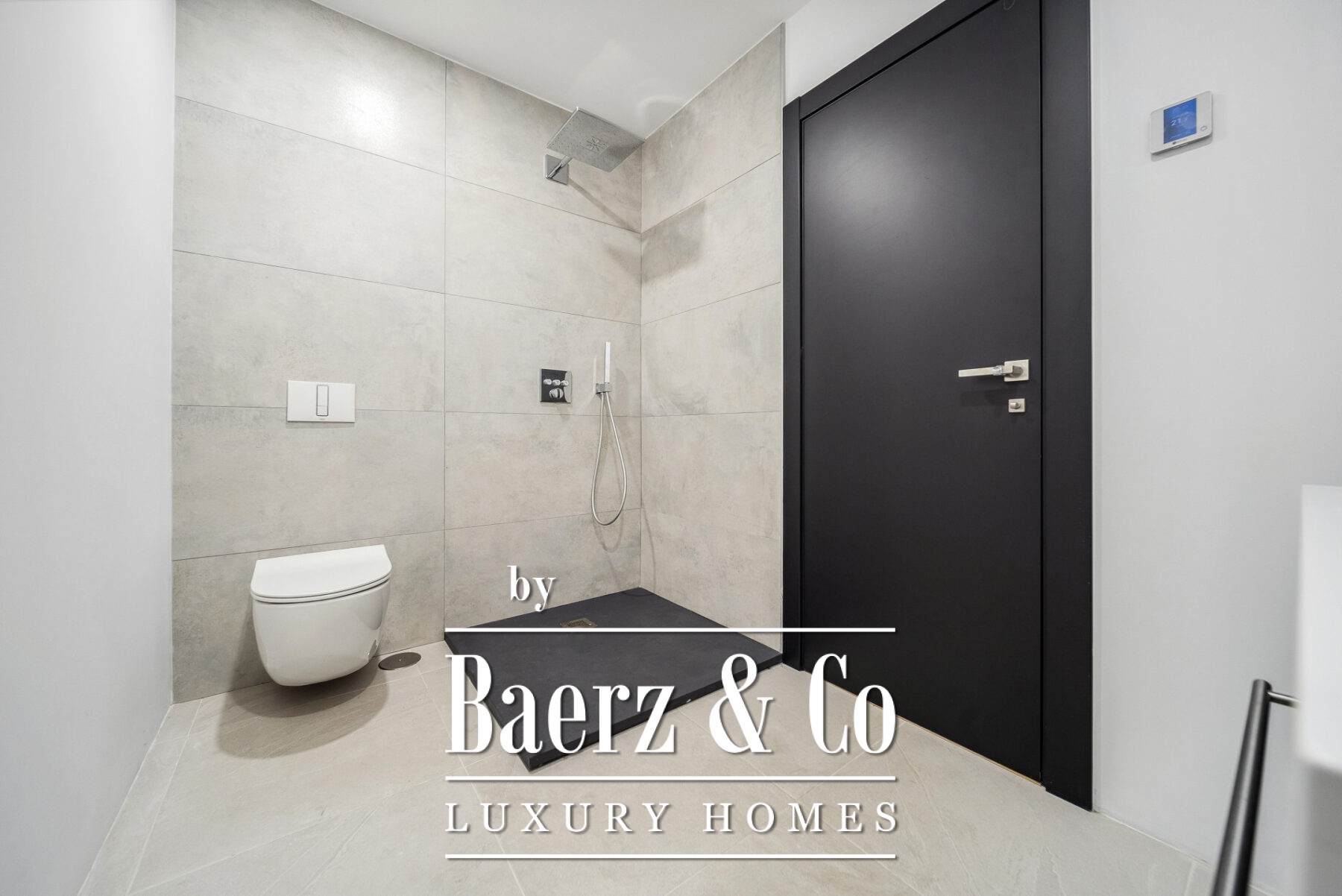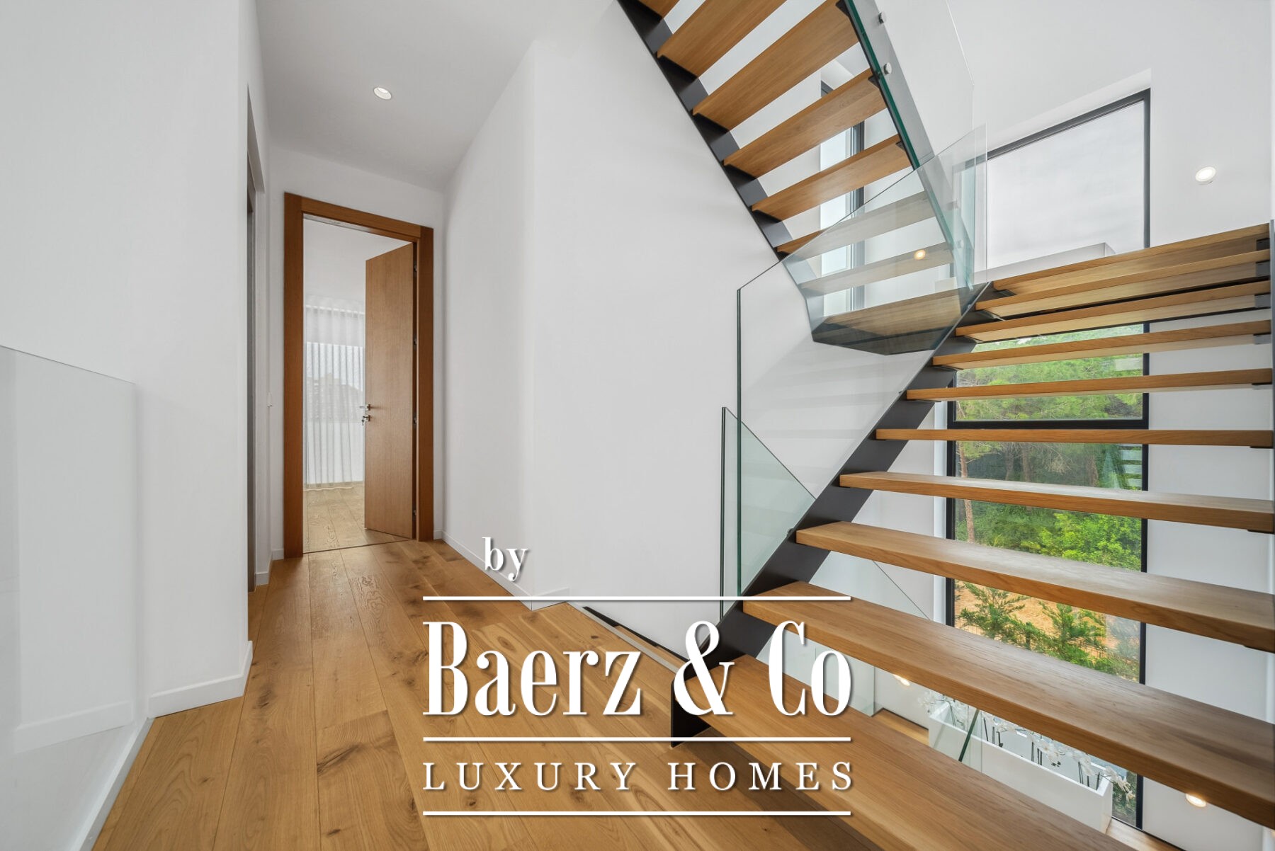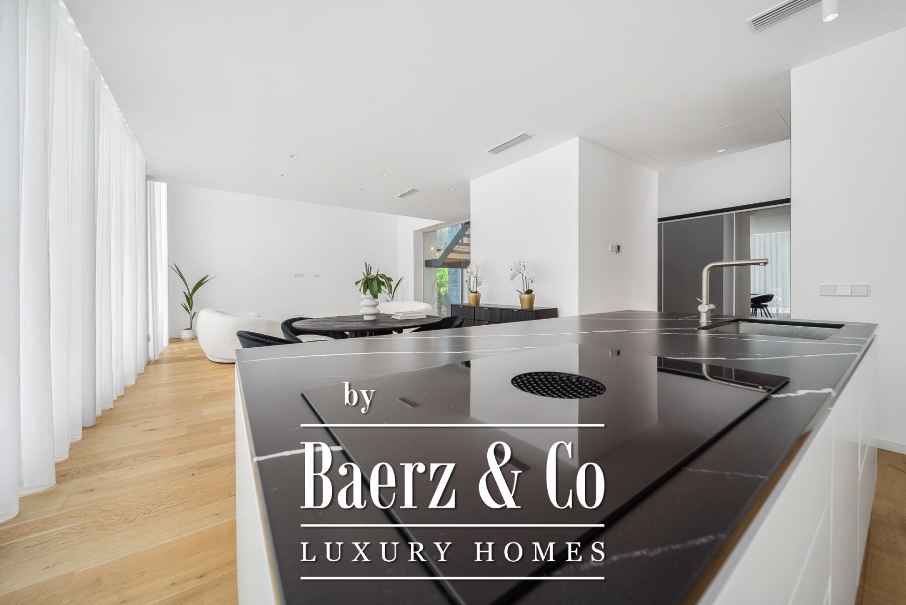 De hoofdverdieping is een open ruimte waar wonen en dineren naadloos samenvloeien met een op maat gemaakte keuken, uitgerust met hoogwaardige apparatuur voor bescheiden verfijning. De terrassen sluiten natuurlijk aan op het interieur en bieden diverse plekken voor dineren in de buitenlucht of rustgevende ontspanning. Het zwembad in de tuin vormt een sereen middelpunt, omringd door strakke, moderne details.