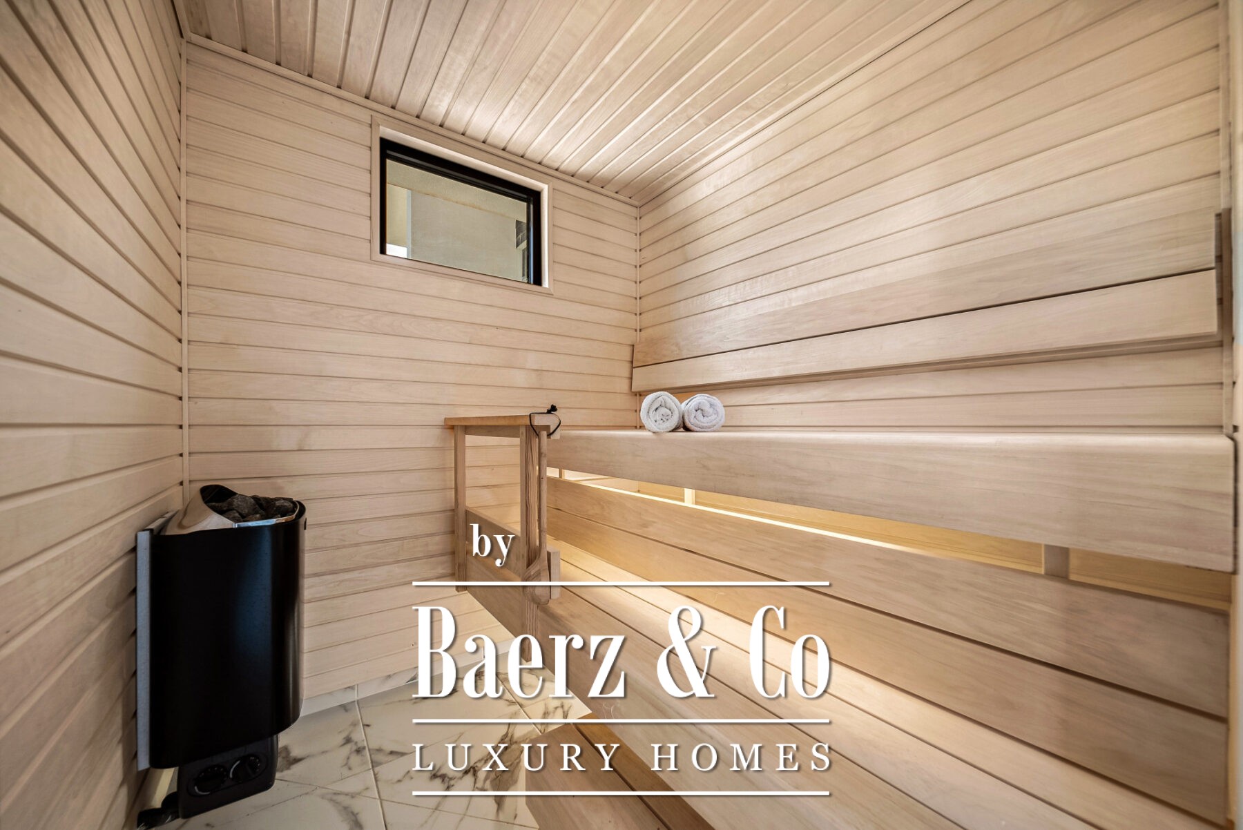 Voorzieningen zoals vloerverwarming, individueel regelbare klimaatbeheersing en een privé lift verbinden de drie verdiepingen. De bovenste etage is ingericht als solarium met panoramisch uitzicht over zee en de omliggende bergen. Er is een garage voor drie auto's en extra faciliteiten zoals een sauna en een speciale BBQ-plek.