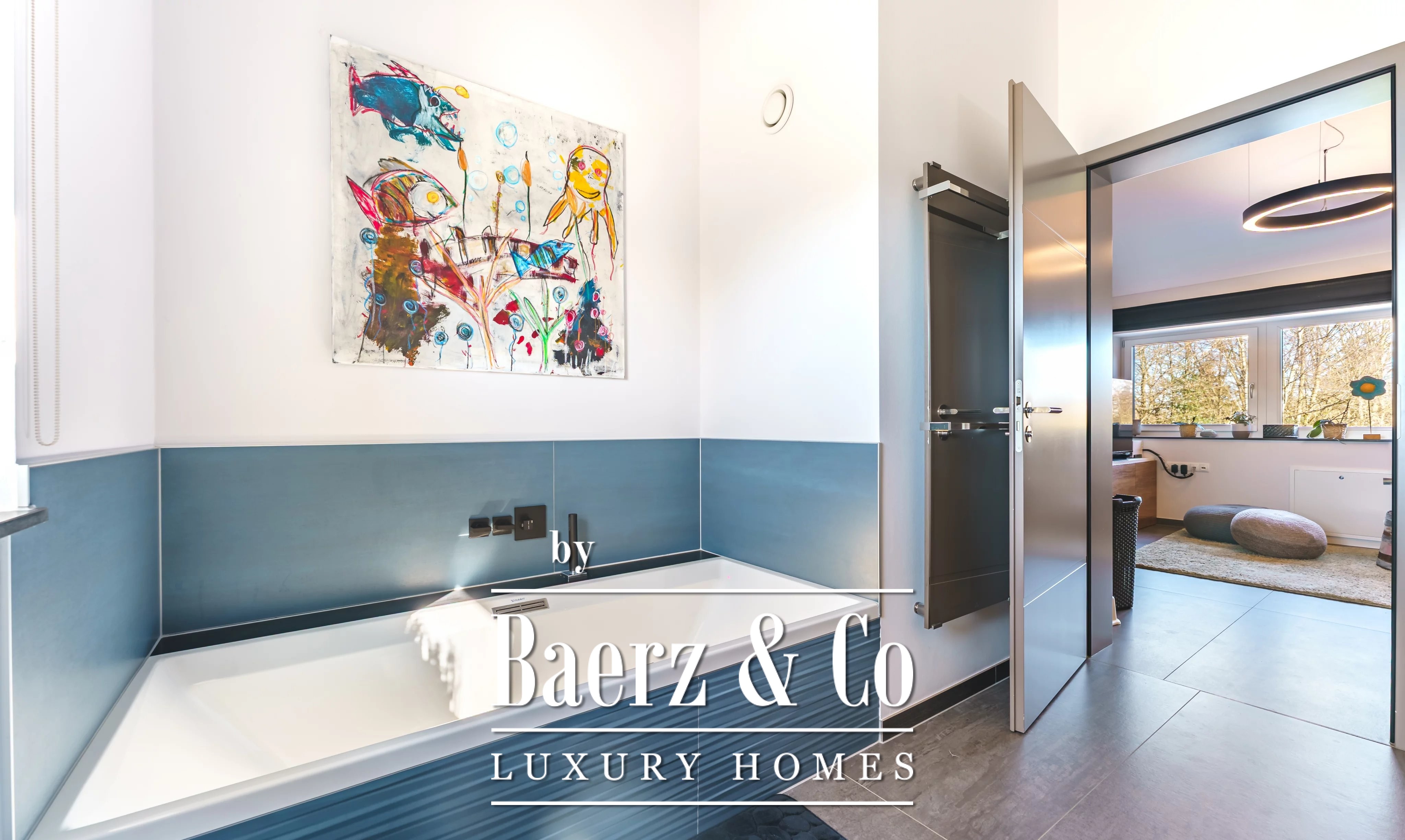 Deze onder architectuur gebouwde villa, gelegen op 15 hectare grond, wordt omringd door bomen en natuur en heeft grote ramen die uitkomen op een terras en een tuin.