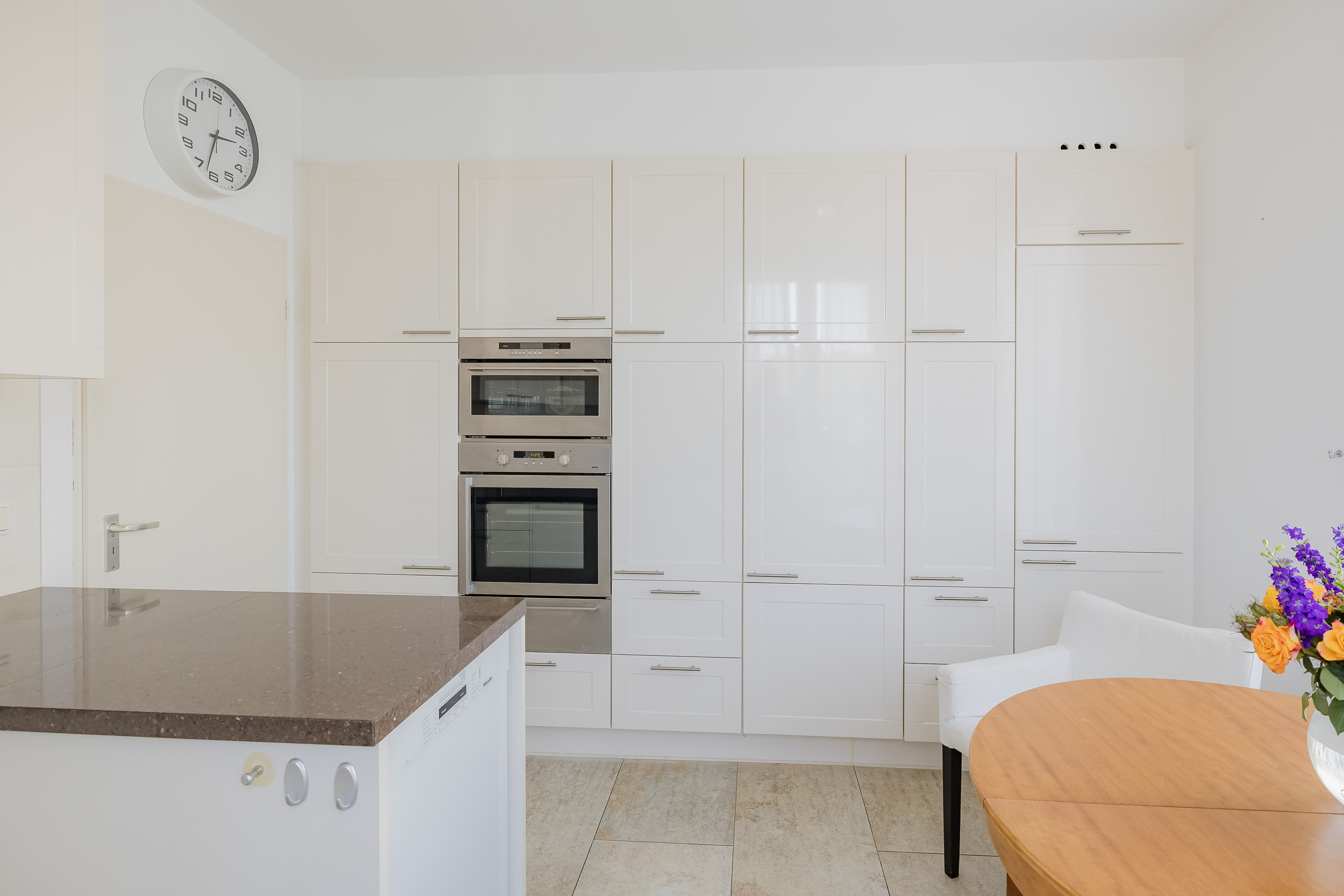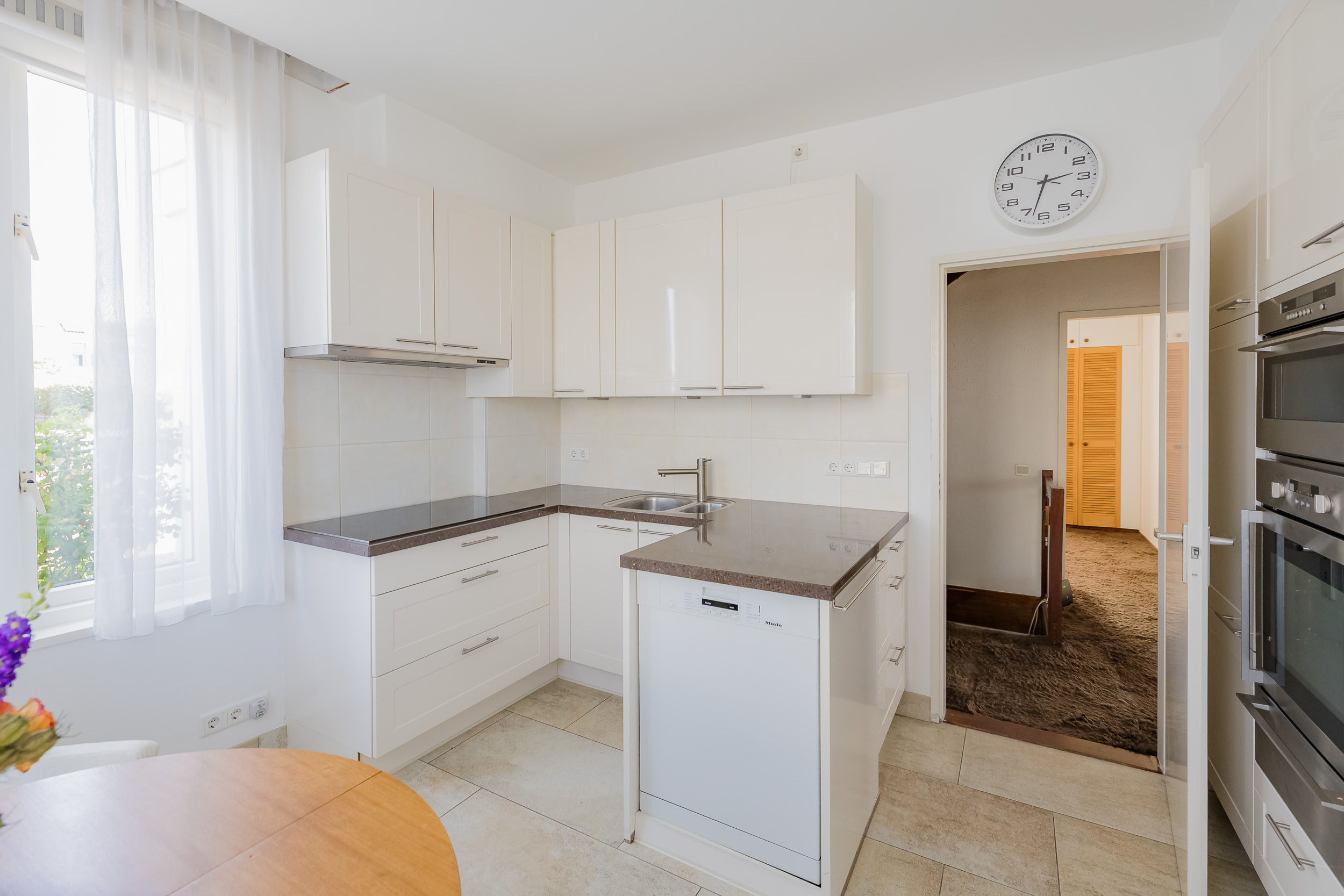 De villa beschikt bovendien over een dubbele garage met één elektrische deur, een bergvliering en een loopdeur naar de tuin. Voor de garage is er parkeergelegenheid voor 3 auto’s.