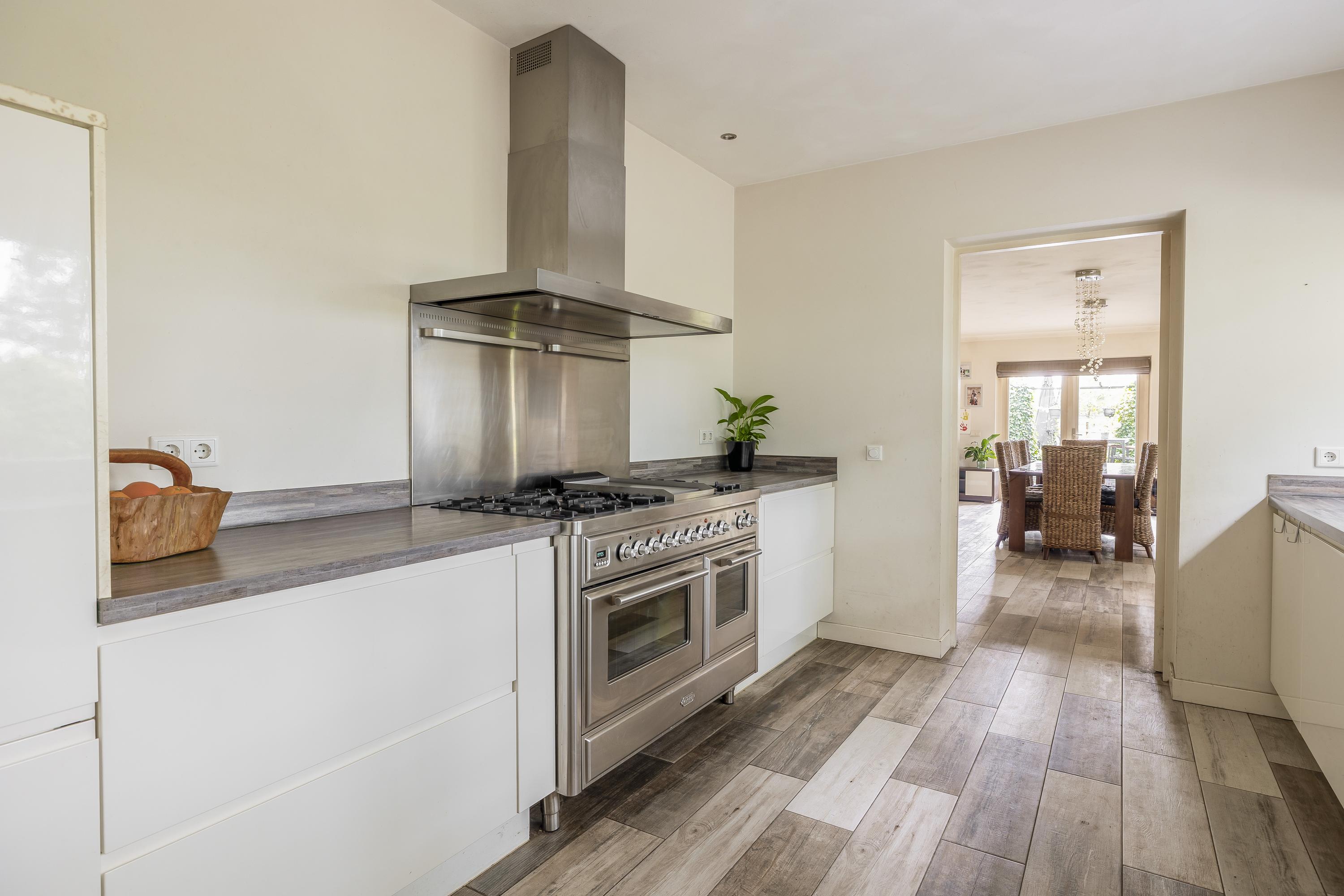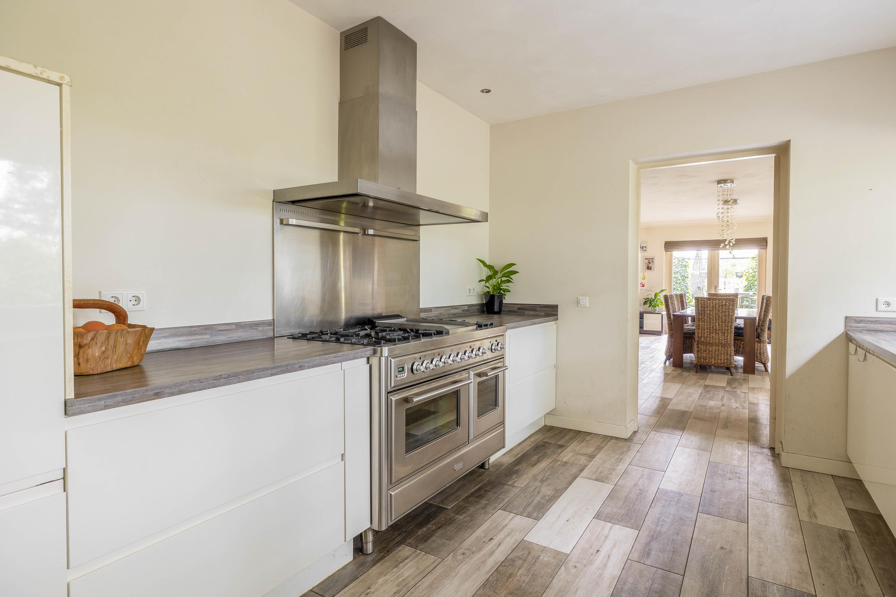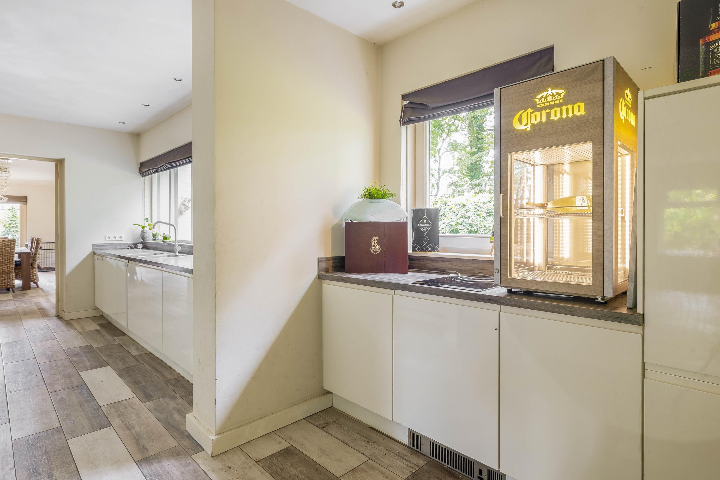 Middels een deur is er toegang tot de riante en luxe keukeninrichting welke geplaatst is in een dubbele wandopstelling in hoogglans wit. De keuken is voorzien van diverse onderkastjes, lades en inbouwapparatuur, waaronder een Boretti-fornuis met 6 pitten, een frytop en een dubbele oven, rvs afzuigkap (2024), vaatwasser (2021) en koelkast (2022). De keuken bestaat uit twee gedeelten. In het achterste gedeelte bevindt zich een derde wandopstelling waar een extra koelkast (2022) en een inductiekookplaat zijn geplaatst. Vanuit dit gedeelte is er toegang tot de bijkeuken en de multifunctionele ruimte.