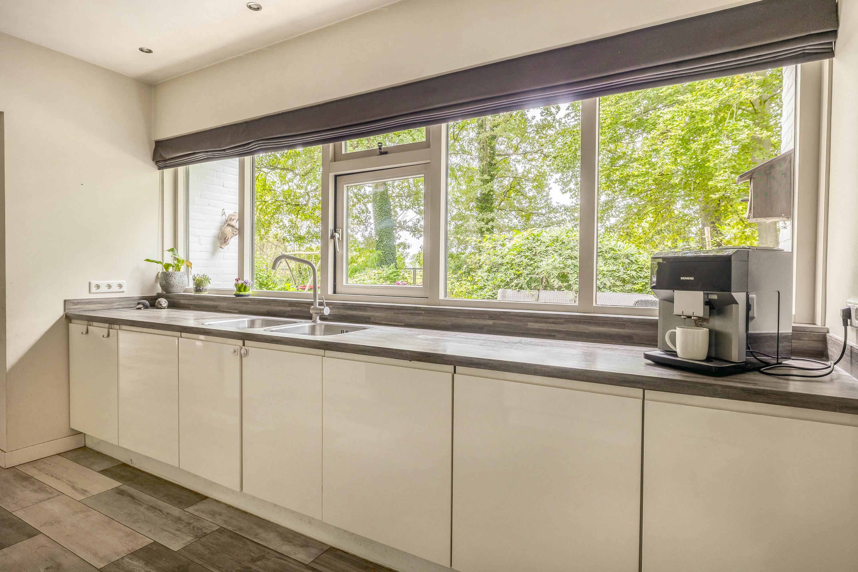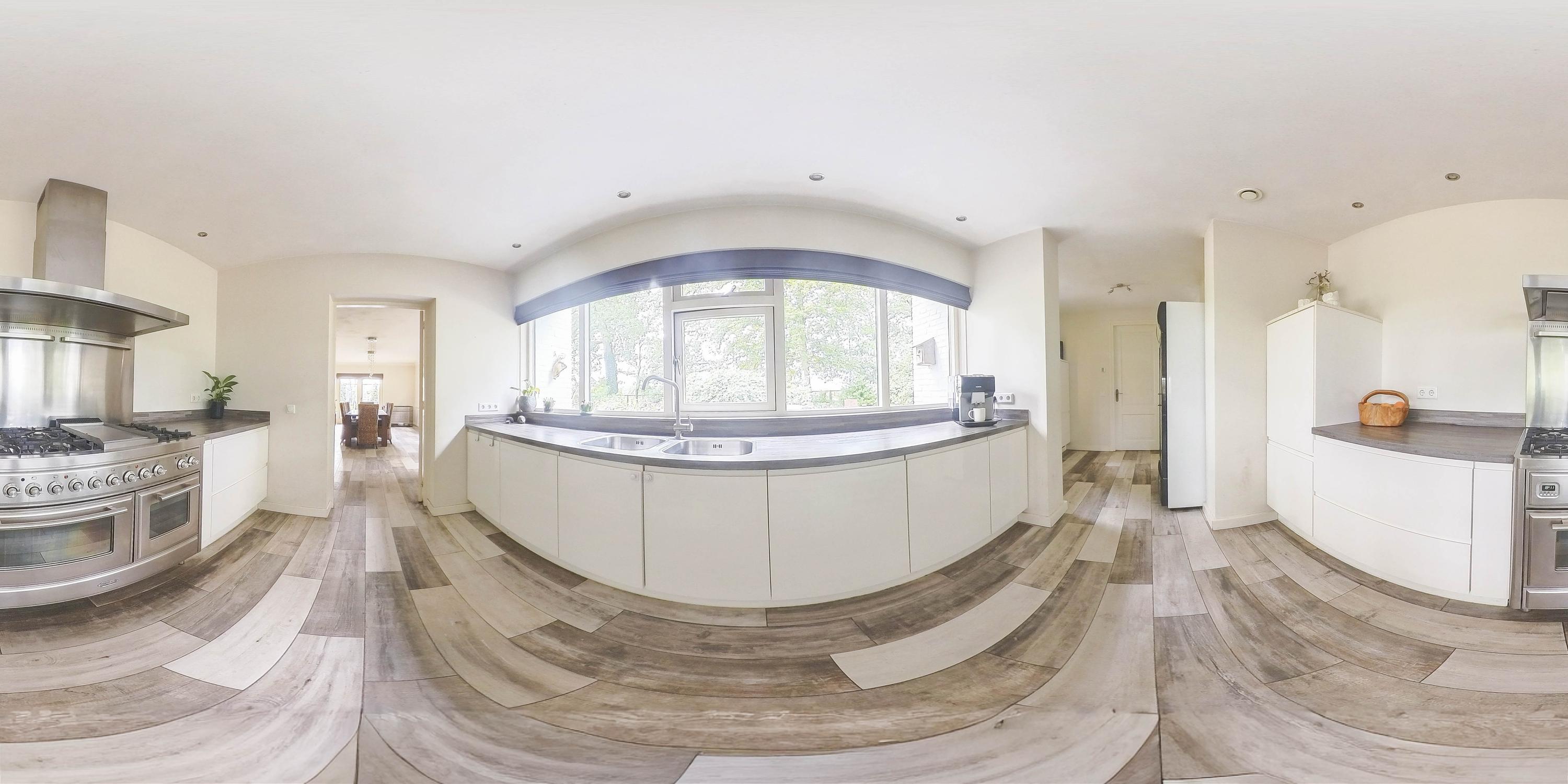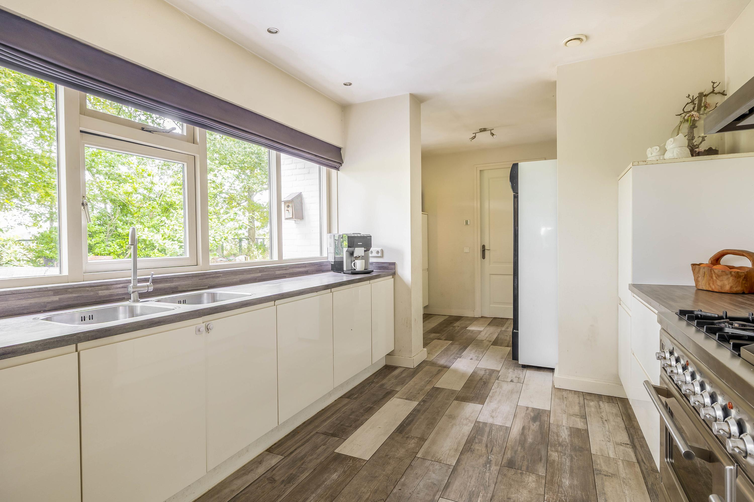 Middels een deur is er toegang tot de riante en luxe keukeninrichting welke geplaatst is in een dubbele wandopstelling in hoogglans wit. De keuken is voorzien van diverse onderkastjes, lades en inbouwapparatuur, waaronder een Boretti-fornuis met 6 pitten, een frytop en een dubbele oven, rvs afzuigkap (2024), vaatwasser (2021) en koelkast (2022). De keuken bestaat uit twee gedeelten. In het achterste gedeelte bevindt zich een derde wandopstelling waar een extra koelkast (2022) en een inductiekookplaat zijn geplaatst. Vanuit dit gedeelte is er toegang tot de bijkeuken en de multifunctionele ruimte.