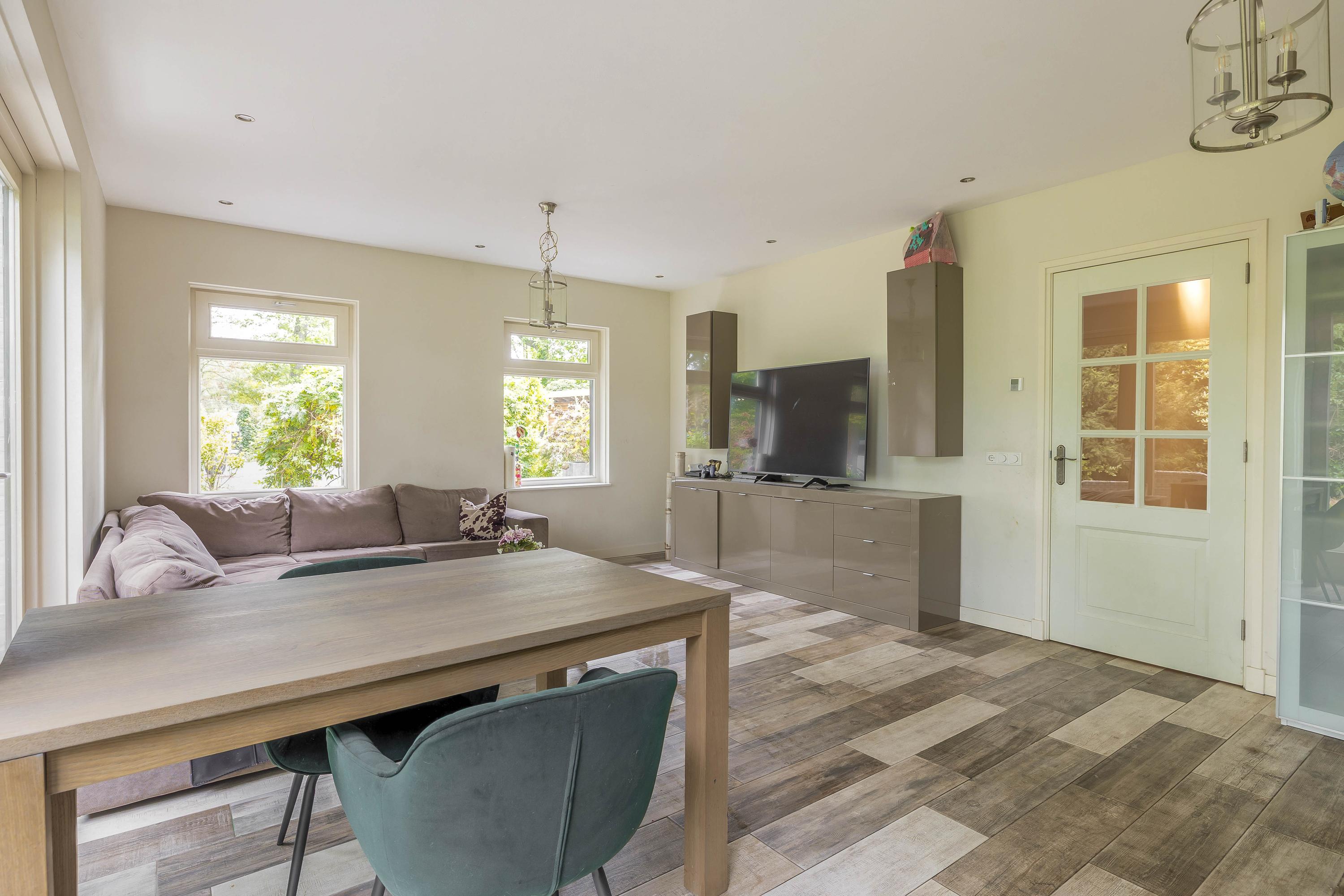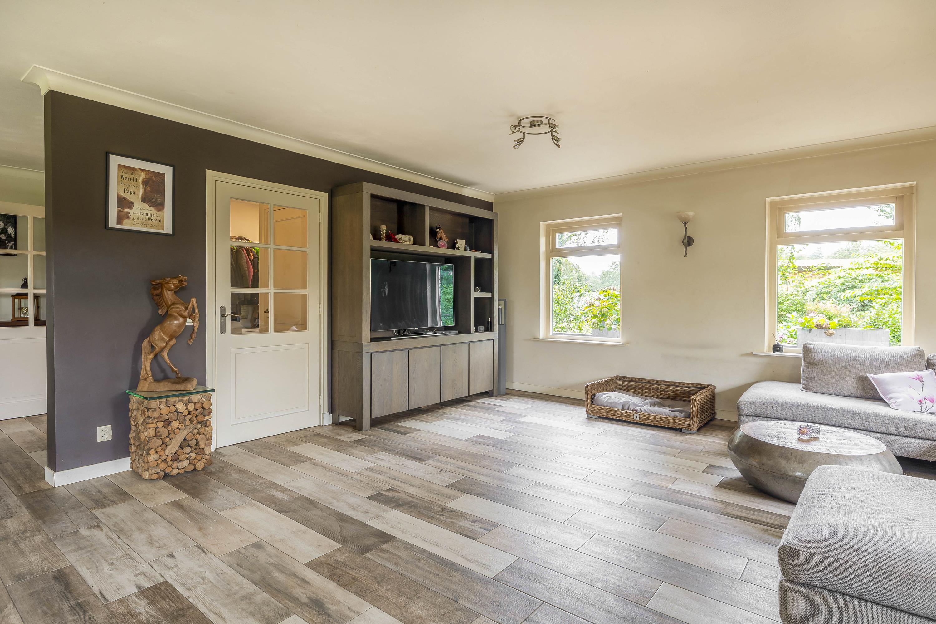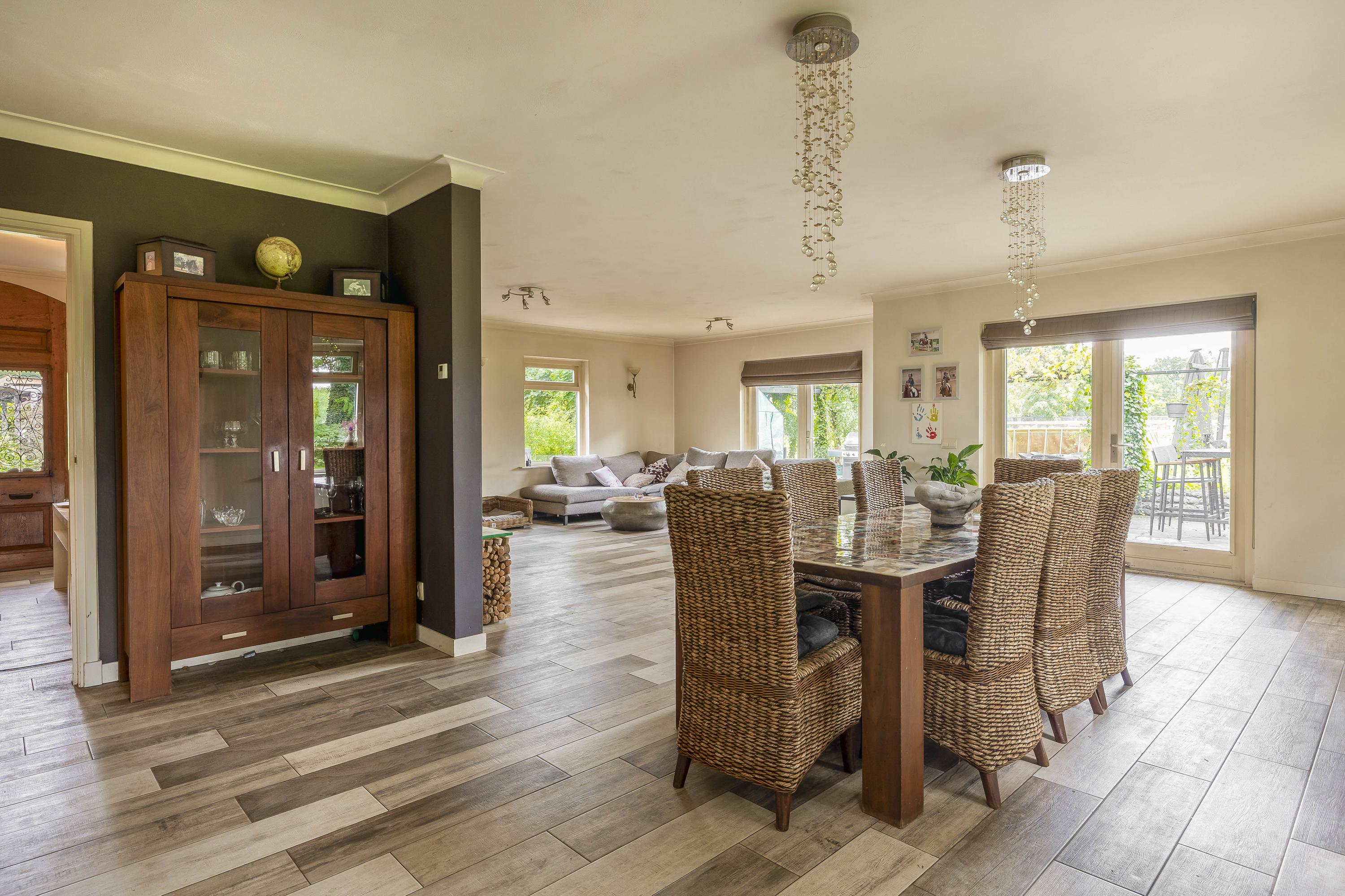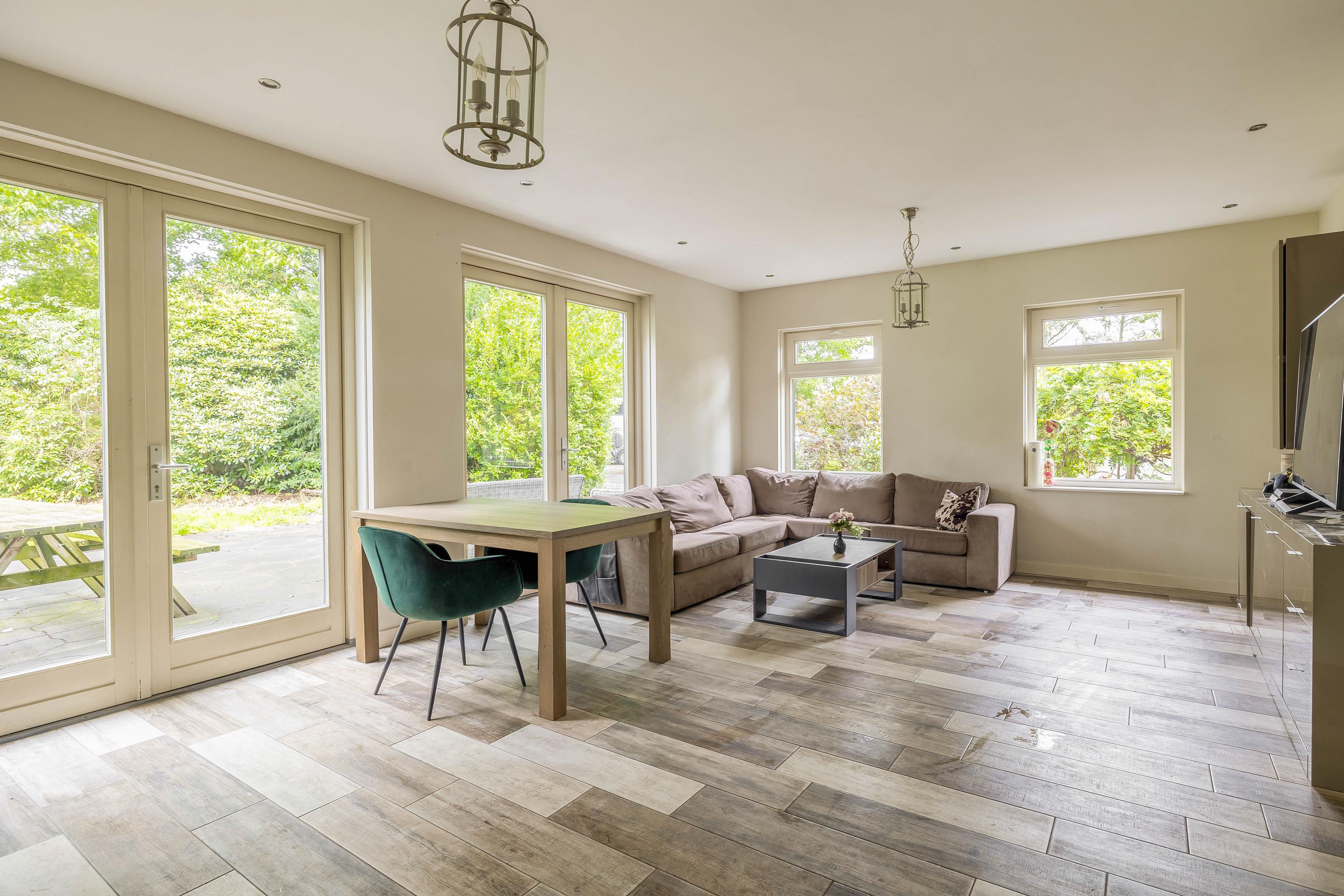 De living is ruim opgezet en beschikt over grote raampartijen. Hierdoor valt er veel natuurlijk licht binnen en is er een prachtig uitzicht op de tuin. De wanden en het plafond zijn afgewerkt met strak stucwerk en sierlijsten. Via een tuindeur en openslaande deuren is er toegang tot de tuin.