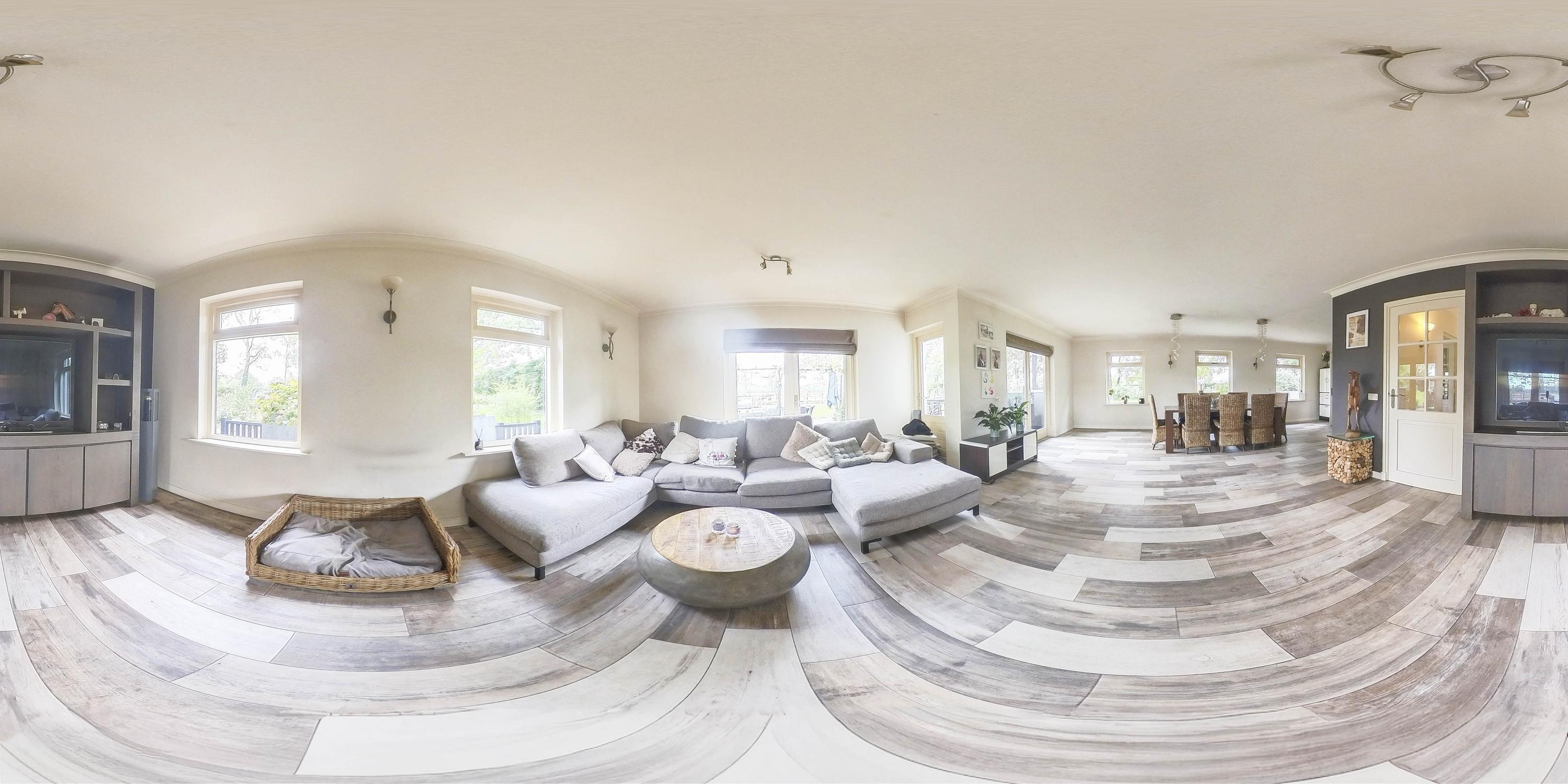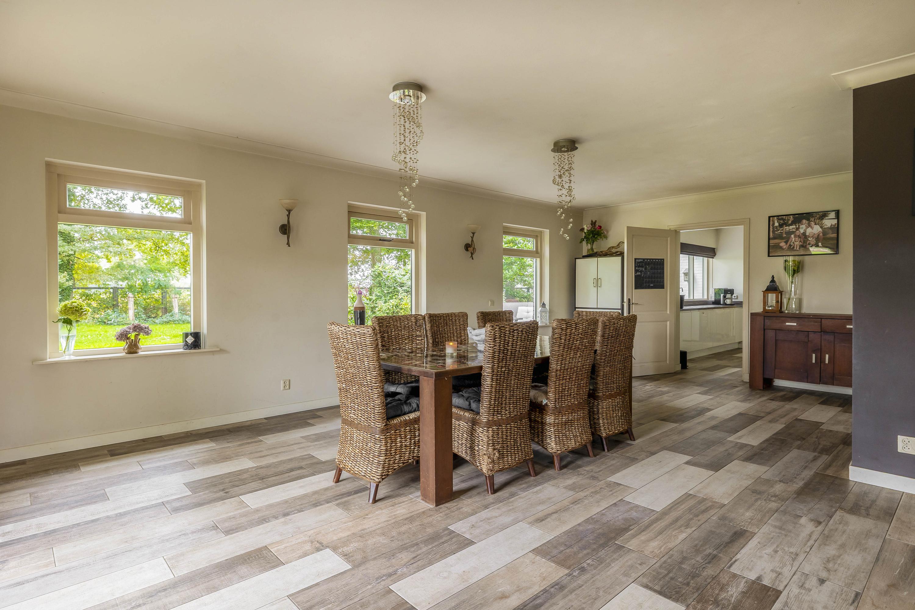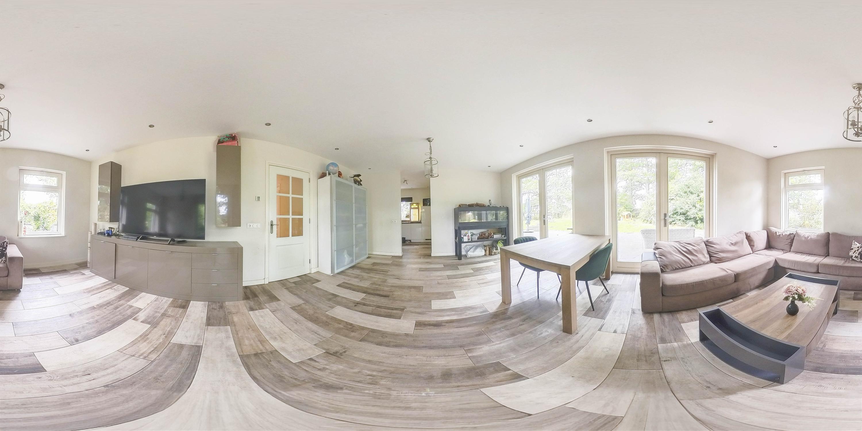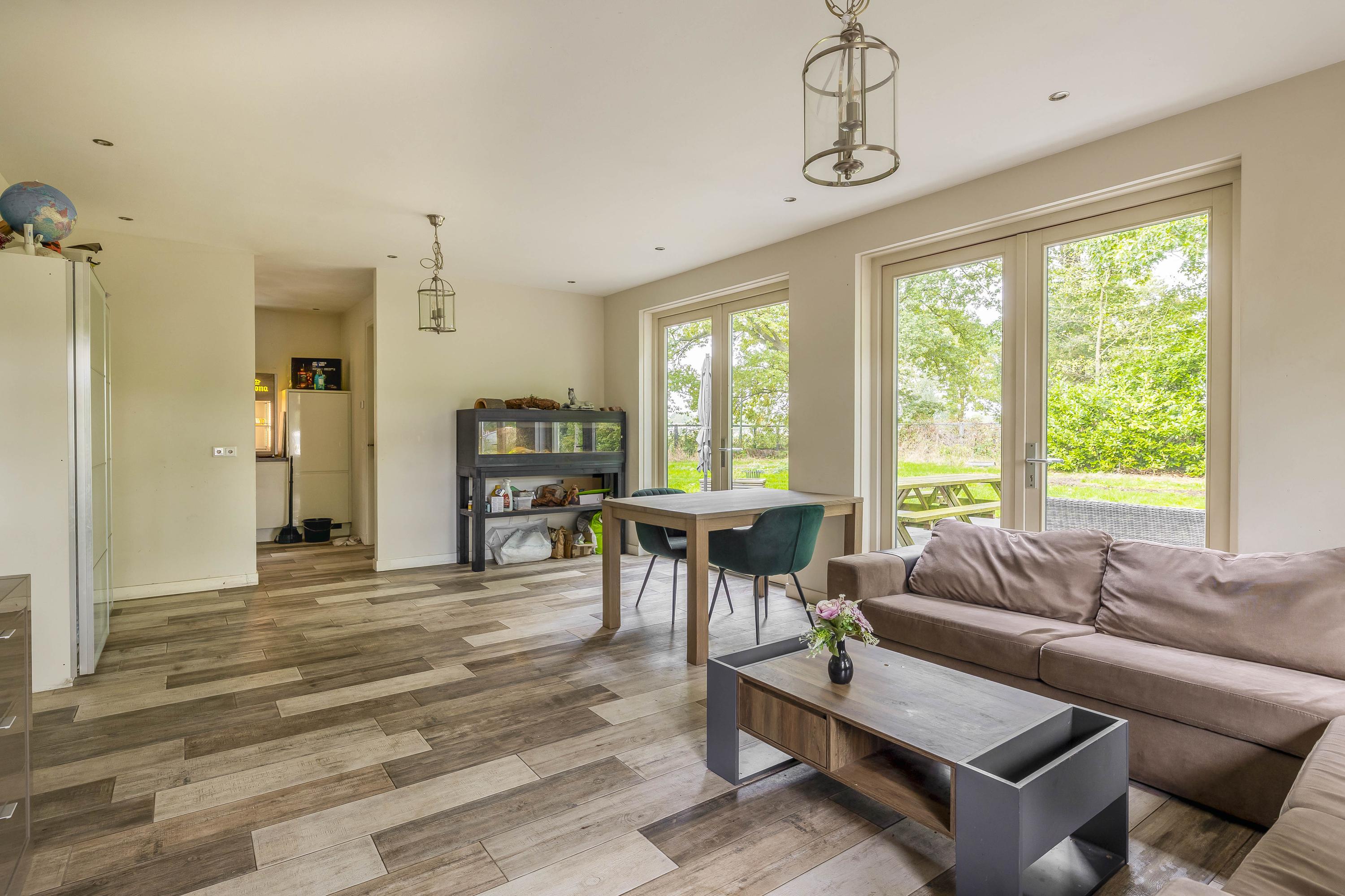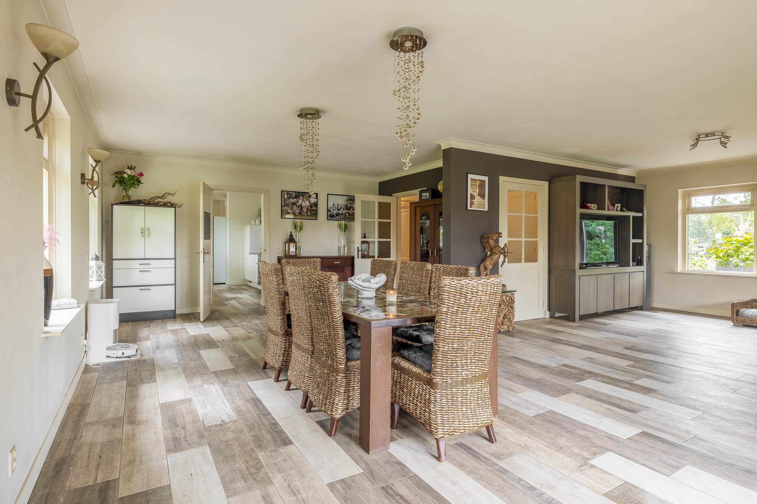De living is ruim opgezet en beschikt over grote raampartijen. Hierdoor valt er veel natuurlijk licht binnen en is er een prachtig uitzicht op de tuin. De wanden en het plafond zijn afgewerkt met strak stucwerk en sierlijsten. Via een tuindeur en openslaande deuren is er toegang tot de tuin.