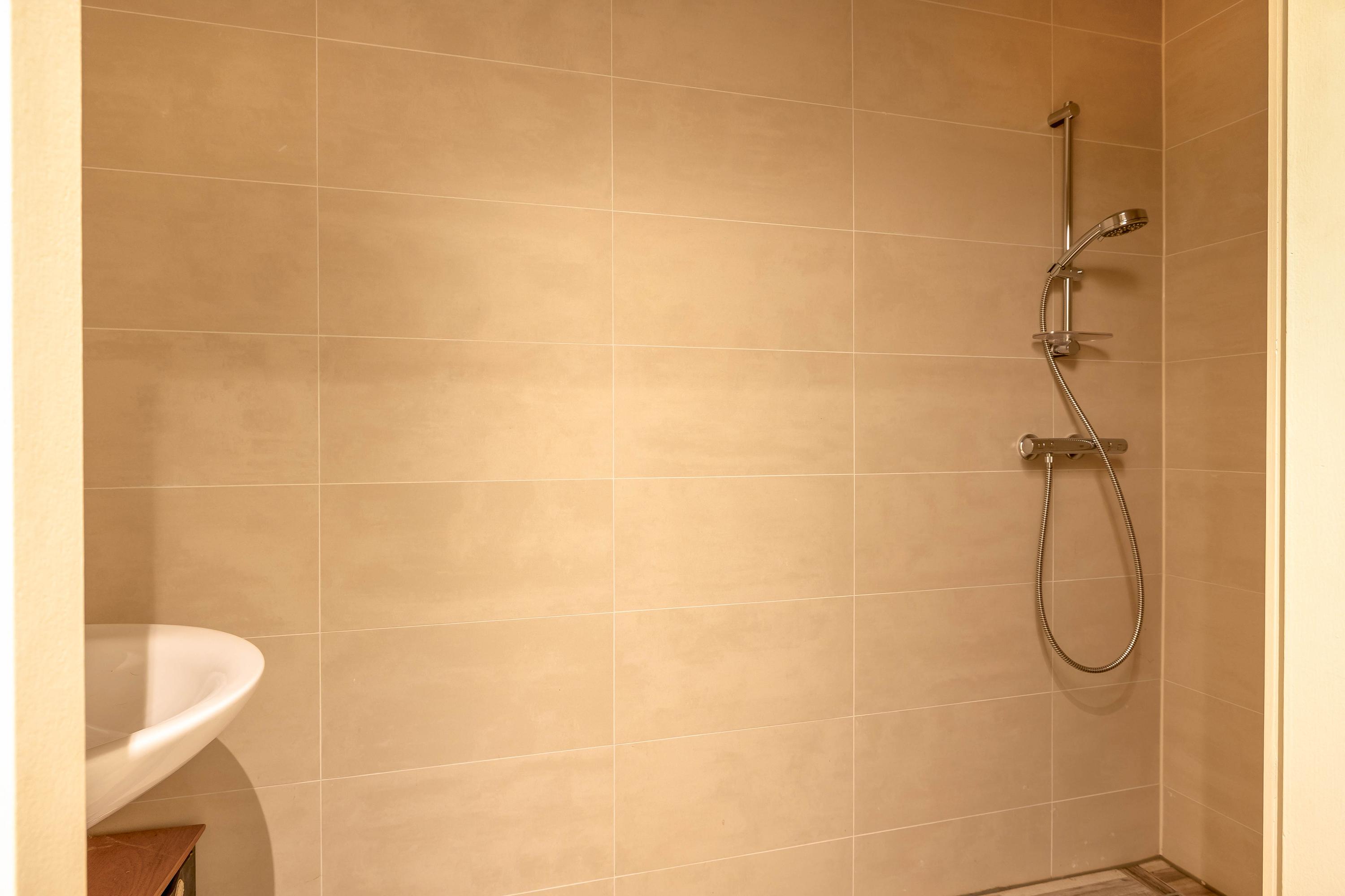 De badkamer is geheel betegeld en voorzien van een douche en een wastafel.