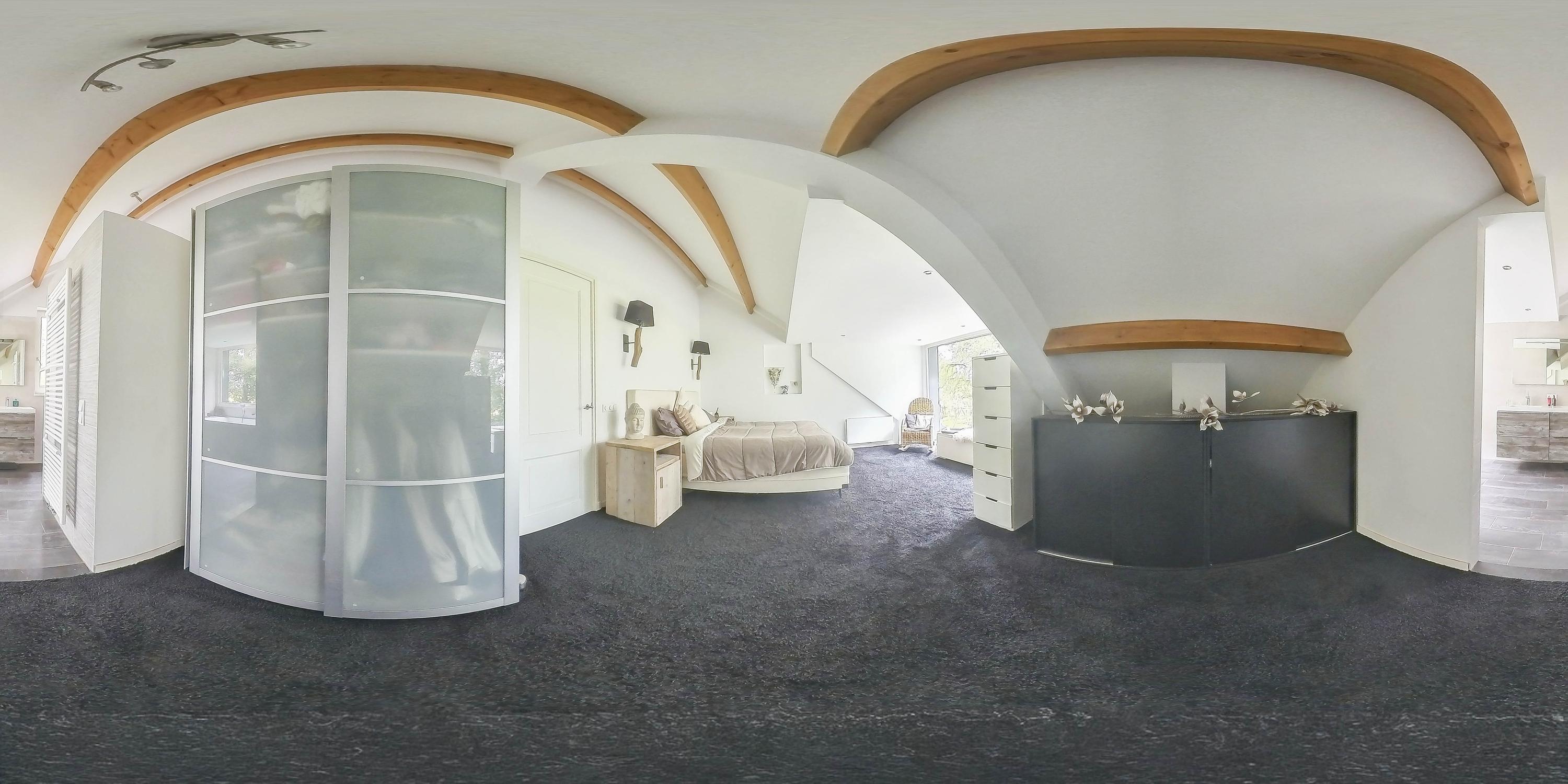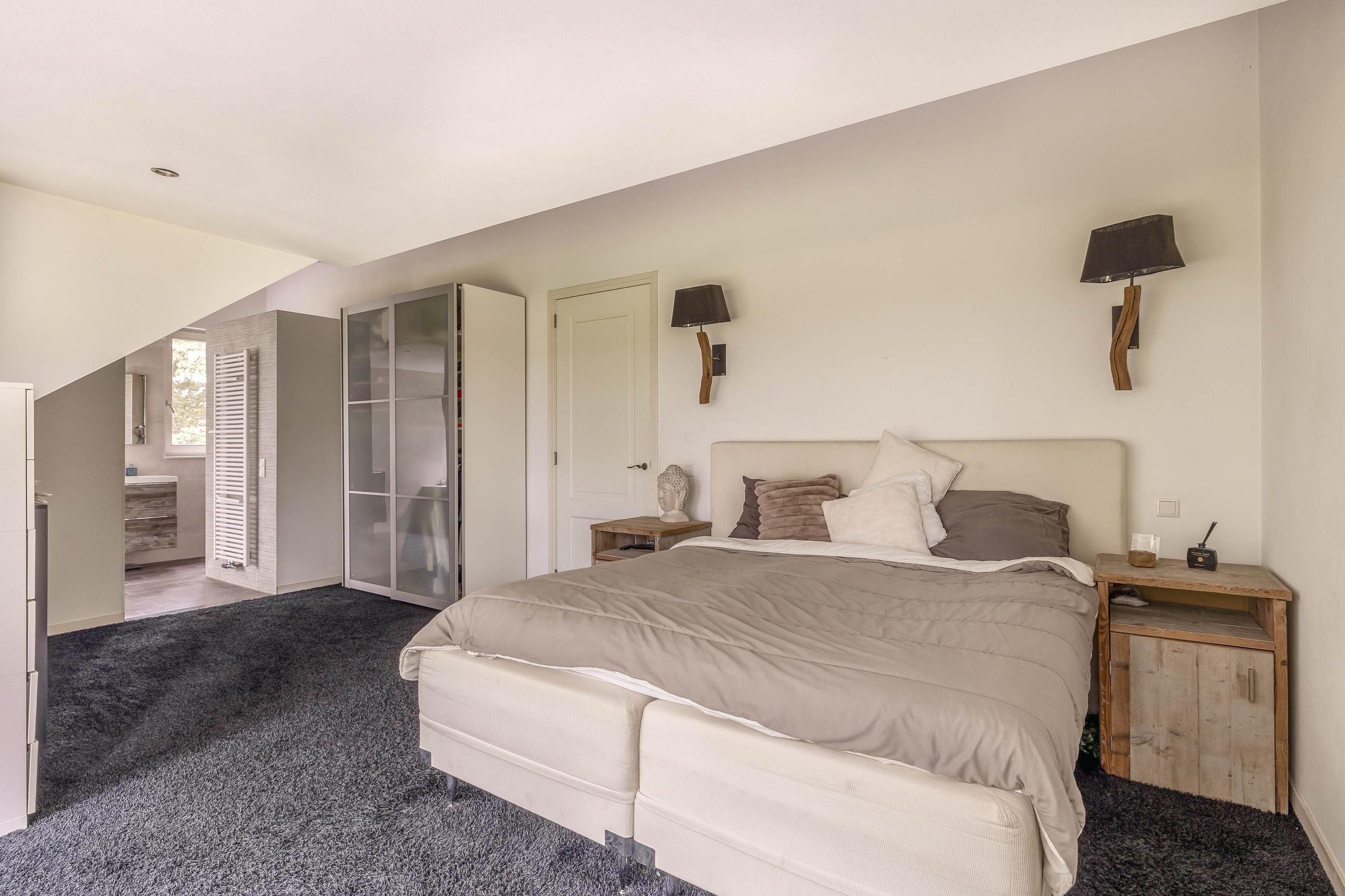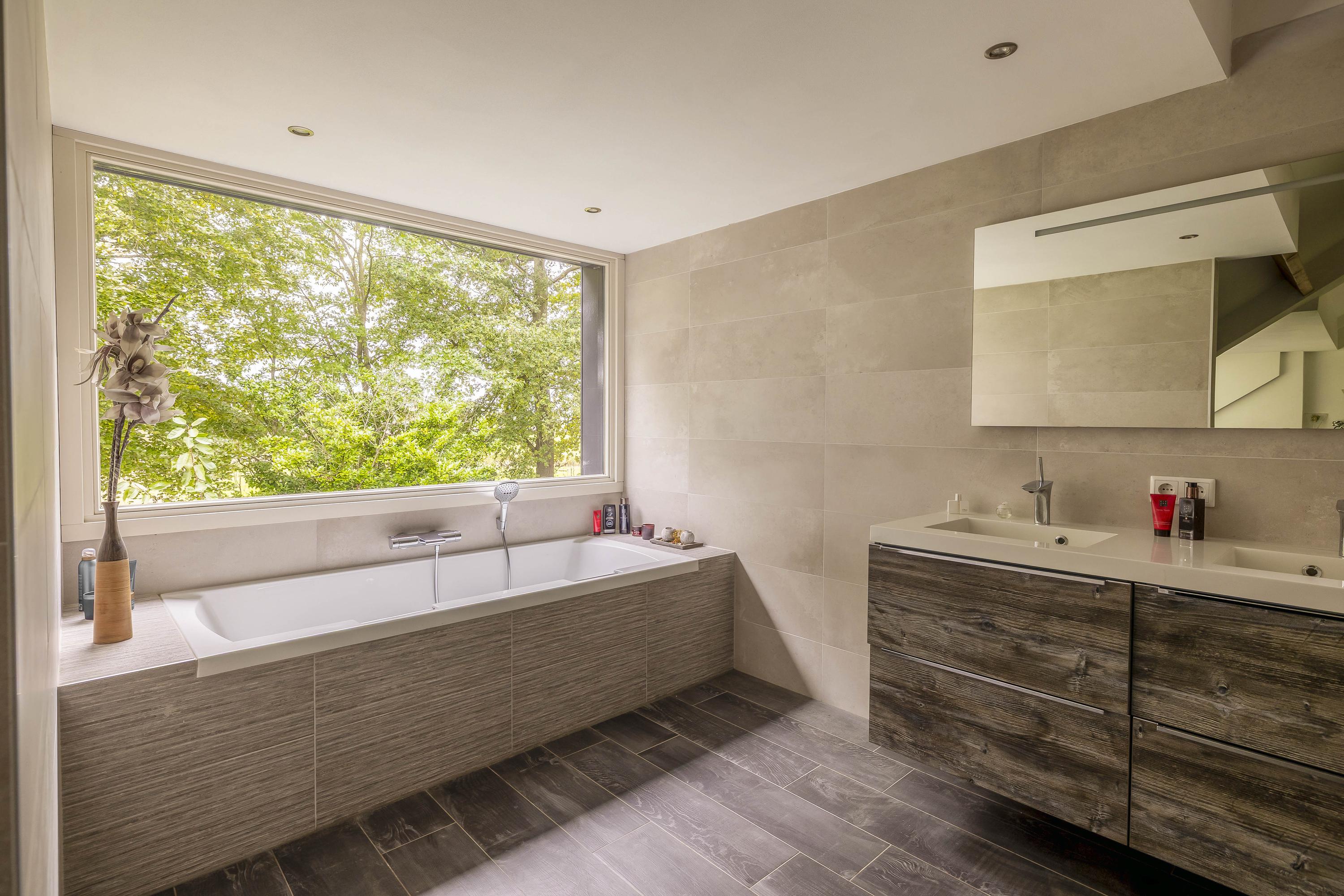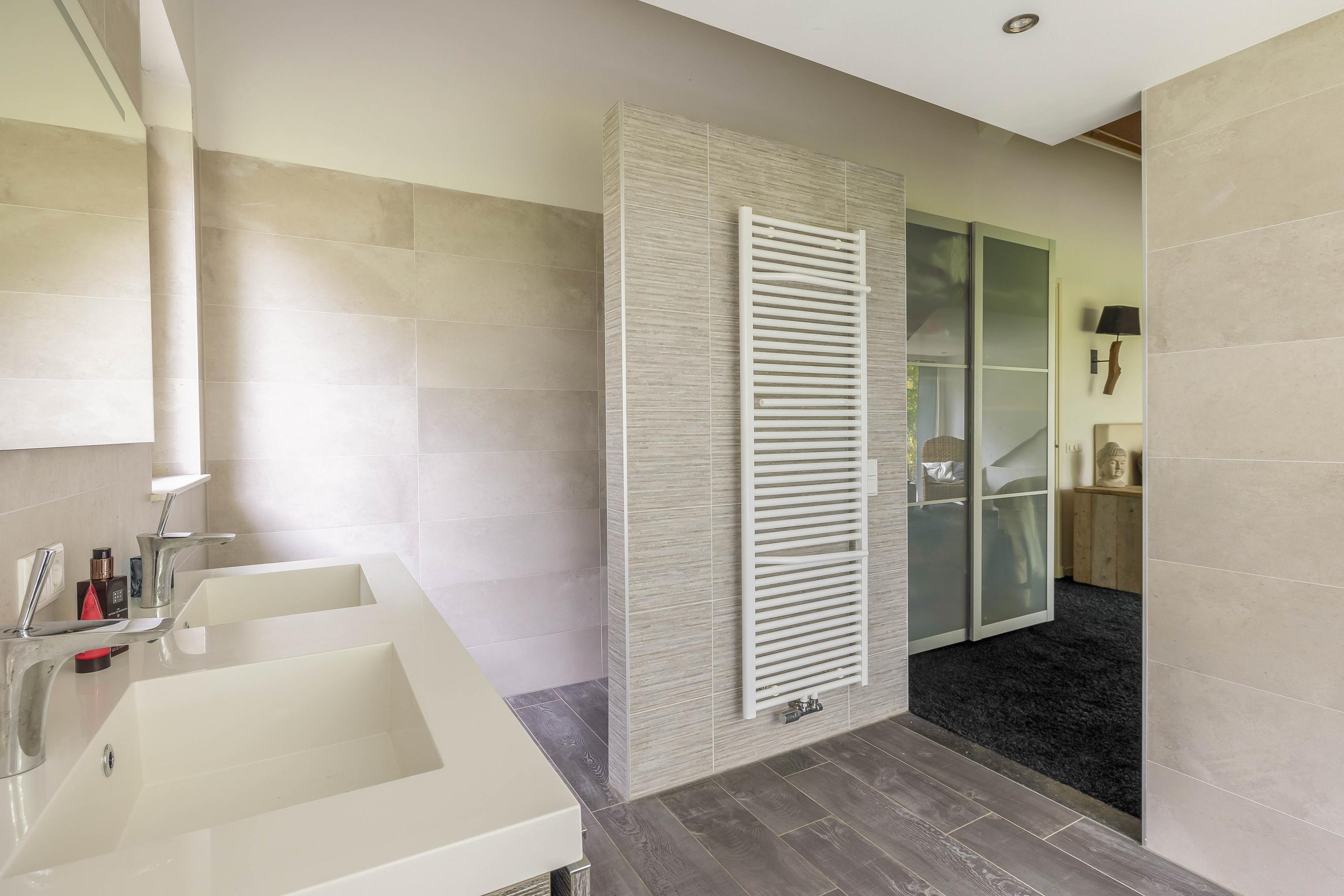 De derde slaapkamer, de ouderslaapkamer, ligt eveneens aan de achterzijde. Wat deze kamer uniek maakt, is de grote raampartij met uitzicht op de bosrijke tuin. Direct naast deze slaapkamer bevindt zich de en suite badkamer. Deze badkamer is geheel betegeld in een lichte, moderne kleur. Er is een inloopdouche met hand- en regendouche, een dubbele wastafel met meubel en een ligbad met uitzicht op de tuin. Ook is er een mechanisch afzuigsysteem en een raampartij voor ventilatie, en is er vloerverwarming aanwezig.