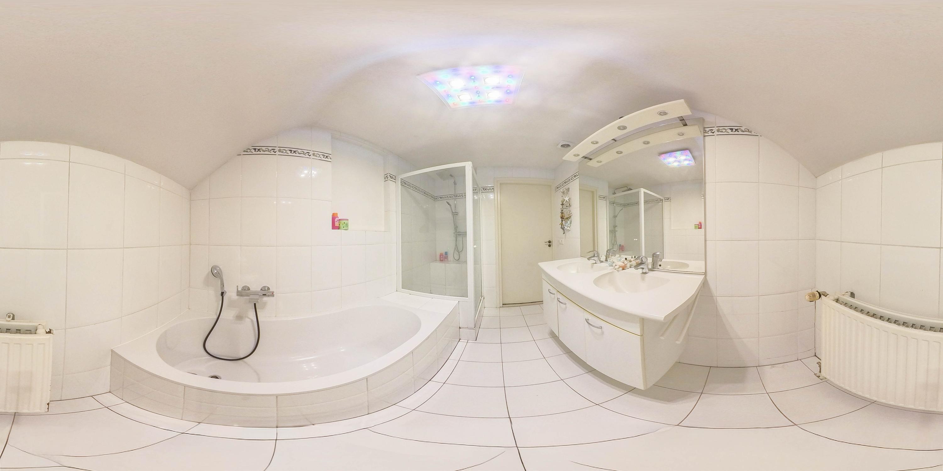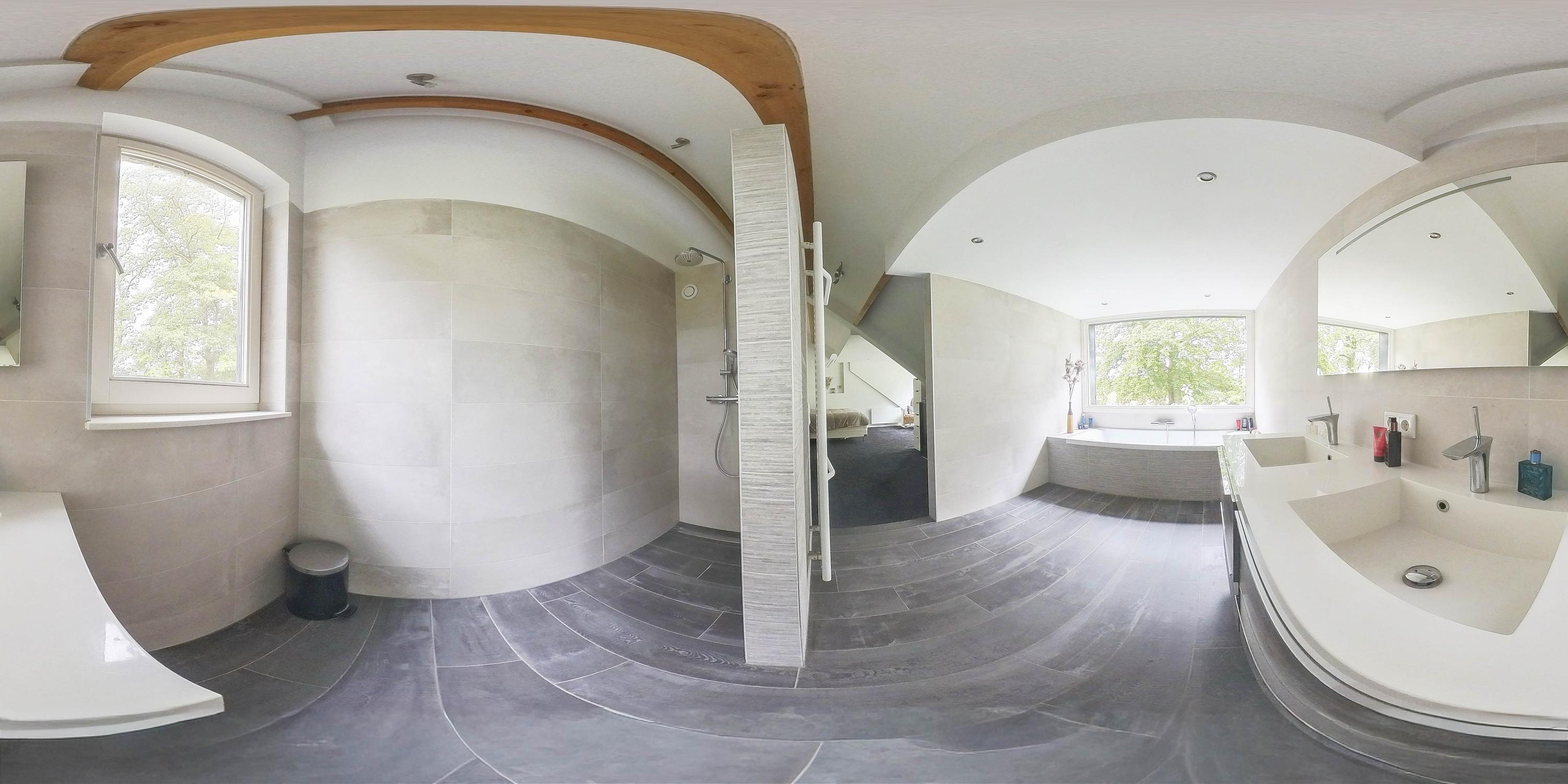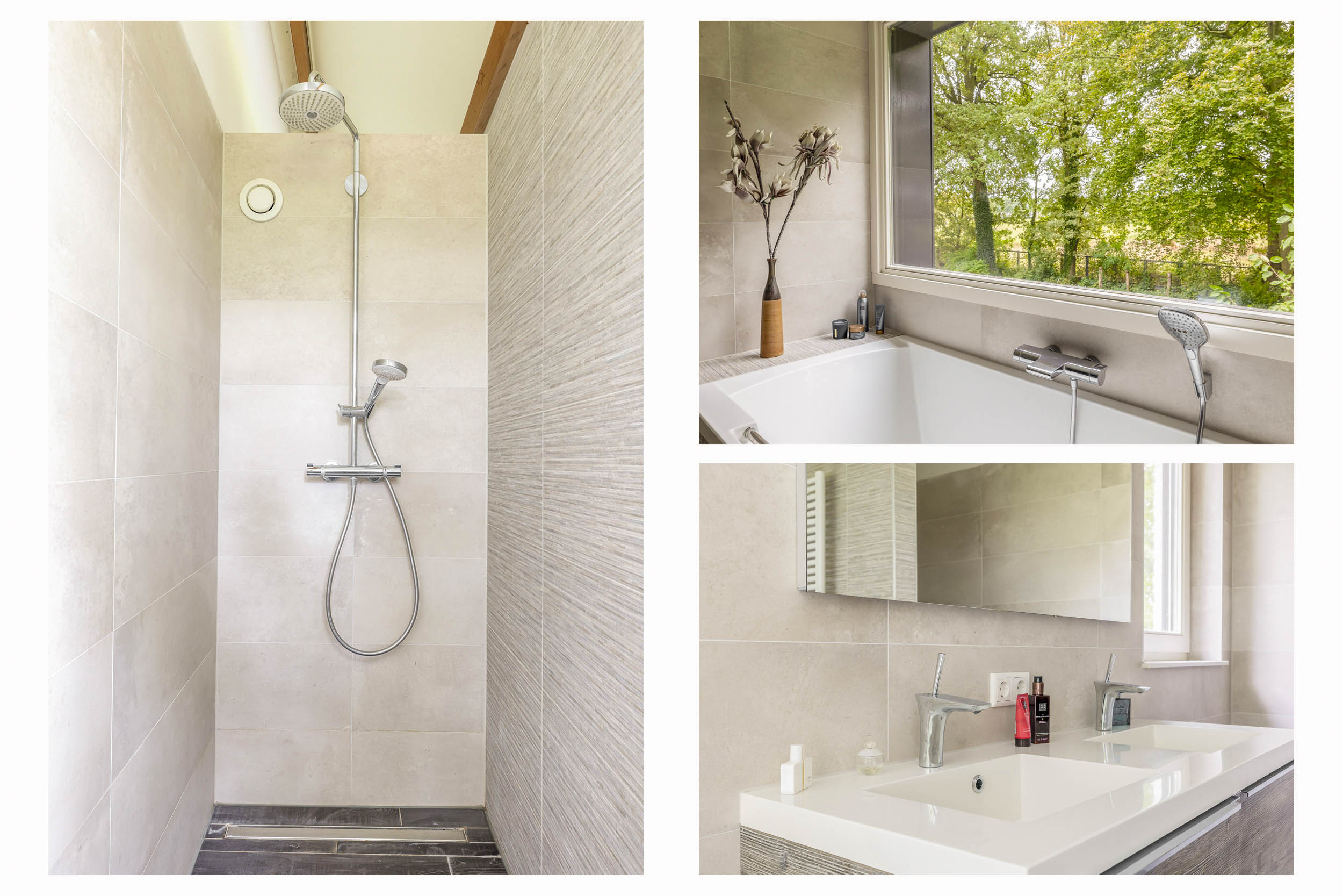 Vanuit de overloop is de tweede badkamer direct bereikbaar, deze is geheel betegeld in een lichte kleurstelling en beschikt over een ligbad, dubbele wastafel en een douchecabine. Voor ventilatie is er een mechanisch afzuigingssysteem aanwezig, tevens is er vloerverwarming aanwezig.