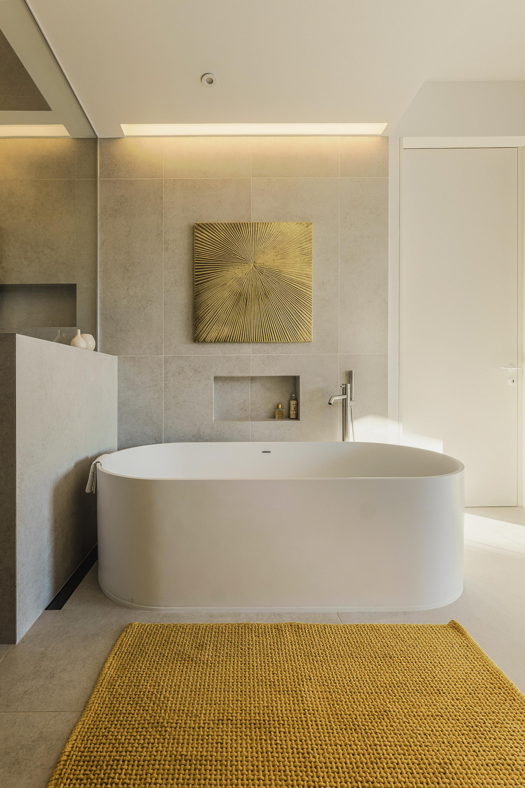 Een serene retreat met oceaanlicht en vloerverwarming. En-suite badkamer met marmeren dubbele wastafel, vrijstaand bad, inloop regendouche, bidet en toilet. Inclusief walk-in closet en aparte schoenenkast.