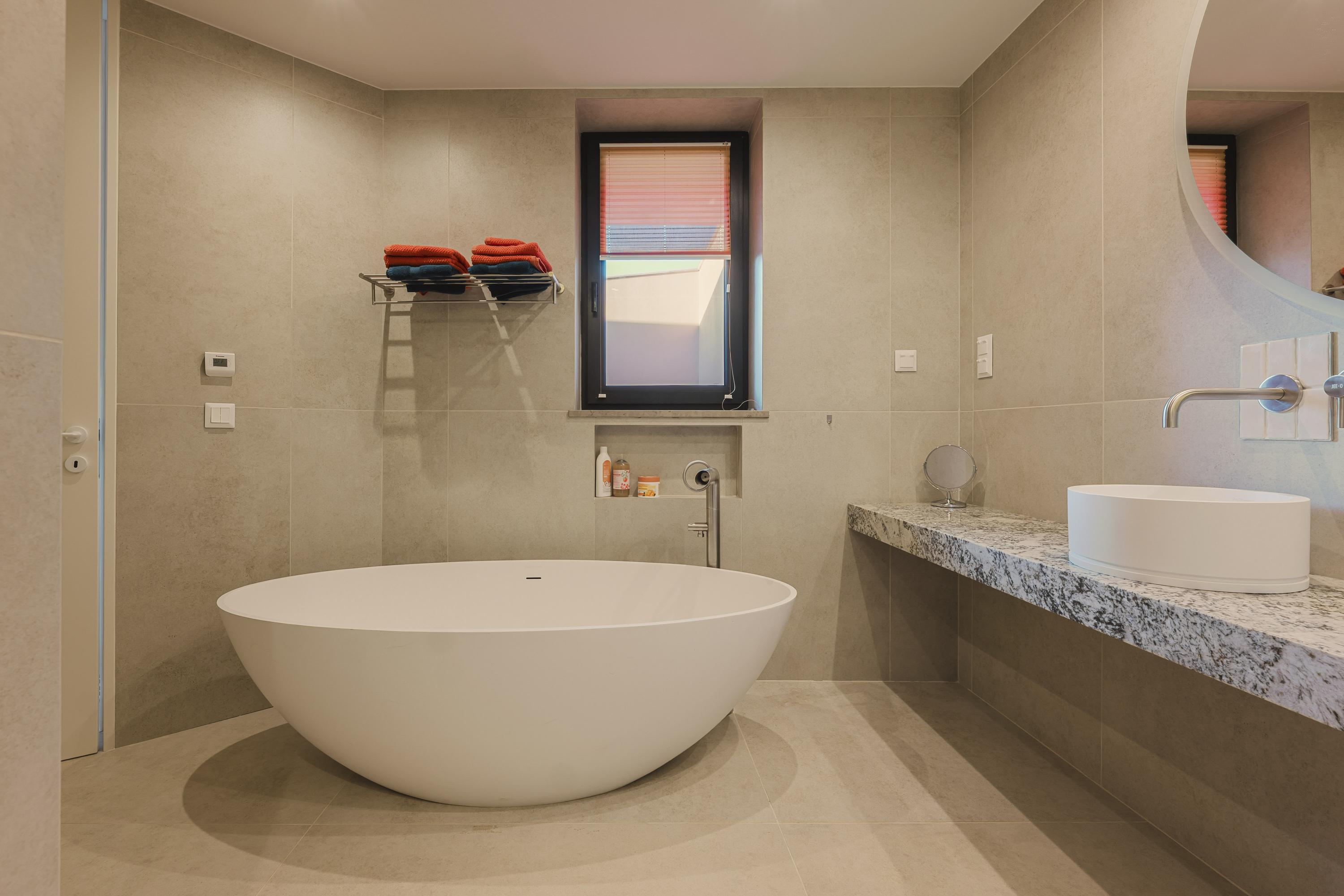 Met glazen hoek en uitzicht op tuin en zee. Badkamer met dubbele wastafel, regendouche, bidet, toilet en natuursteen.