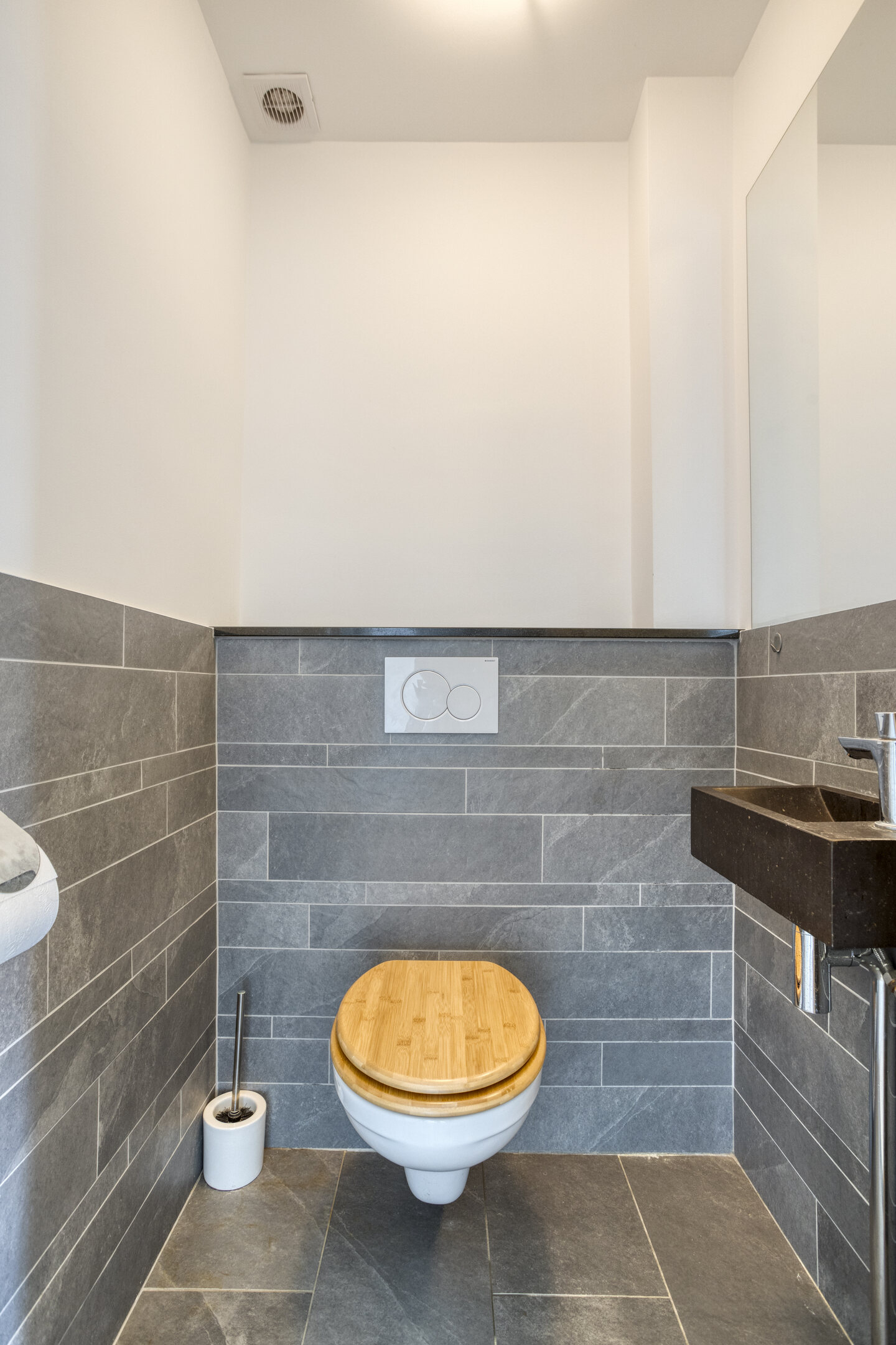Entree met voorportaal en hal, voorzien van gastentoilet en trapkast. De ruime woonkamer (ca. 60 m²) heeft een houten vloer en en-suitedeuren naar de eetkamer, met openslaande deuren naar de tuin. De moderne keuken is volledig uitgerust en biedt eveneens toegang tot de tuin. De achterzijde grenst niet direct aan buren, waardoor u volop privacy geniet.