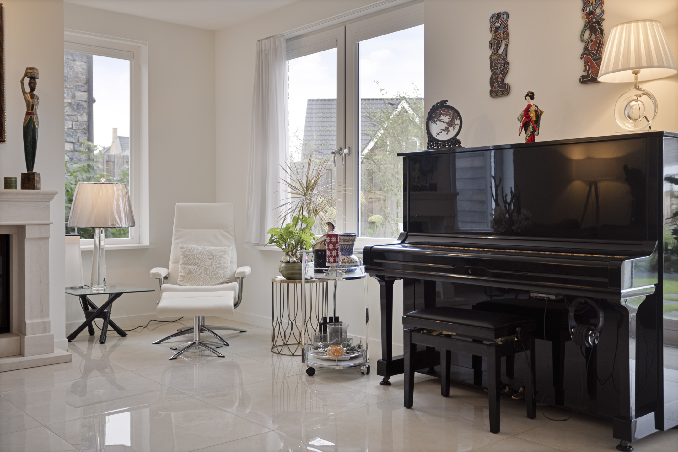 Riante en lichte entree met toilet en opbergkast. Aan de linkerzijde bevindt zich een mooie werk- of speelkamer. Aan de rechterzijde geeft de deur toegang tot de dubbele inpandige garage. Het woongedeelte meet (samen met de keuken) ruim 65 m2 en bestaat uit een ruime en lichte woonkamer met schouw, een eetruimte in het middengedeelte met openslaande deuren naar de tuin en een moderne en luxe open keuken met ‘eiland’ welke uiteraard is voorzien van alle moderne apparatuur.