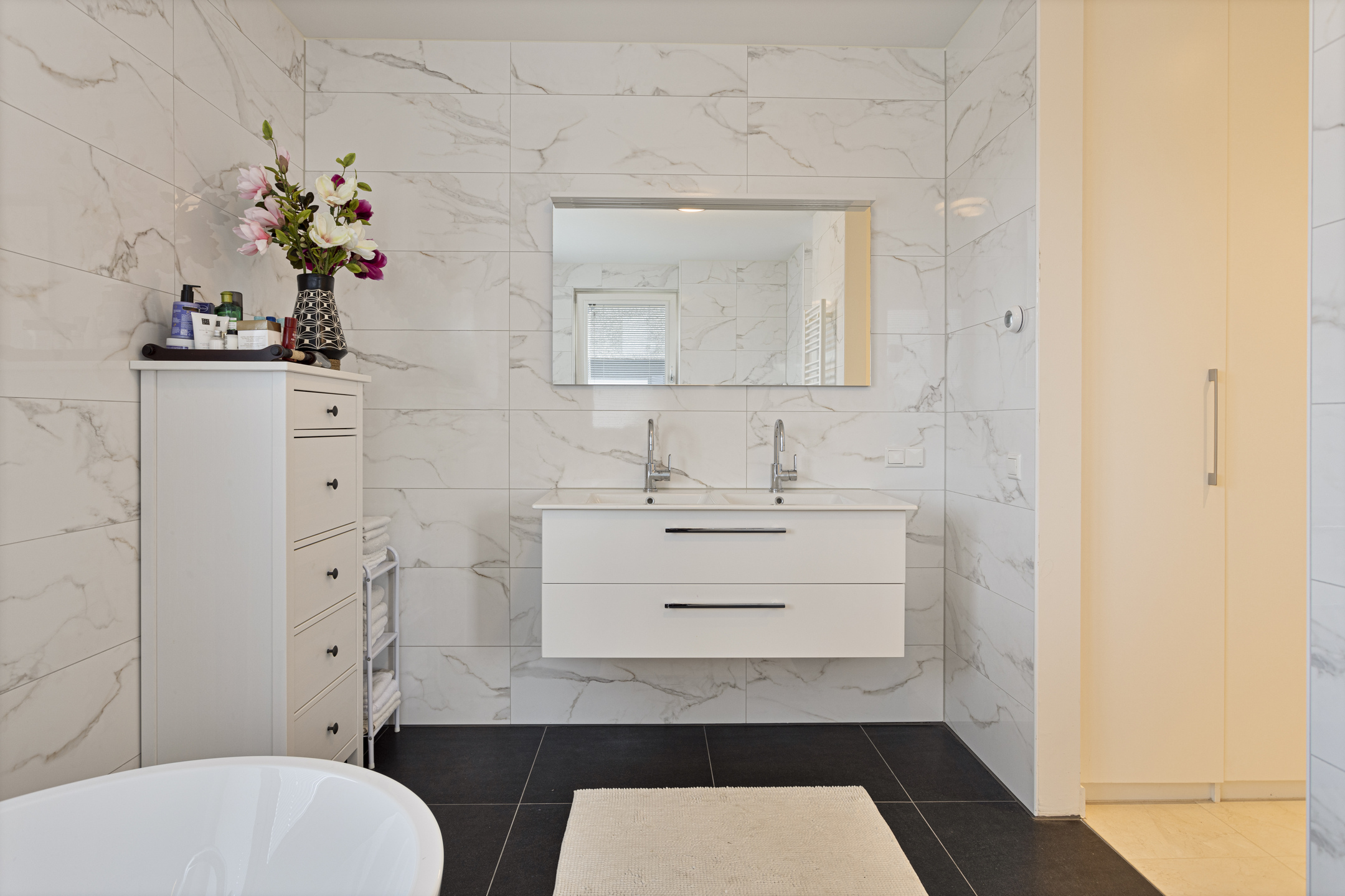 Ruime overloop met aparte wasruimte en technische ruimte. Verder treft u op deze woonlaag 4 zeer royale slaapkamers aan. De ouderslaapkamer beschikt over een zeer ruime inloopkledingkast met op maat gemaakte kasten en daarachter een luxe badkamer en suite voorzien van bad, douche, dubbele wastafel en toilet. Eén van de andere slaapkamers beschikt ook over een badkamer en suite (met douche, wastafel en toilet). De andere twee slaapkamers delen een prachtige ruime (3e!) badkamer met douche, dubbele wastafel en toilet. Een luik op de overloop geeft toegang tot een zeer ruimte bergzolder.