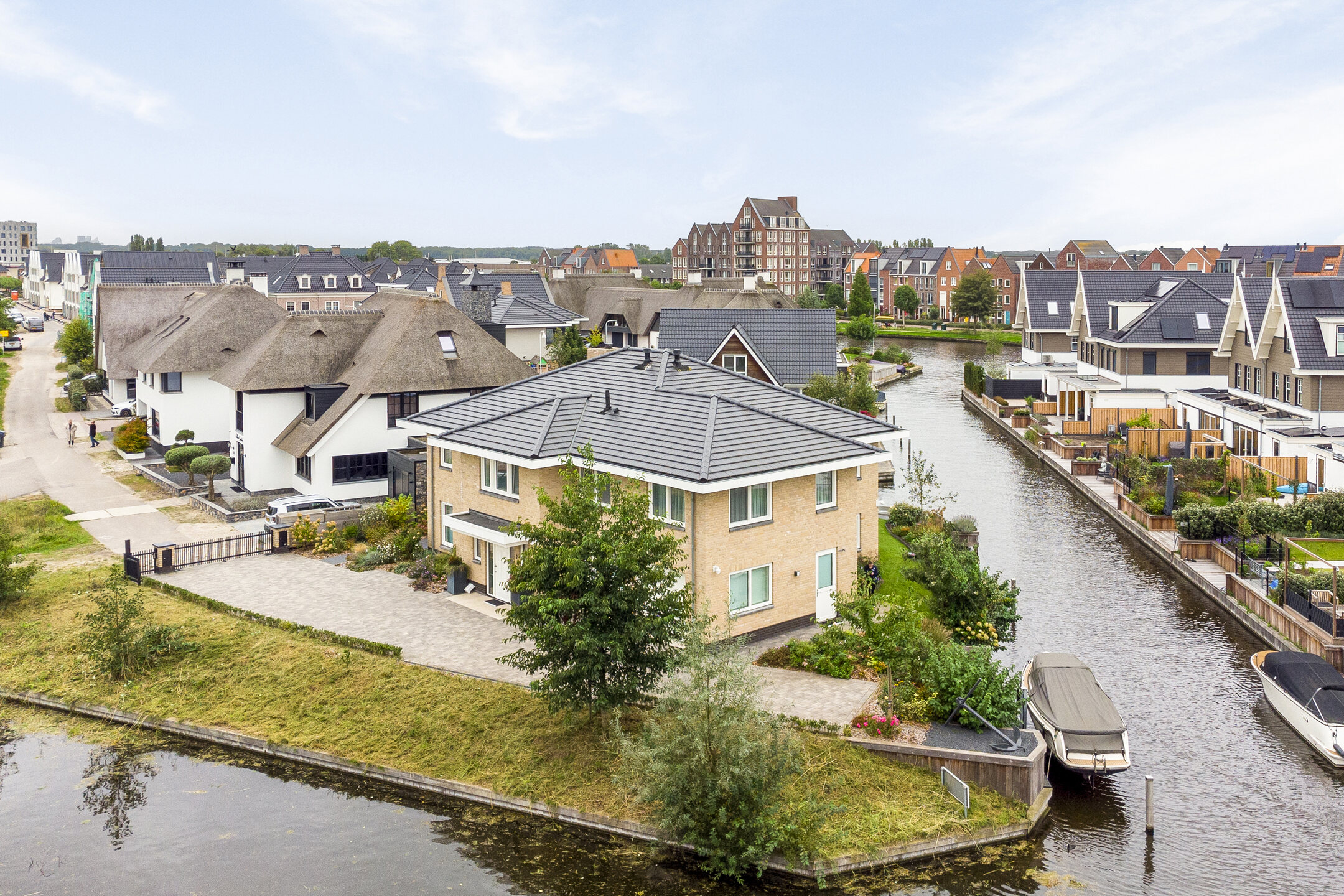 Aan de buitenzijde van de woning valt op dat deze beschikt over een zeer ruime oprit met elektrisch bedienbaar toegangshek. Aan het einde van de oprit bevindt zich een dubbele inpandige garage. Naast de woning staat de houten berging, die ook handig is voor de dagelijkse fietsen. De achtertuin is fraai aangelegd en heeft een riant terras direct aan de woning én een groot ‘deck’ aan het water. Aan de lange zijde van de tuin bevinden zich meerdere afmeerplekken voor boten, waarvan één afmeerplek is voorzien van een bootlift.