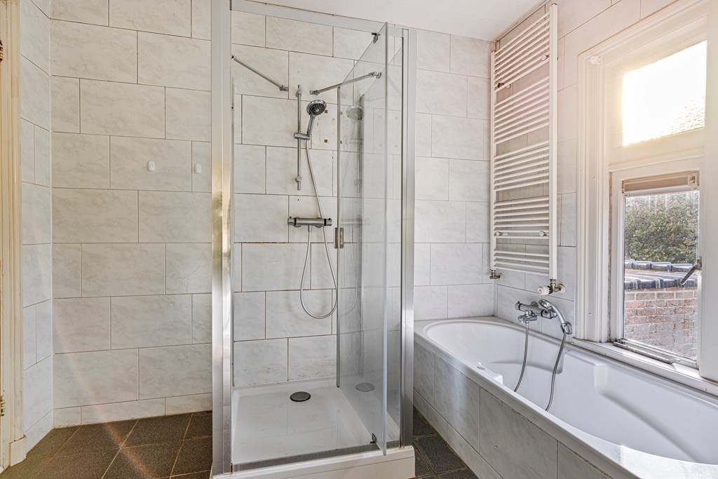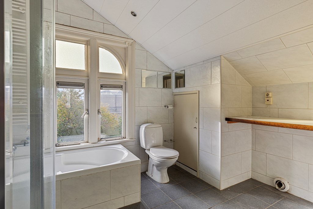 De badkamer biedt veel ruimte en is volledig betegeld. U vindt er een douchecabine, ligbad, wastafel met spiegel, handdoekradiator en een toilet. Hoewel de badkamer enige modernisering kan gebruiken, is het een ruimte waar u heerlijk tot rust komt na een lange dag.