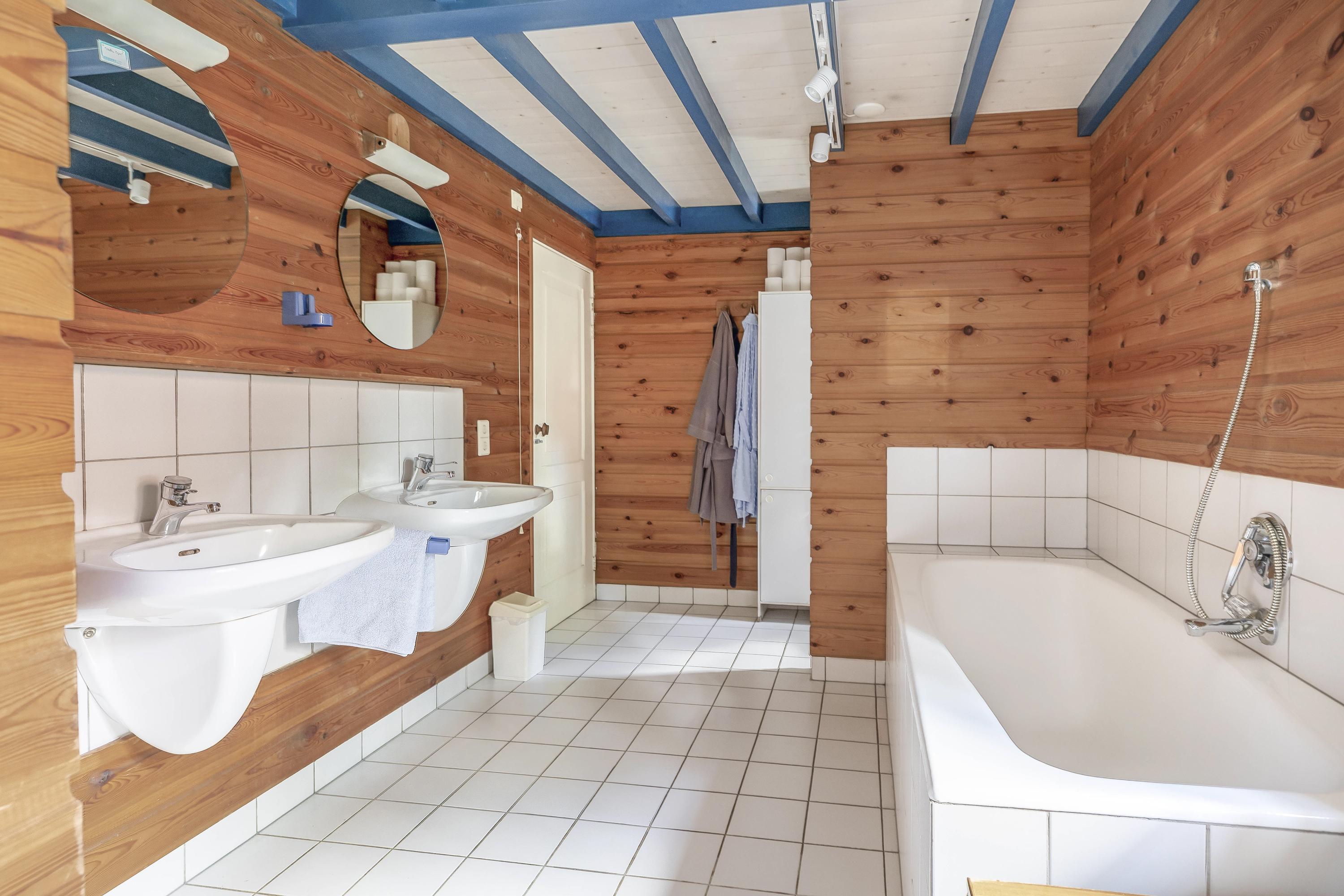 De badkamer op de begane grond is deels betegeld en compleet uitgerust met een ligbad, douchecabine met in de muur ingebouwde thermostaatkraan en zijstralers, twee vaste wastafels met mengkranen en een toilet.