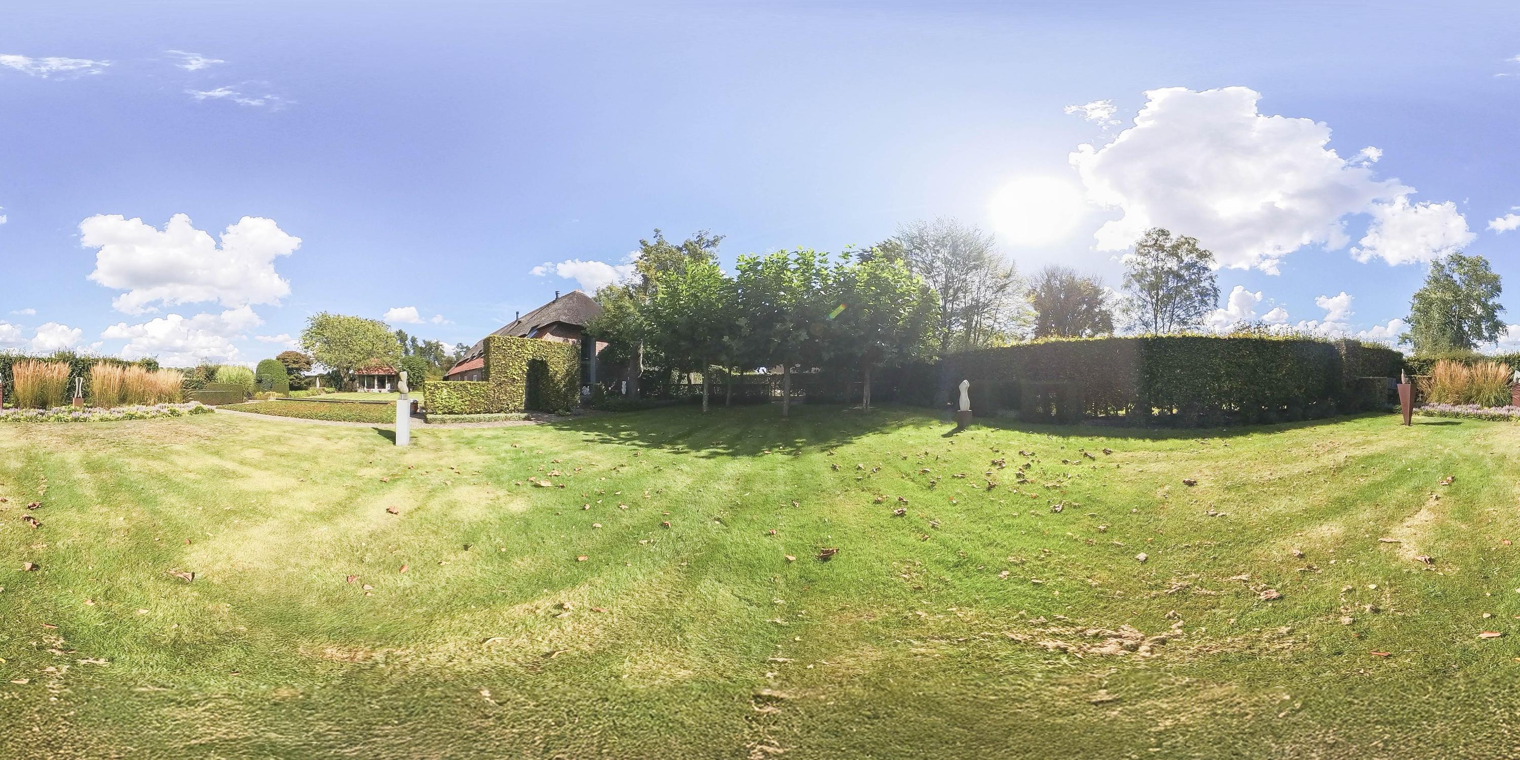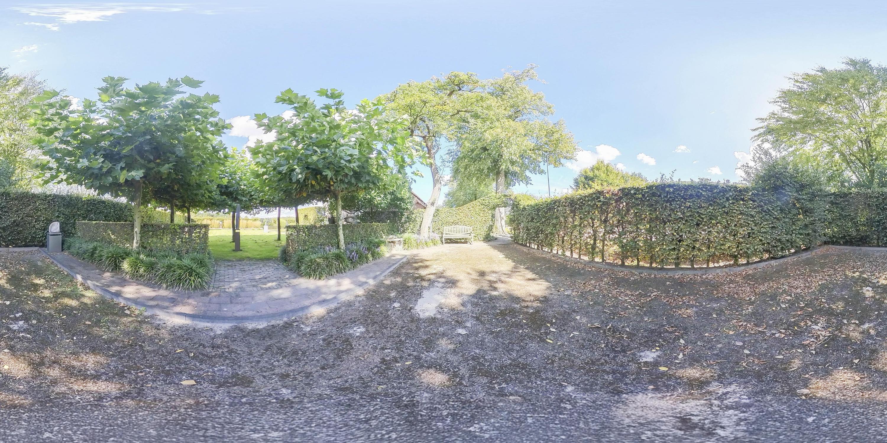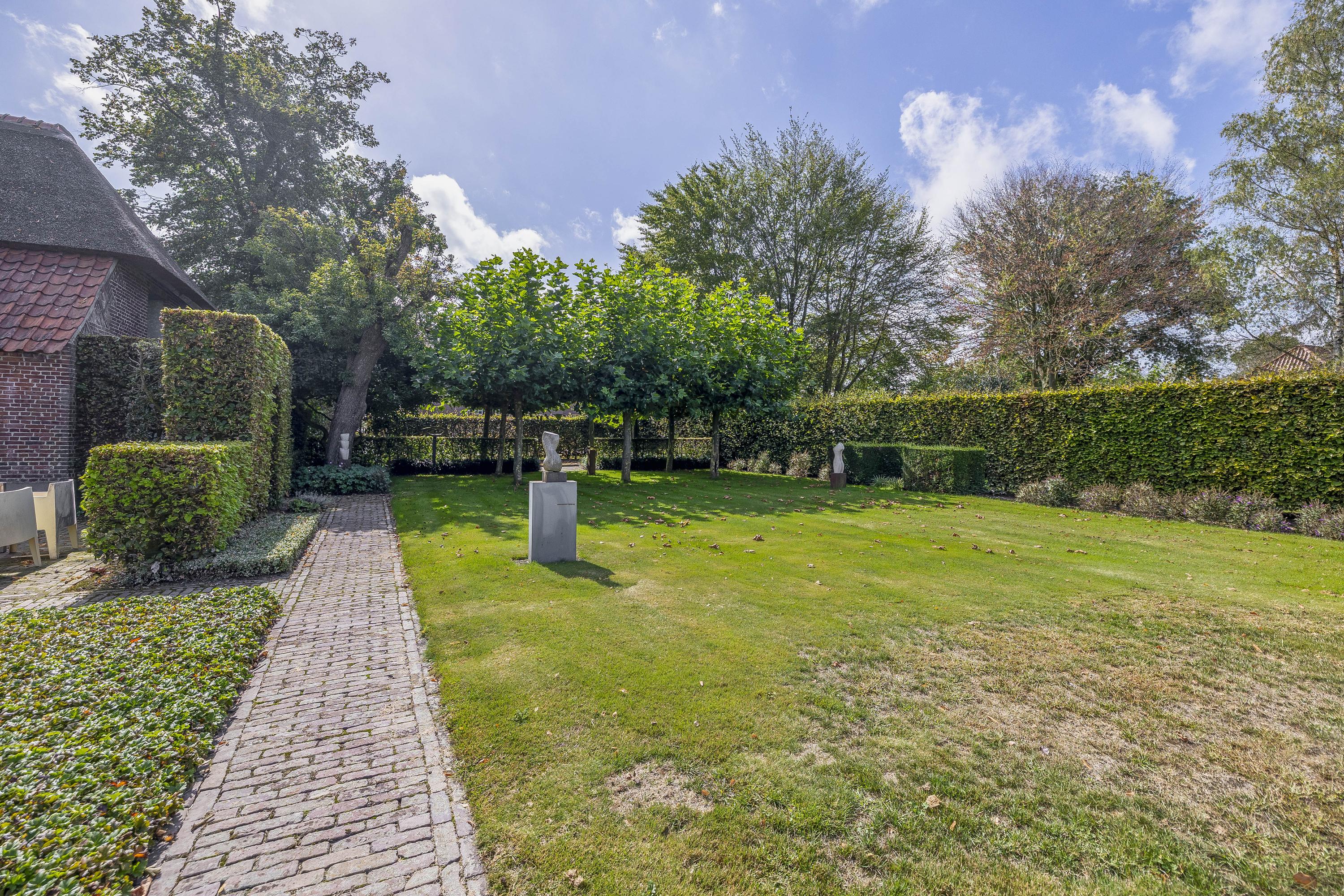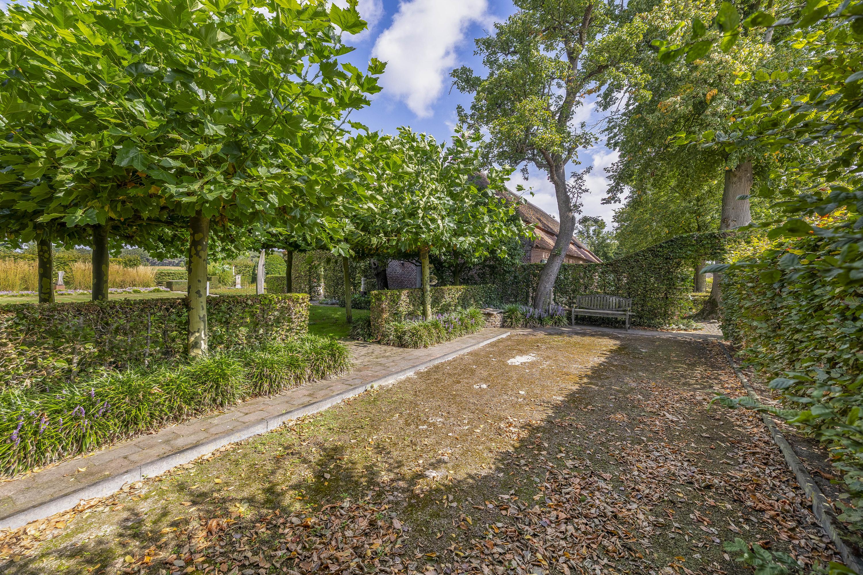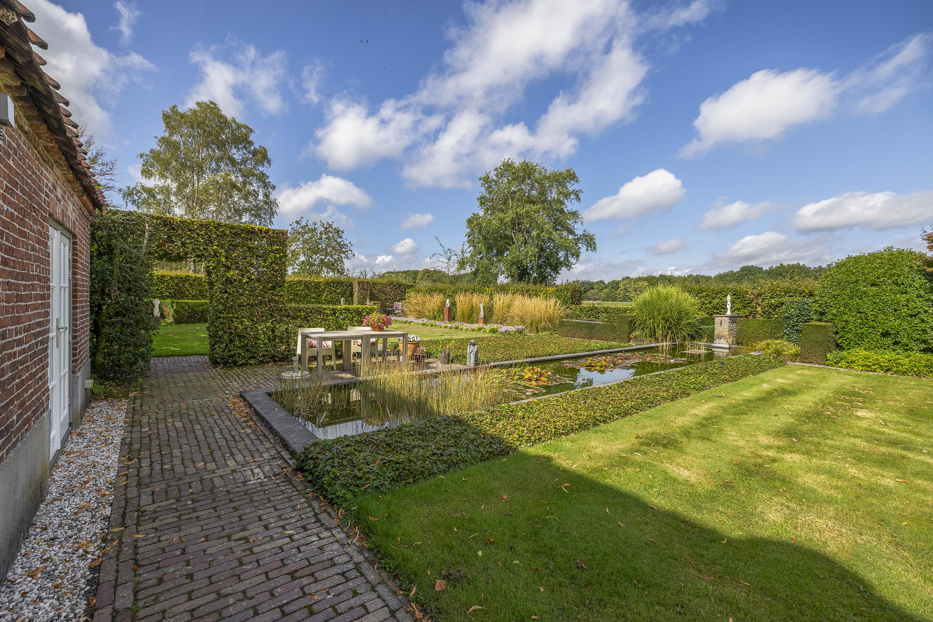 Achter de woning en aan de zijkanten ligt een prachtig aangelegde tuin. Aan de linkerzijde bevindt zich een mooi royaal stuk met gazon, plantenborders, bestrating van oude gebakken klinkers en diverse beukenhagen. Aan de achterzijde geniet je van een fraai zicht, een grote vijverpartij (met biologische filter), een ruim gazon, plantenborders en volwassen begroeiing. De tuin is goed aangelegd en goed onderhouden. Een dubbele oprit is aanwezig aan de rechterzijde van het pand. De tuin biedt zelfs de mogelijkheid voor het houden van kleine beestjes. Je vindt er ook een stukje tuin met een "de loverslane". Links van de woning ligt een aangelegde jeu-de-boules-baan.