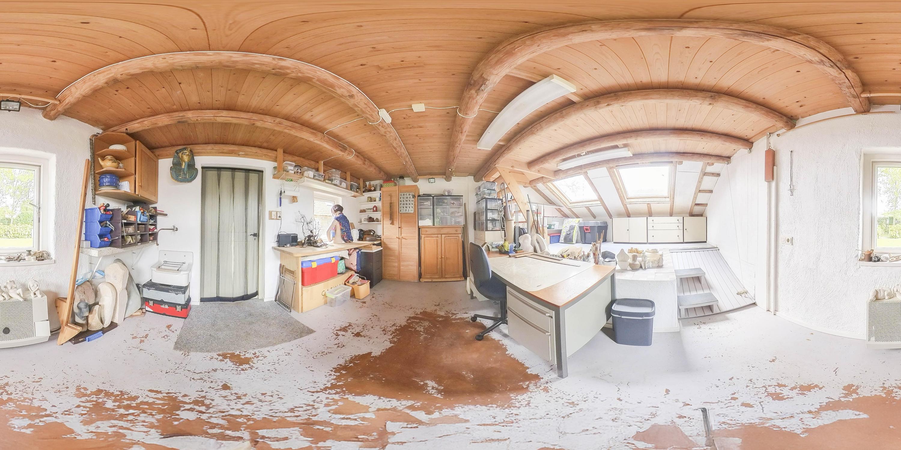 Het onderdeel van dit bijgebouw dat als atelierruimte in gebruik is, heeft een betonvloer, twee dakvensters aan de achterzijde en tevens aan 3 zijden ramen en een uitstortgootsteen met koudwateraansluiting. Vanuit hier heb je via een vaste trap nog toegang tot een zolderruimte met een groot Velux dakvenster en de nodige bergruimte. De atelierruimte beschikt bovendien over een manshoge wijnkelder, toegankelijk via een luik met vaste trap. De atelierruimte is tevens voorzien van een gasgevelkachel.