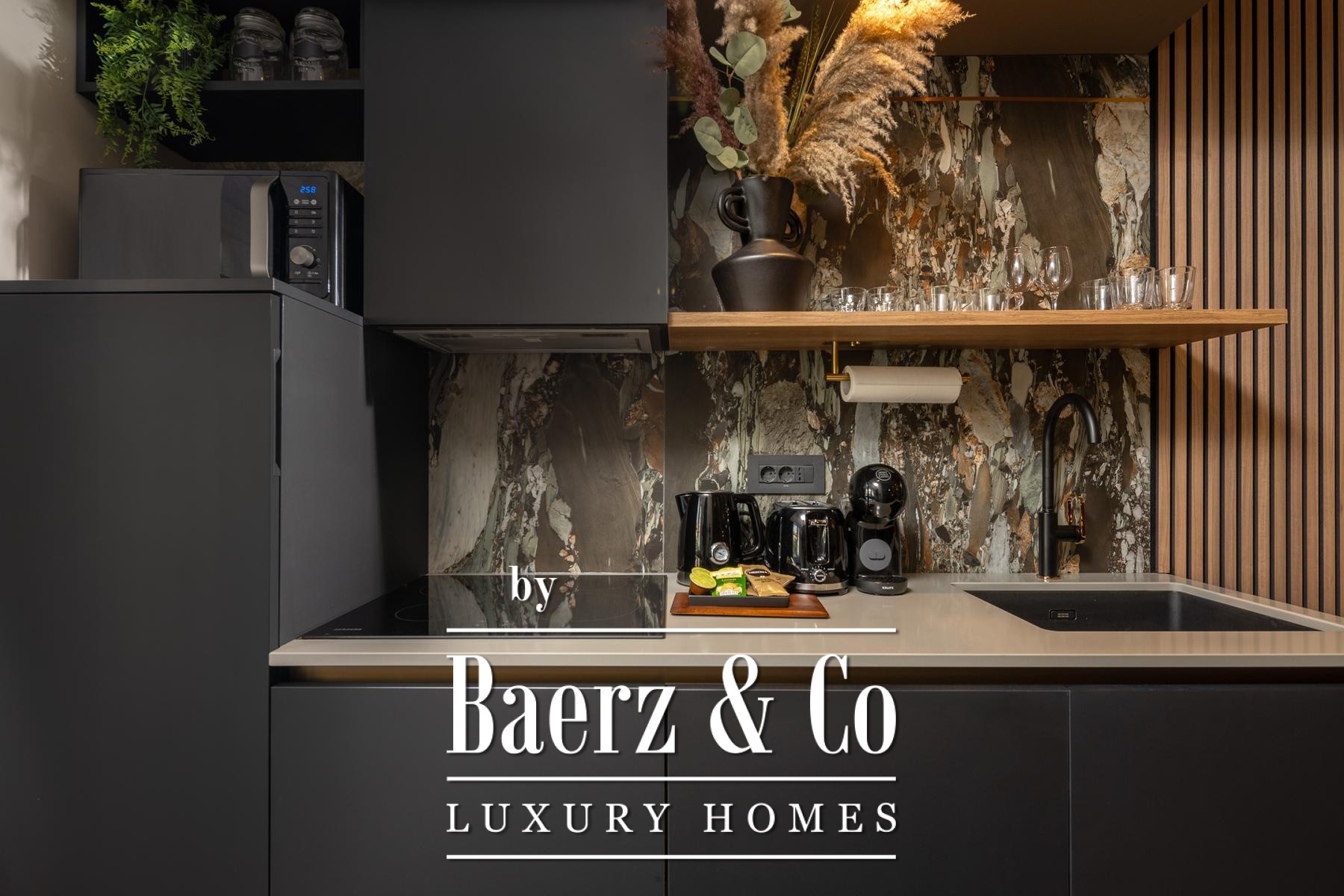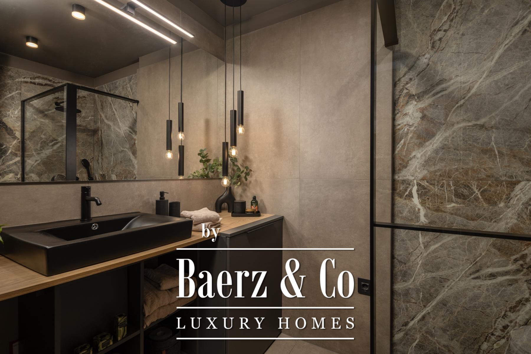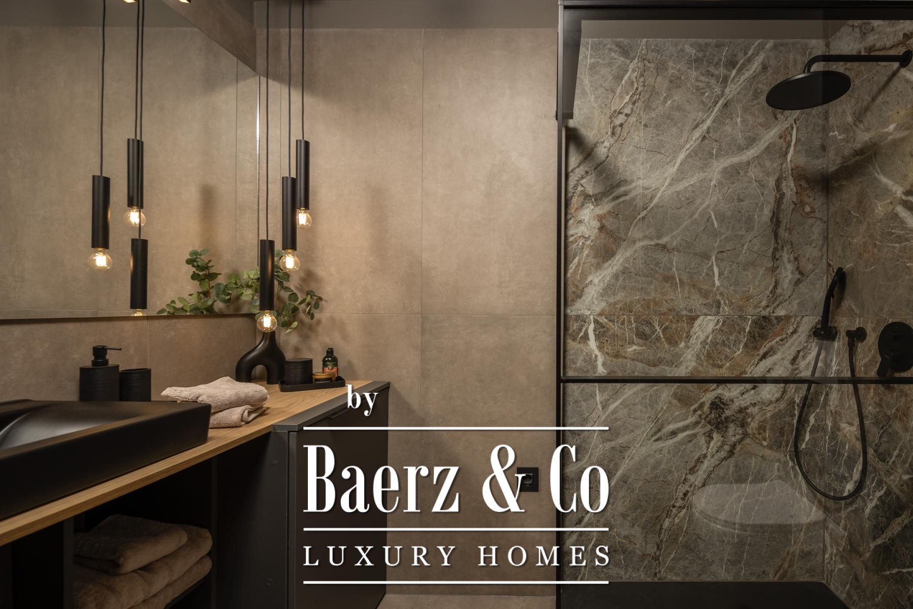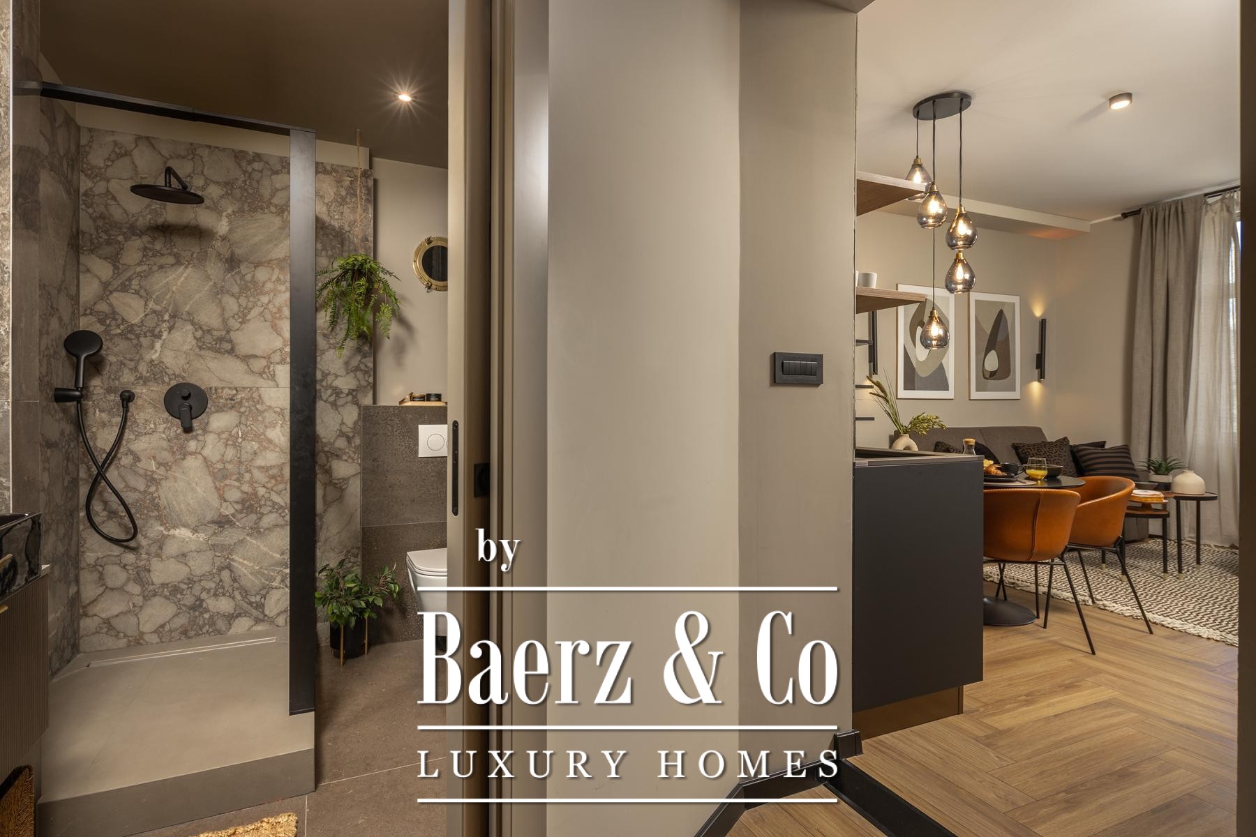 Het interieur kenmerkt zich door een verfijnd gebruik van warme beige- en antraciettinten, geaccentueerd met gouden details en maatwerkverlichting. Italiaans meubilair, grootformaat porseleinen tegels en matzwarte Veneta Cucine-keukens met stijlvolle marmerstenen achterwanden tillen het niveau naar een hoger plan. Matglazen scheidingswanden, houten wandpanelen met LED-accenten en designer messing verlichting maken de sfeer compleet.
