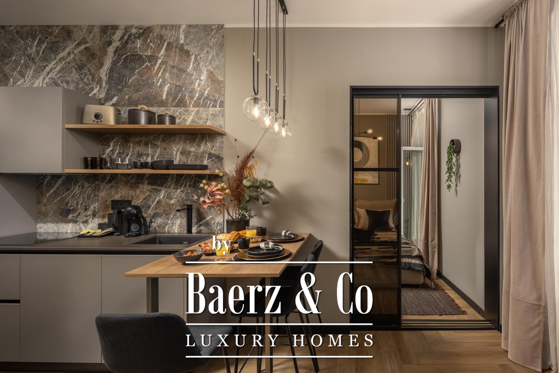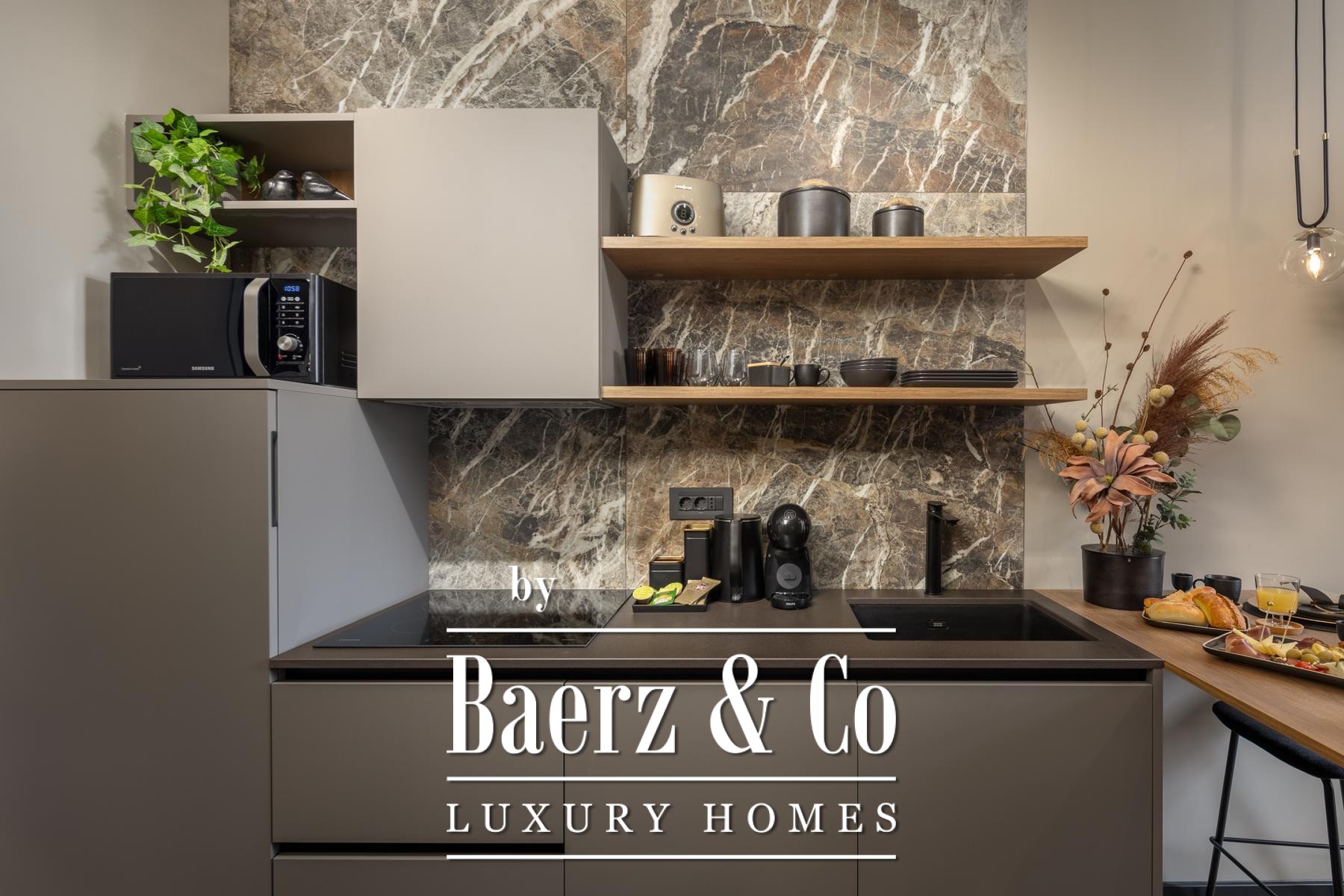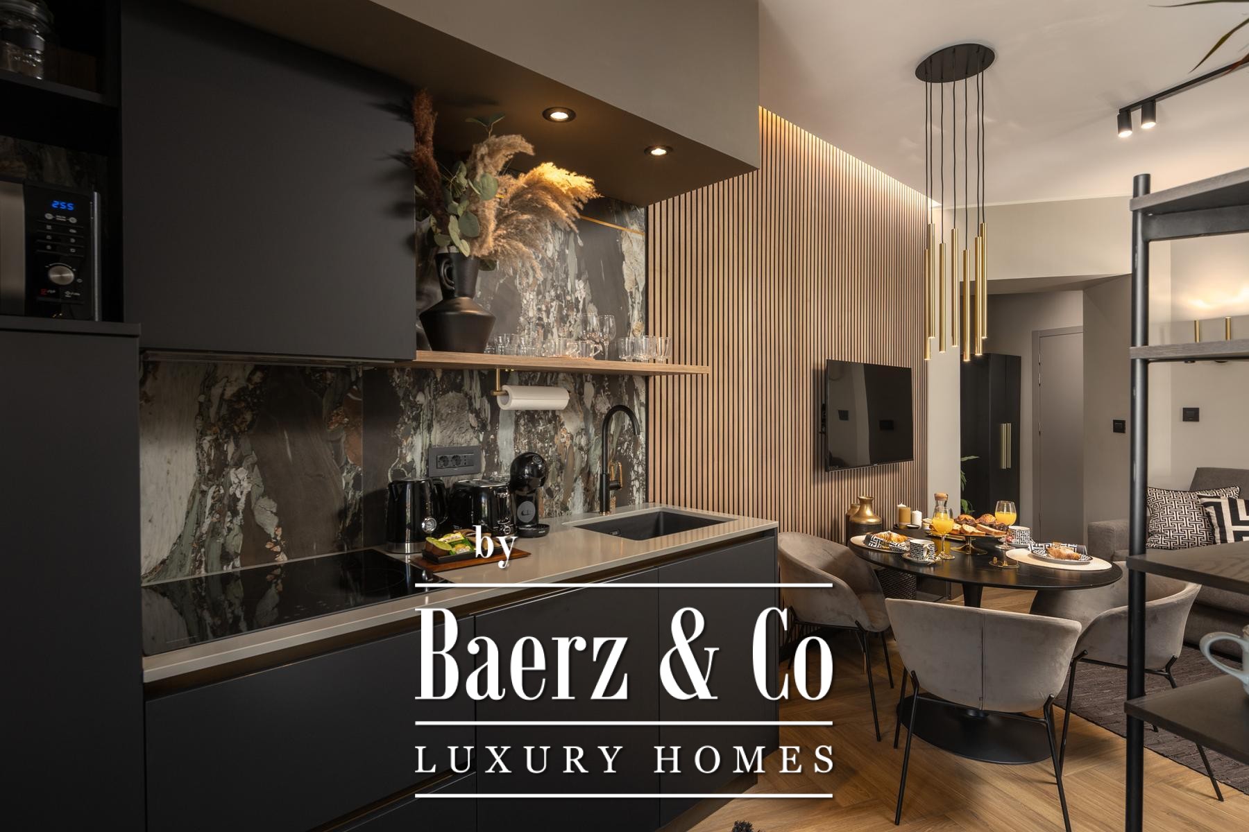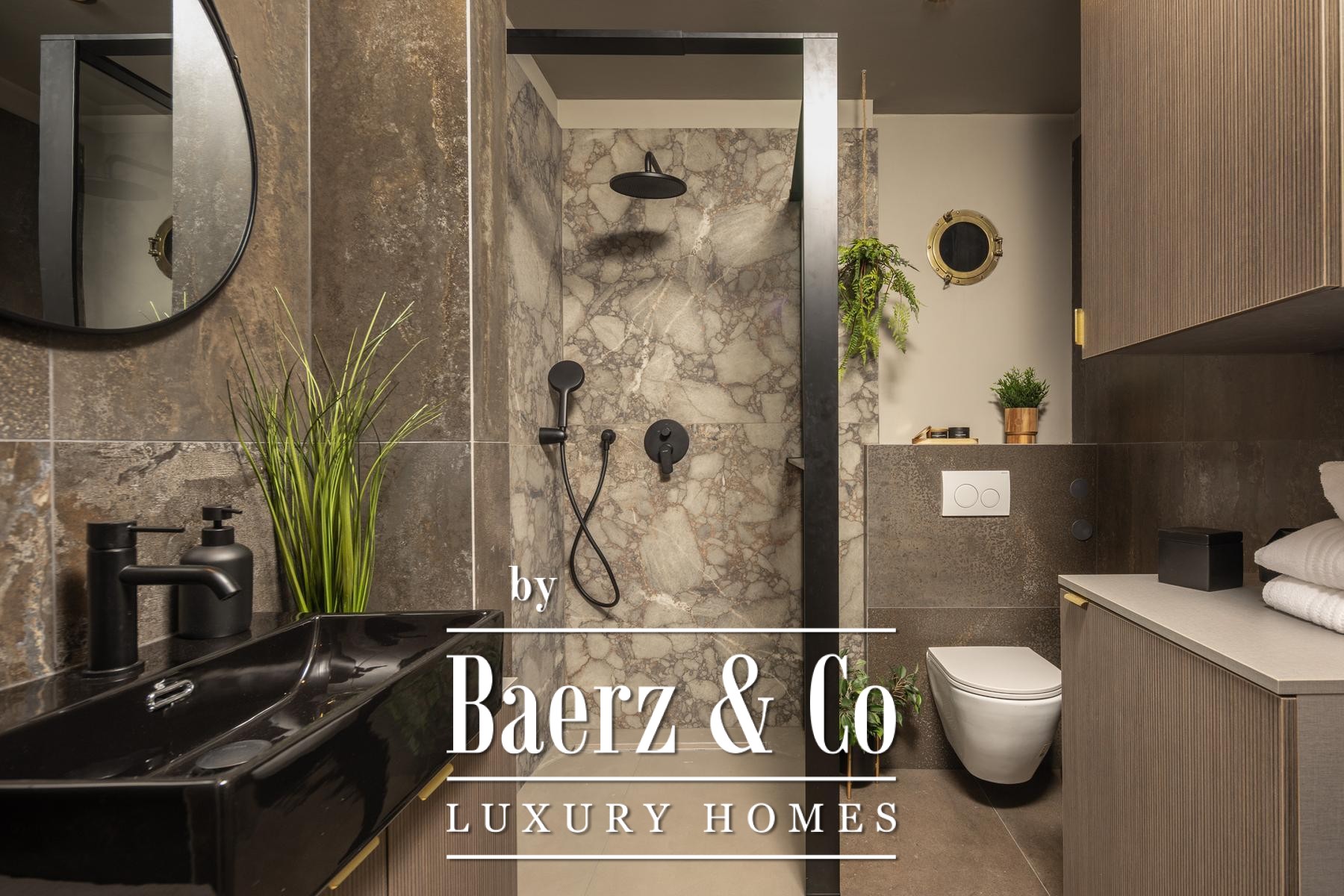 Het interieur kenmerkt zich door een verfijnd gebruik van warme beige- en antraciettinten, geaccentueerd met gouden details en maatwerkverlichting. Italiaans meubilair, grootformaat porseleinen tegels en matzwarte Veneta Cucine-keukens met stijlvolle marmerstenen achterwanden tillen het niveau naar een hoger plan. Matglazen scheidingswanden, houten wandpanelen met LED-accenten en designer messing verlichting maken de sfeer compleet.