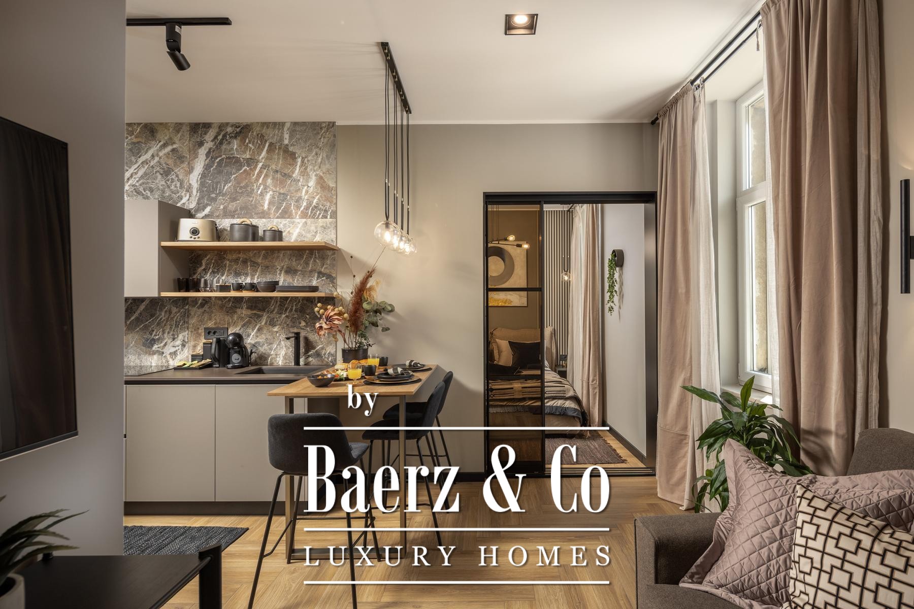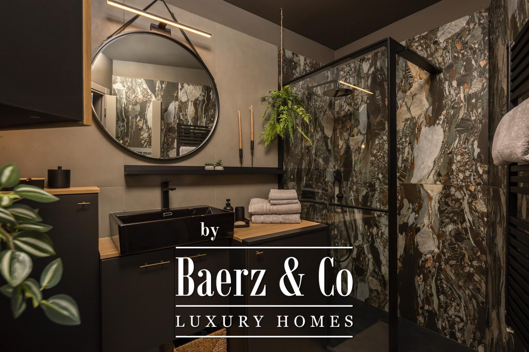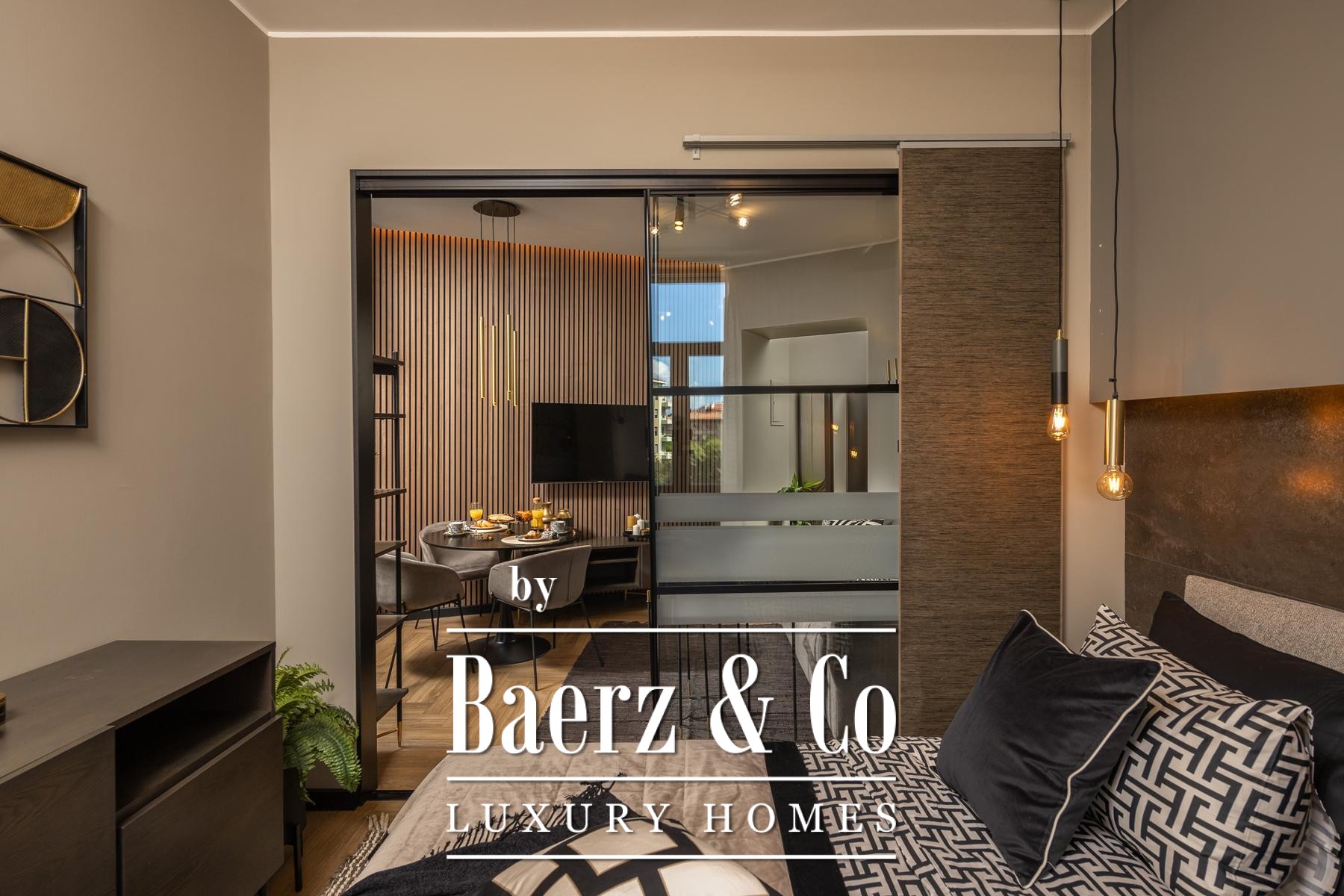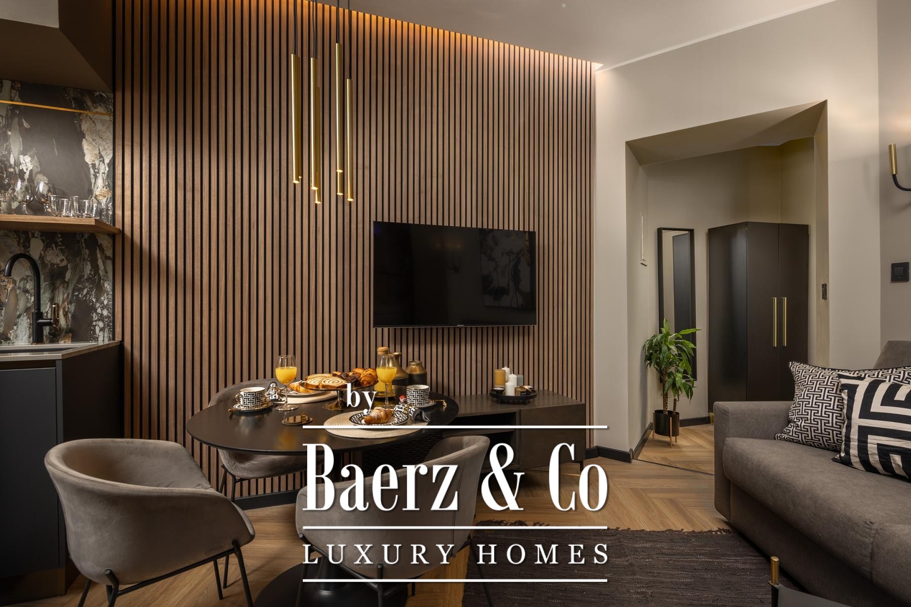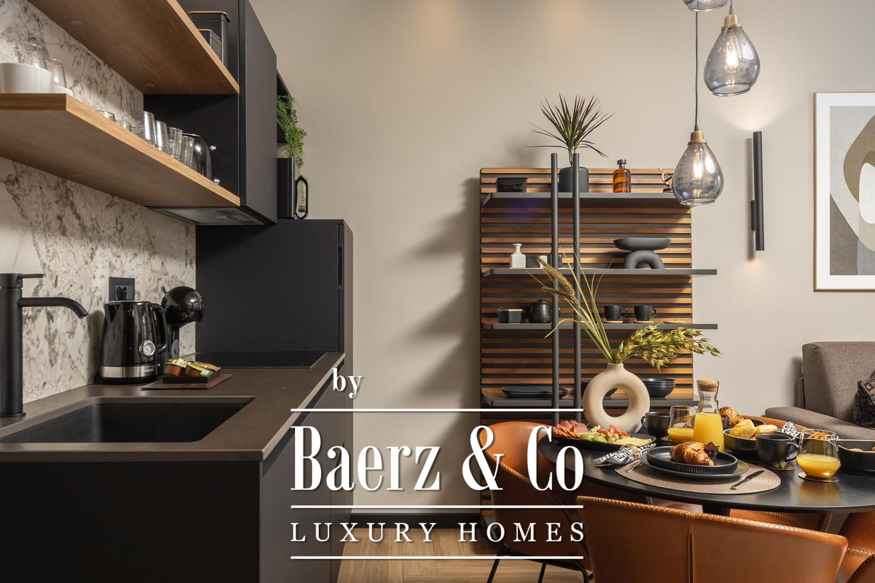 Het interieur kenmerkt zich door een verfijnd gebruik van warme beige- en antraciettinten, geaccentueerd met gouden details en maatwerkverlichting. Italiaans meubilair, grootformaat porseleinen tegels en matzwarte Veneta Cucine-keukens met stijlvolle marmerstenen achterwanden tillen het niveau naar een hoger plan. Matglazen scheidingswanden, houten wandpanelen met LED-accenten en designer messing verlichting maken de sfeer compleet.