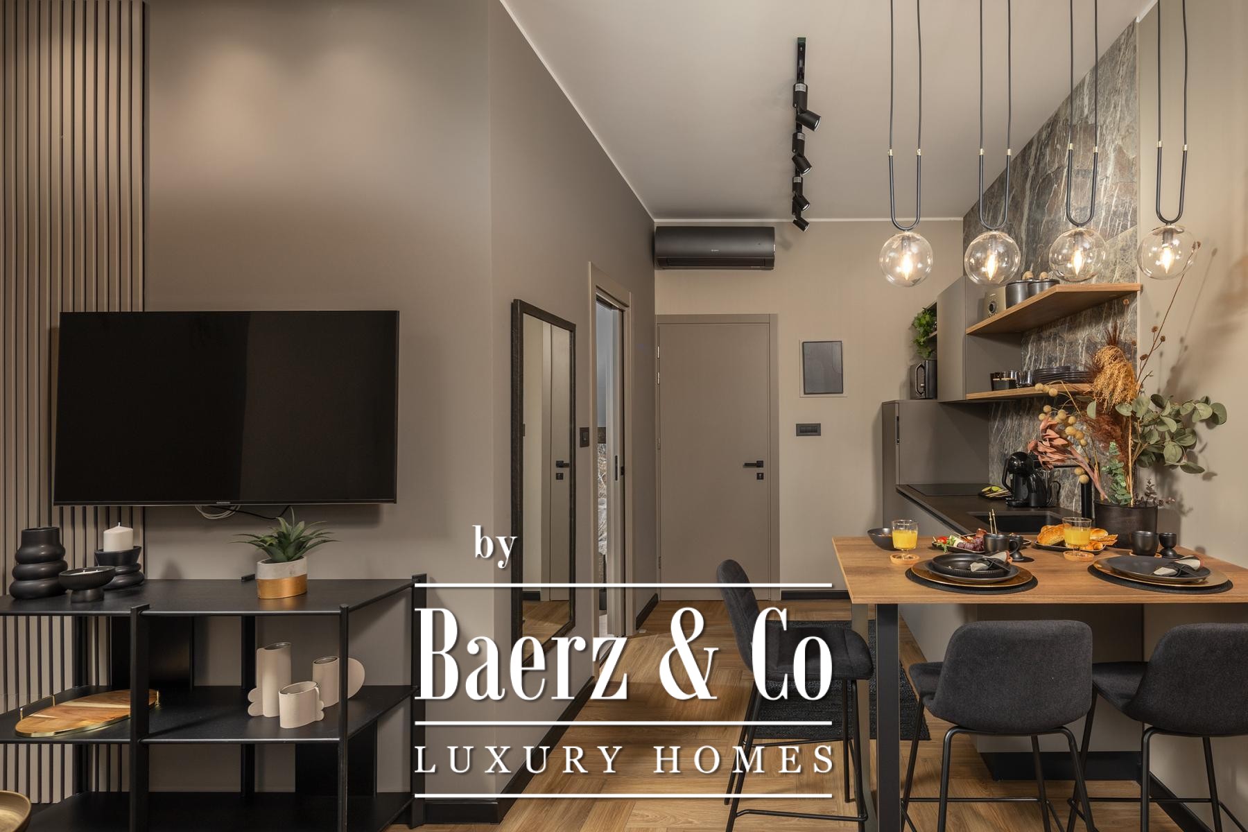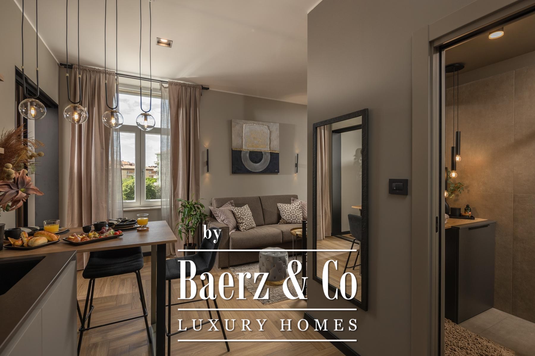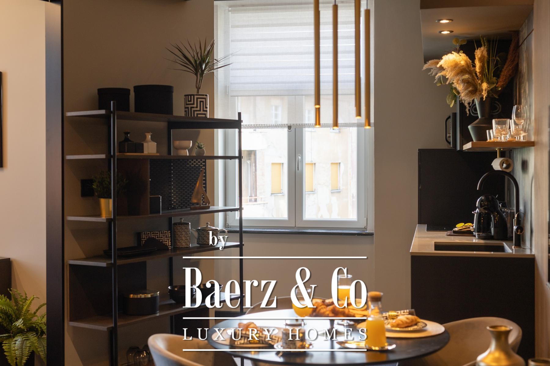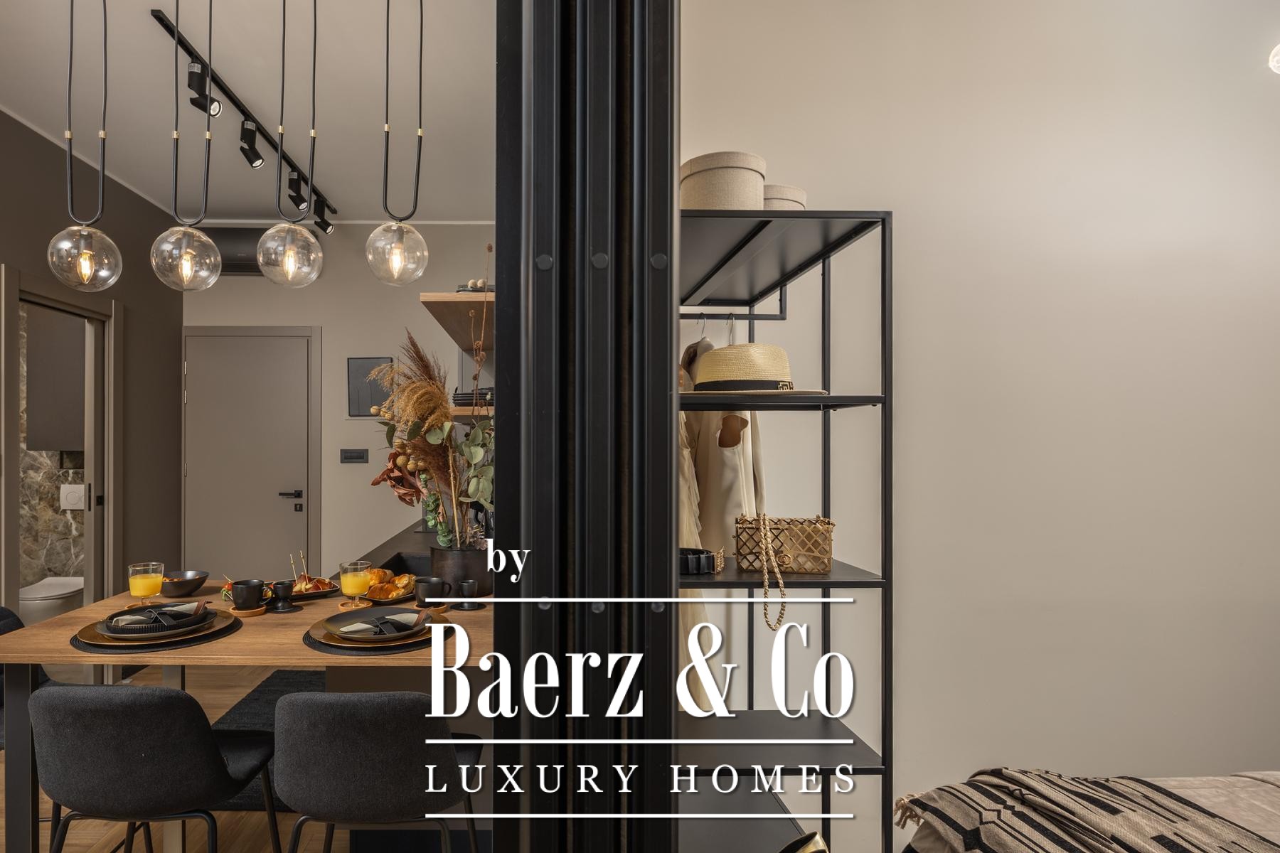 Het interieur kenmerkt zich door een verfijnd gebruik van warme beige- en antraciettinten, geaccentueerd met gouden details en maatwerkverlichting. Italiaans meubilair, grootformaat porseleinen tegels en matzwarte Veneta Cucine-keukens met stijlvolle marmerstenen achterwanden tillen het niveau naar een hoger plan. Matglazen scheidingswanden, houten wandpanelen met LED-accenten en designer messing verlichting maken de sfeer compleet.