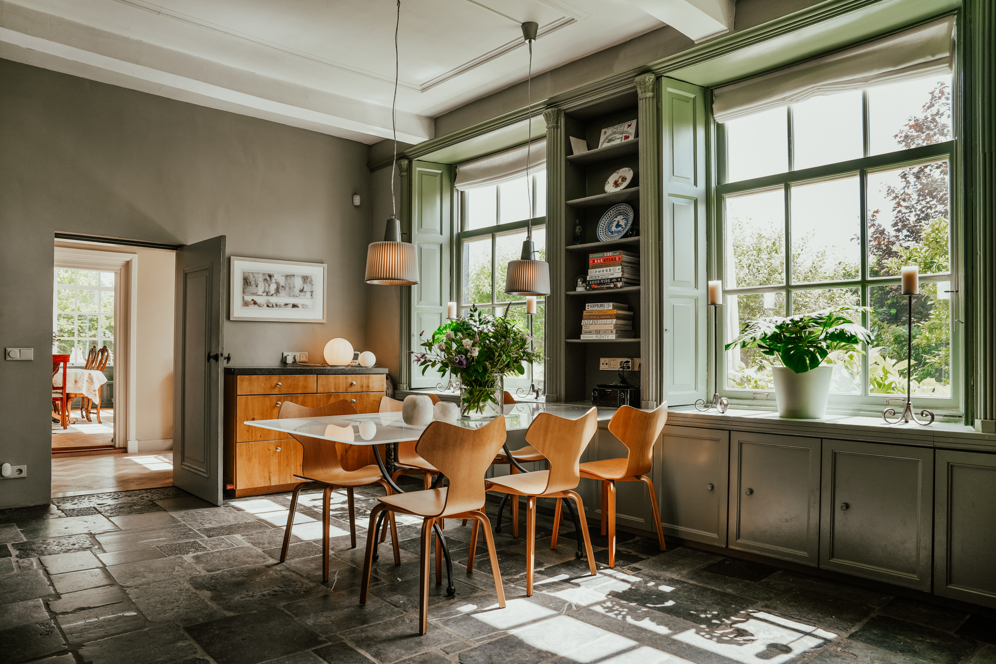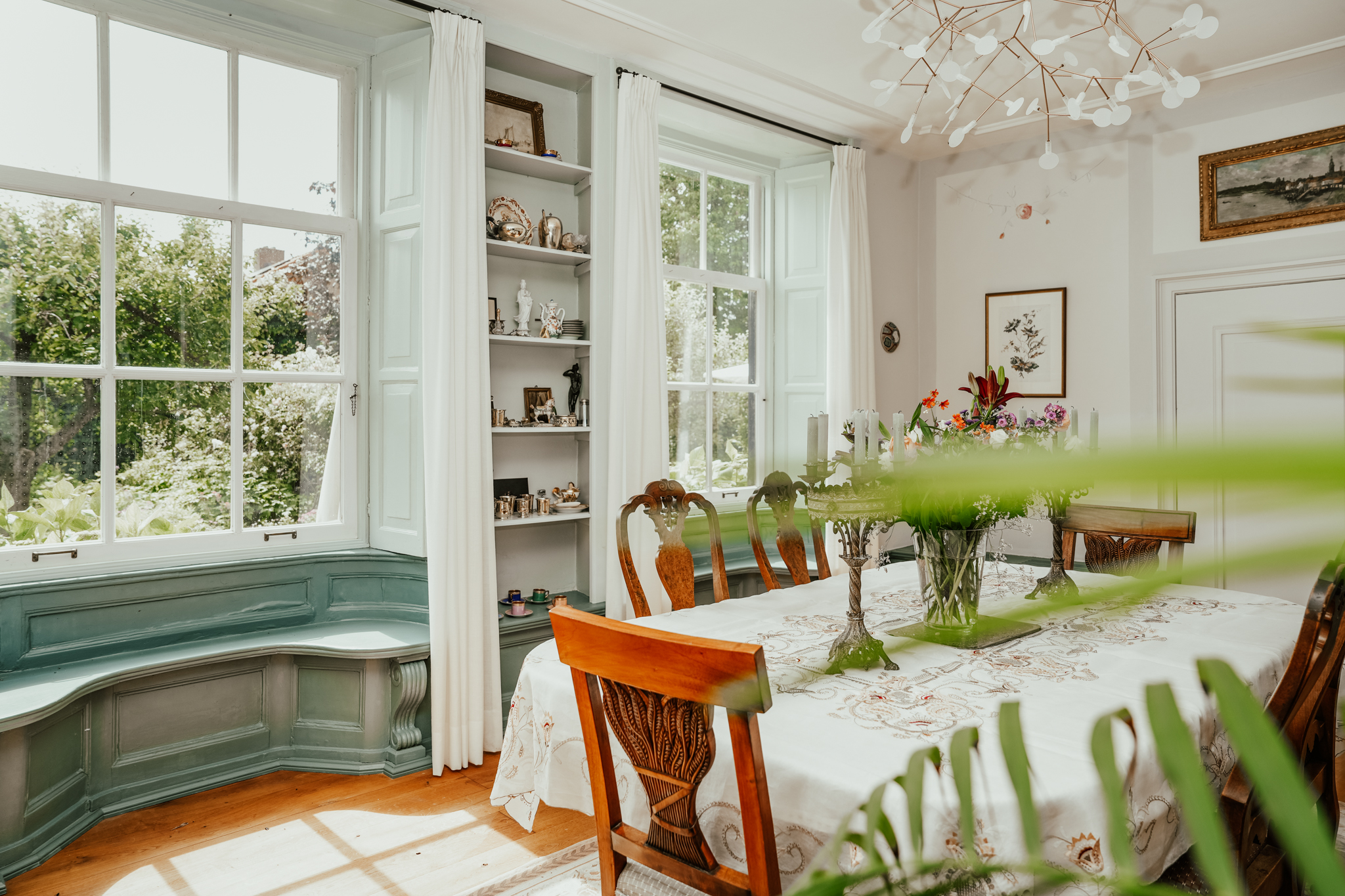 Fraaie dubbele en suite paneeldeuren leiden naar de tuingerichte eetkamer. Deze heeft prachtige zitvensterbanken onder de hoge roederamen, voorzien van authentieke binnenluiken, een inbouwkast en een stucplafond.