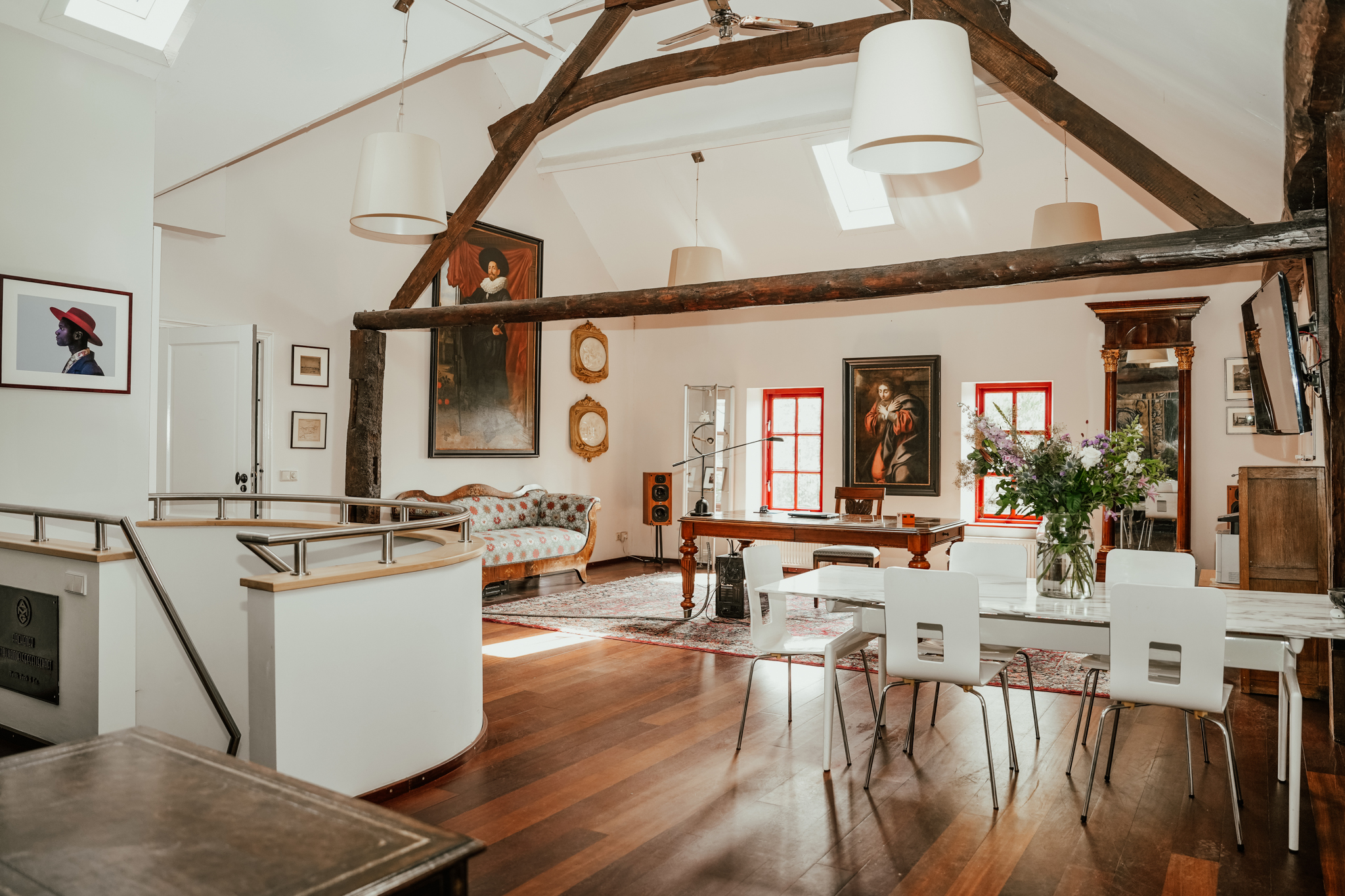 Een riant kantoor met archiefruimte, drie slaapkamers, waarvan twee met haard, een werkruimte, twee badkamers en een waskamer met infraroodsauna op de eerste verdieping.