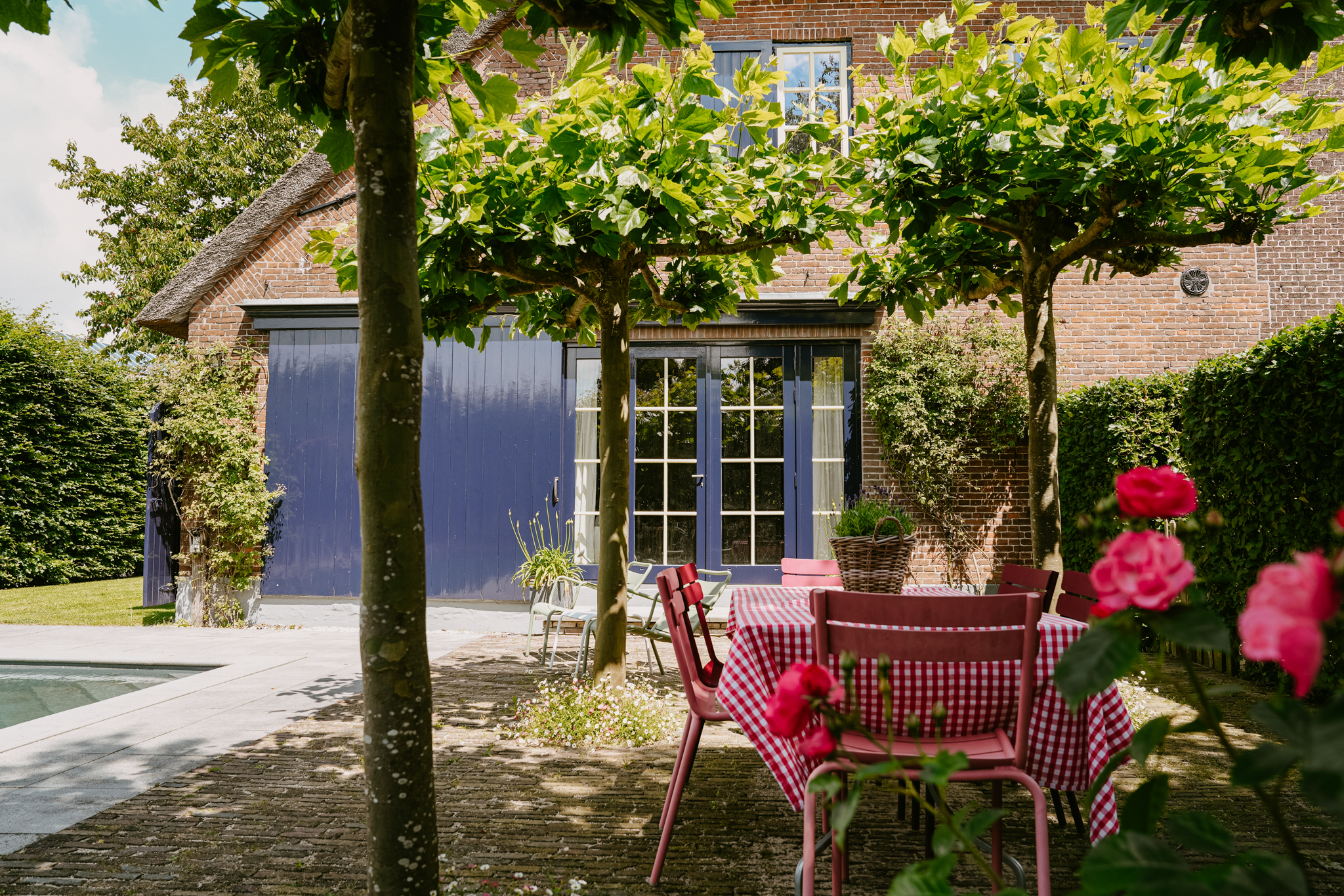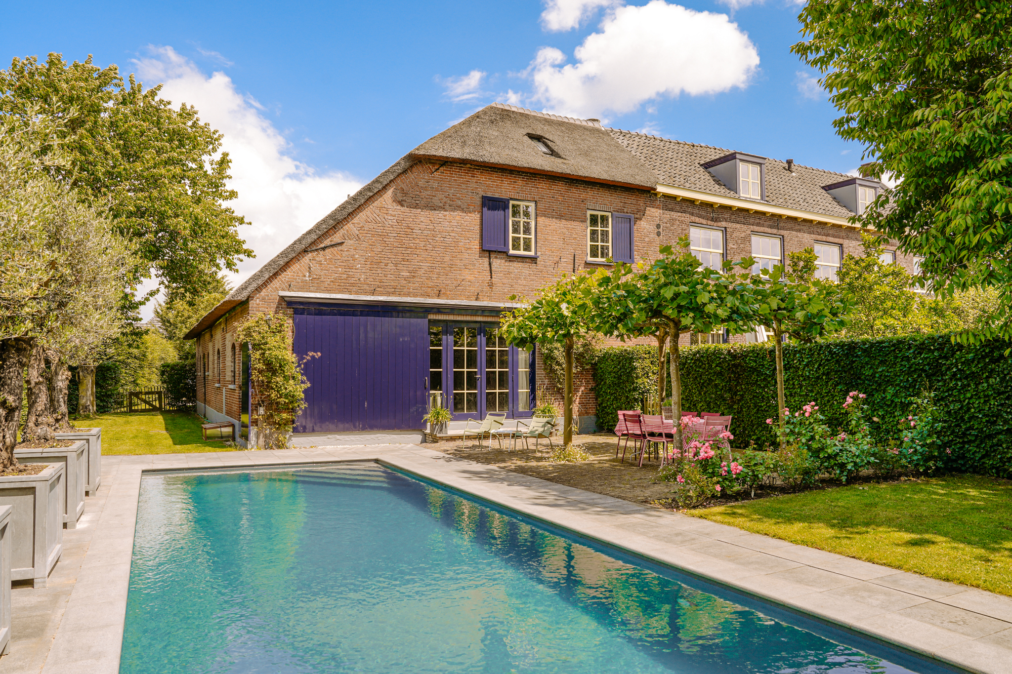 Rondom de boerderij ligt een zonovergoten tuin, verschillende terrassen, een moestuin met verhoogde kweekbakken en een luxe, verwarmd zwembad. Een waar paradijs voor elke tuinliefhebber.