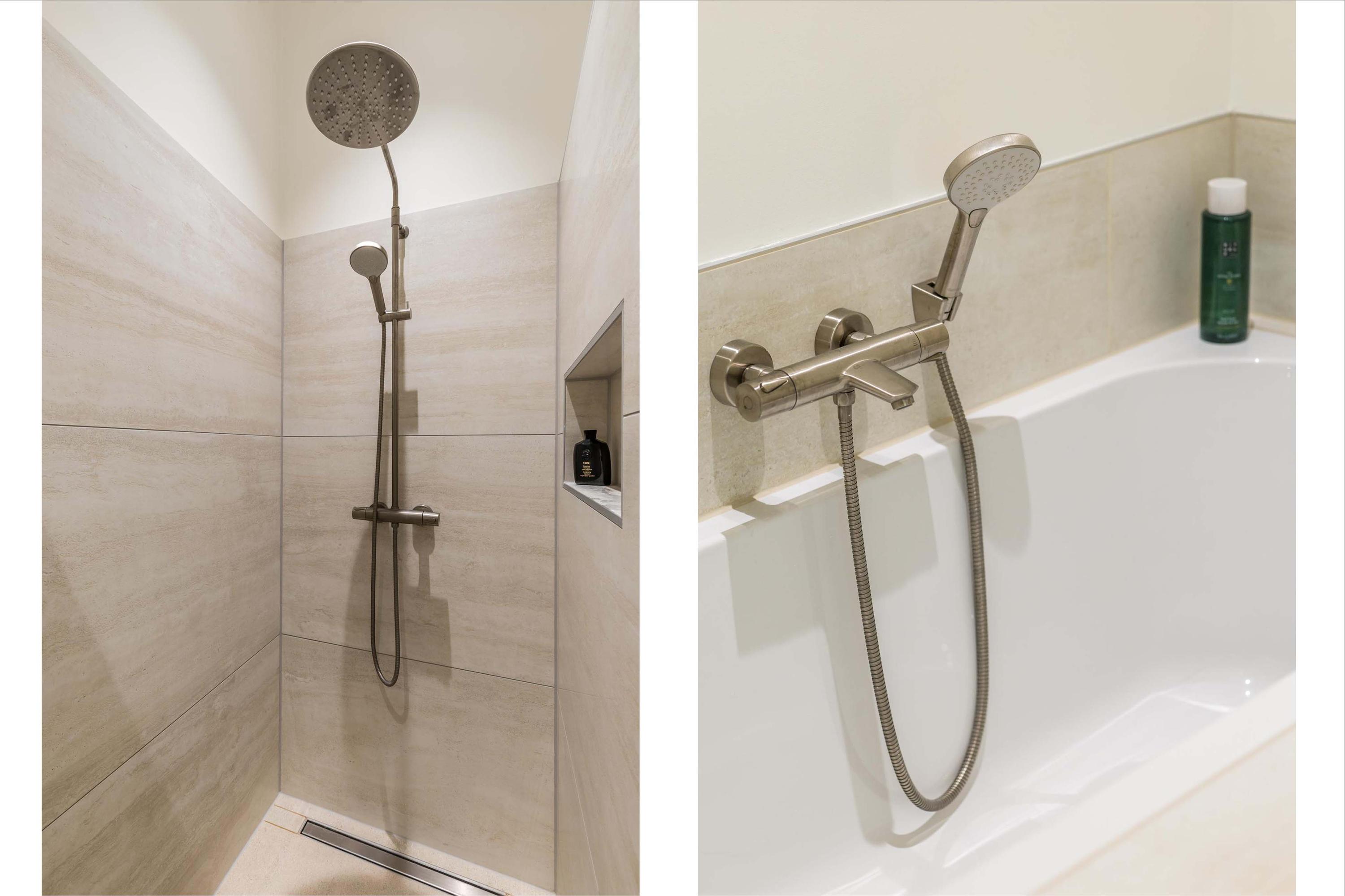 De badkamer is bijzonder royaal en stijlvol uitgevoerd, met een ligbad, inloopdouche, toilet en een groot wastafelmeubel.