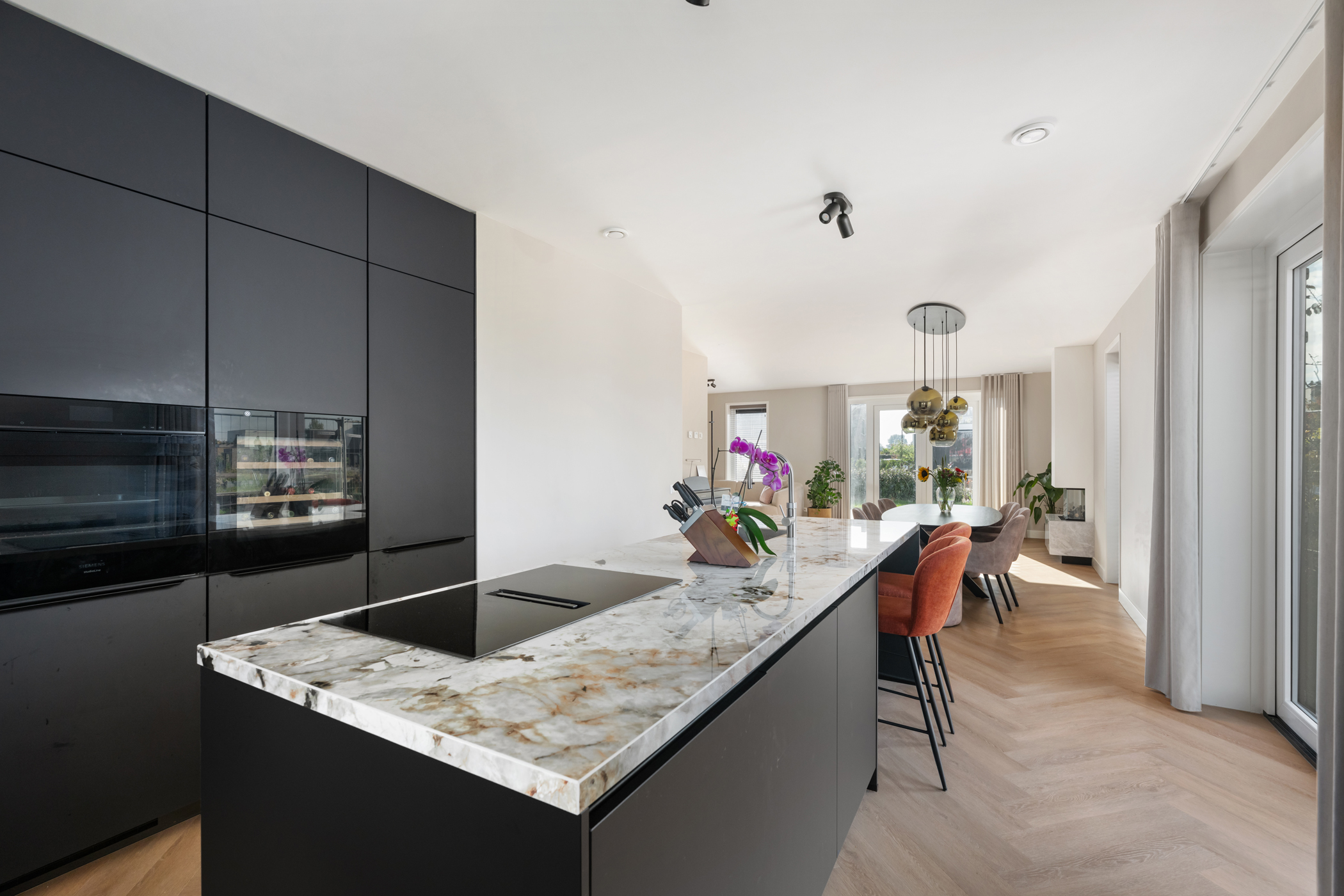 De keuken is compleet uitgerust met hoogwaardige inbouwapparatuur, waaronder een inductiekookplaat met geïntegreerde afzuiging, combi stoomoven, koelkast, vriezer, vaatwasser, wijnkoelkast en Quooker.