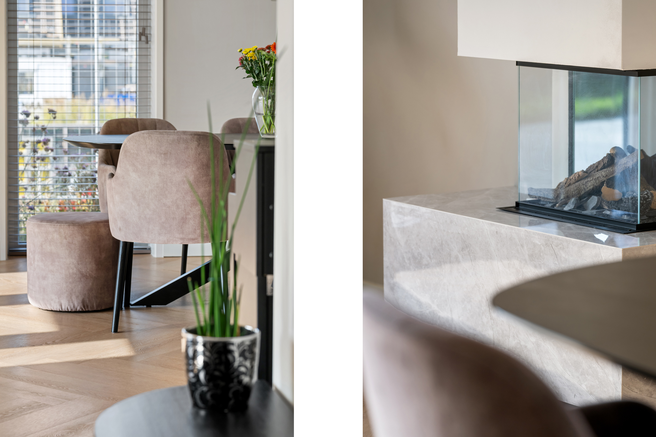 De sfeervolle woonkamer is opvallend licht en ruim, met het zitgedeelte aan de achterzijde van de woning, voorzien van een moderne elektrische haard. Aan de voorzijde bevindt zich de royale leefkeuken met een stijlvol kookeiland.