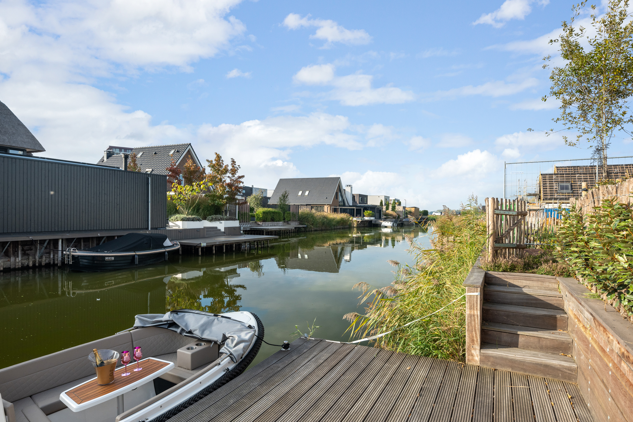 Via openslaande deuren stap je de fraai aangelegde achtertuin in een oase van rust en privacy. Dankzij de ligging op het zuiden geniet je hier de hele dag van zon, met tevens fijne plekken in de schaduw. Vanuit de tuin kijk je prachtig uit over het water en beschik je over een eigen aanlegsteiger voor een boot.
