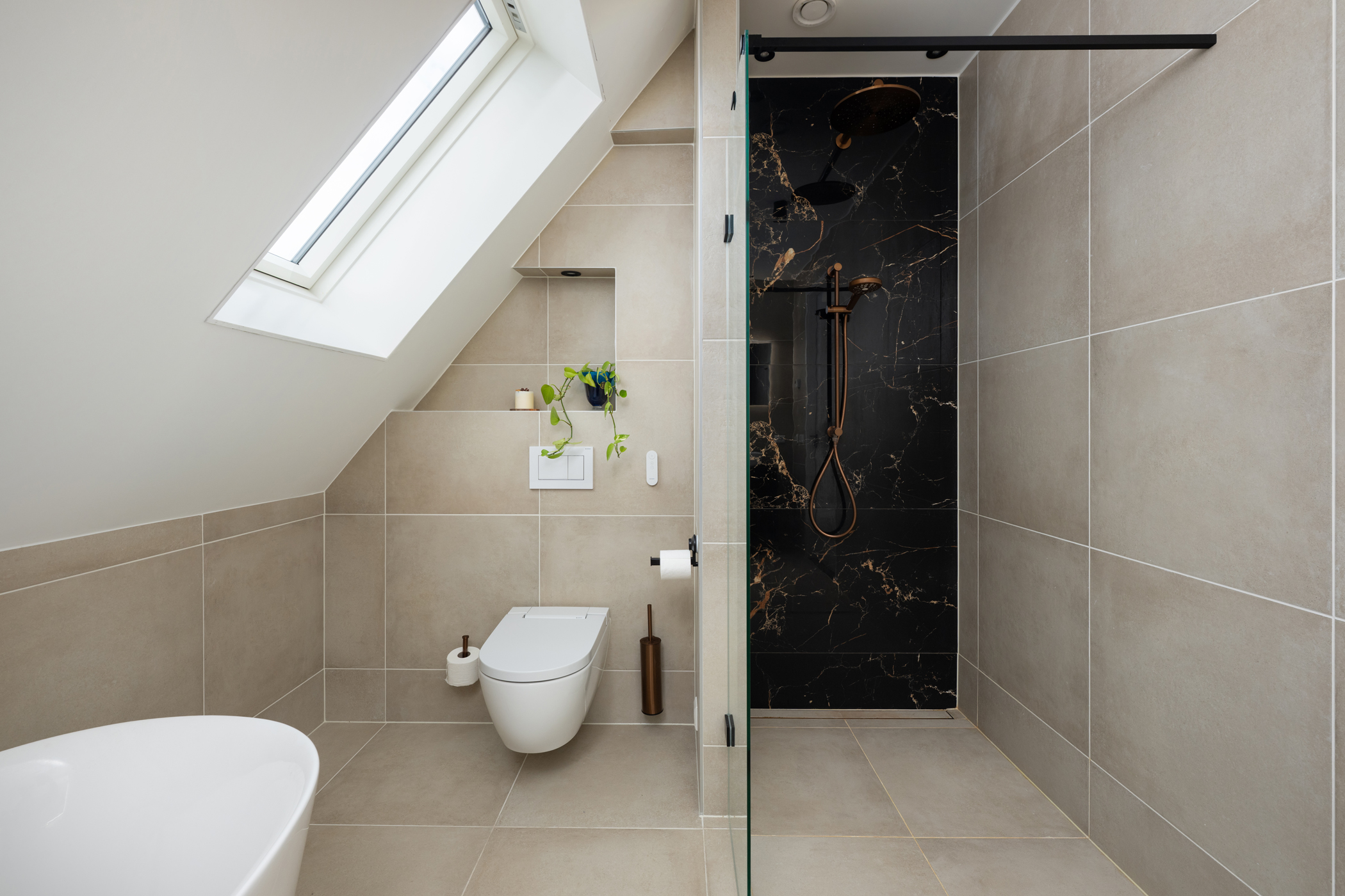 De moderne badkamer is voorzien van een ligbad, inloopdouche, toilet, dubbele wastafel en verlichte, verwarmde spiegel.