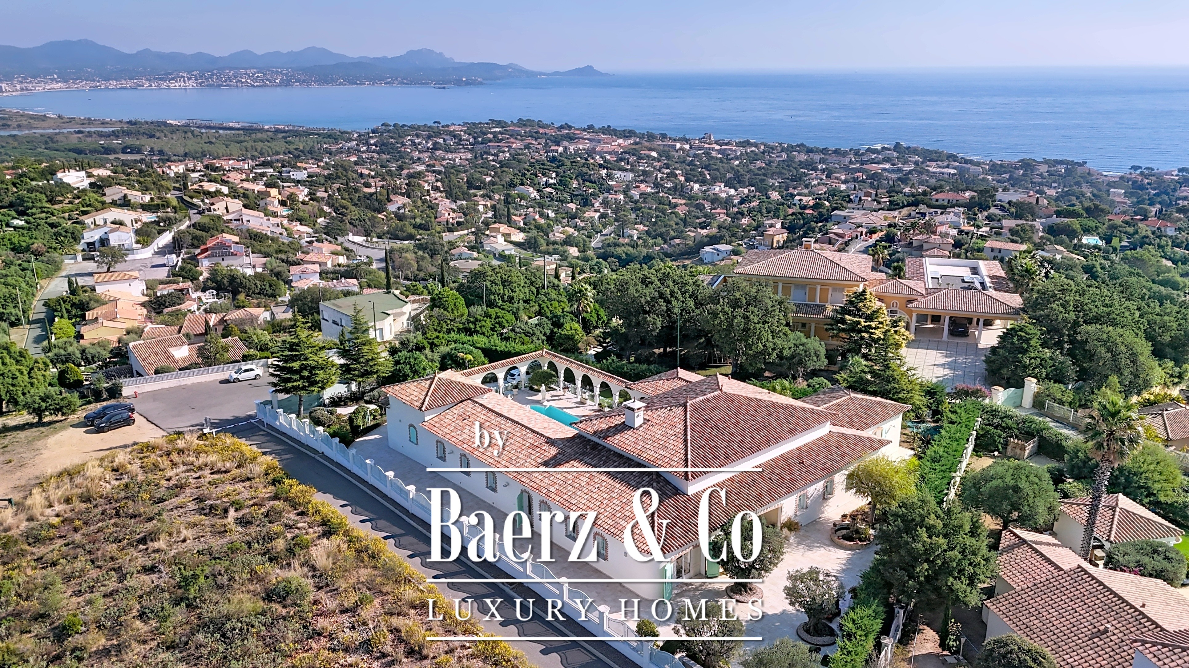 Exclusive Listing — A stunning single-storey villa inspired by the hacienda style, offering a panoramic view over the Mediterranean, the Estérel hills and the Gulf of Saint-Tropez. A rare sanctuary where elegance, light and serenity converge. Set on more than 2,000 m² of landscaped gardens, the property unfolds 400 m² of refined living spaces bathed in natural