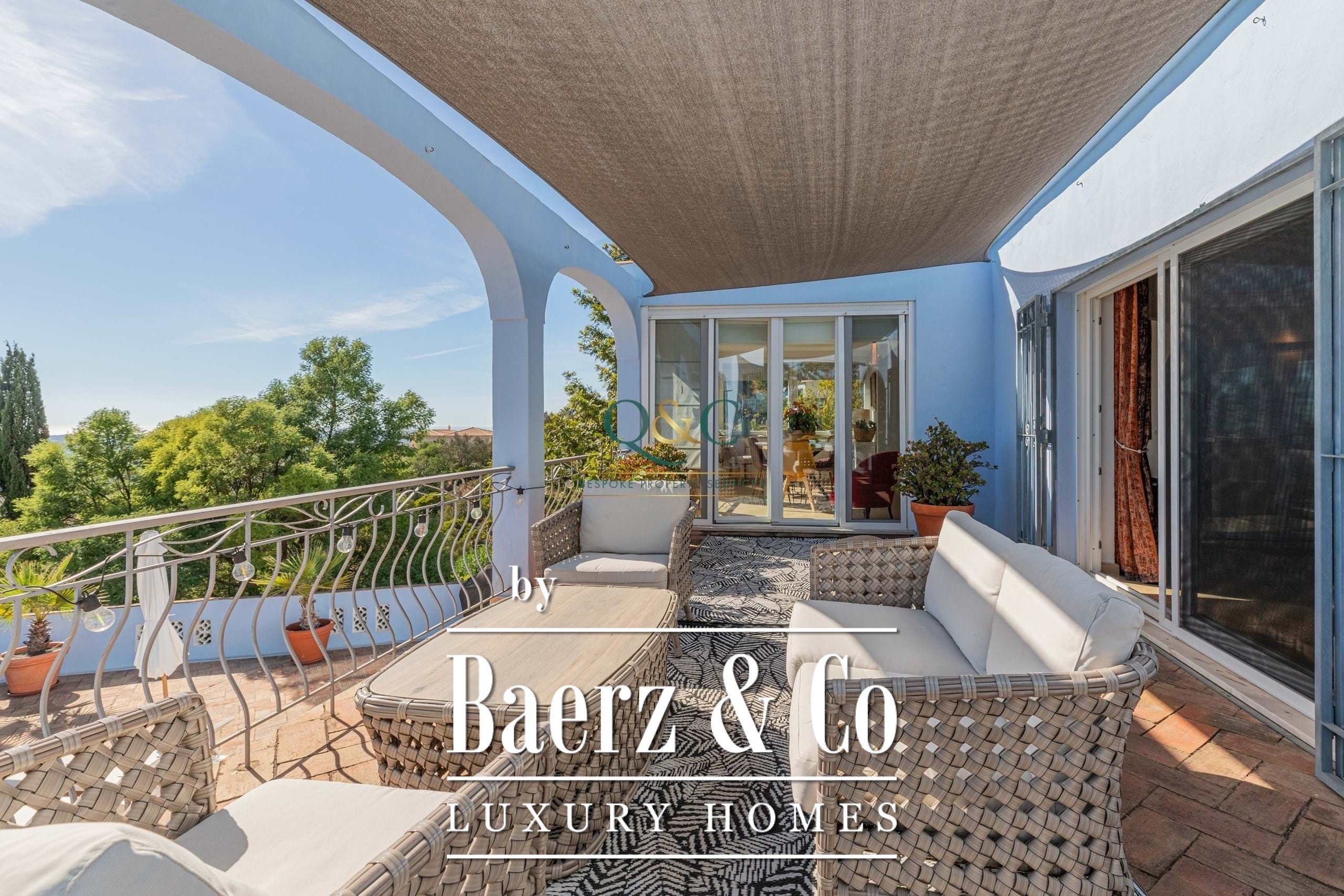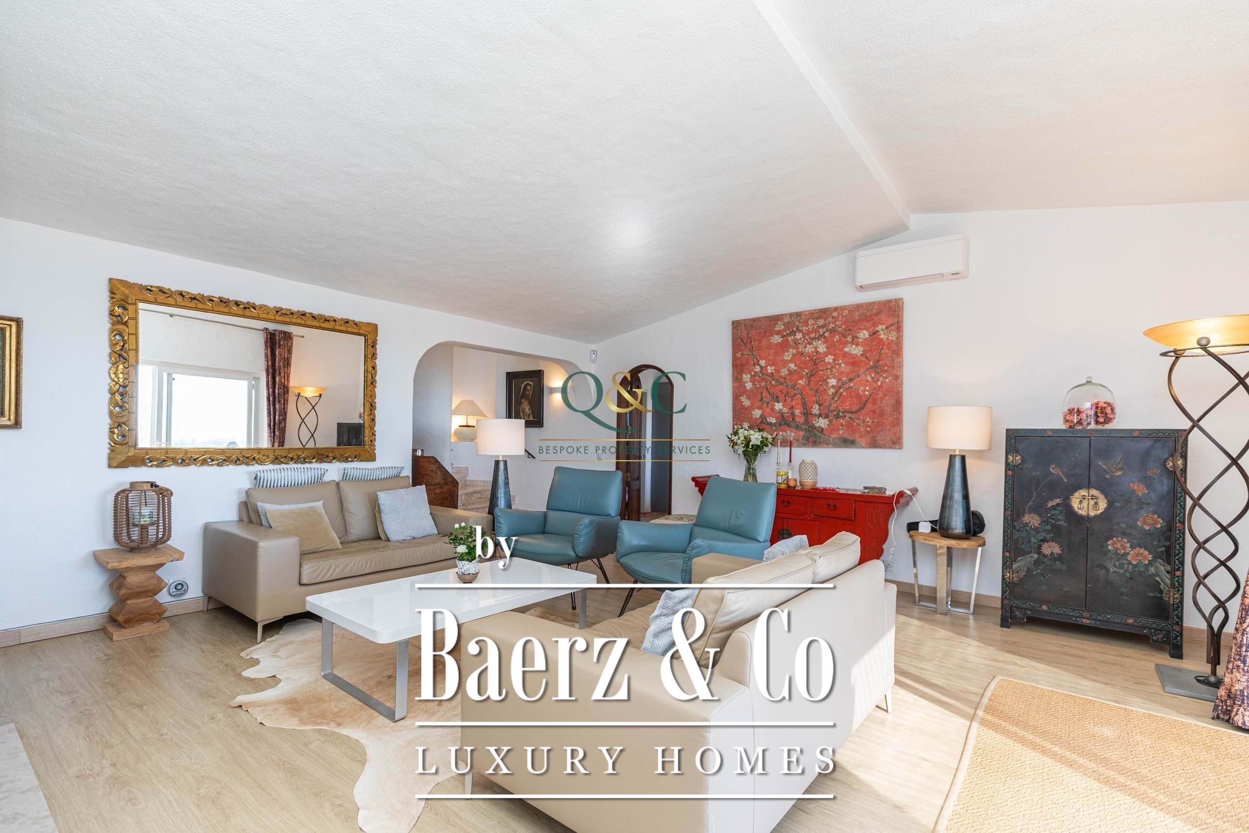 On the main level, the master suite is exceptionally spacious, featuring a newly refurbished bathroom and sliding doors opening directly onto the terrace. A sweeping staircase rises to the second double bedroom, also with a refurbished bathroom and private balcony, both enjoying the spectacular views.