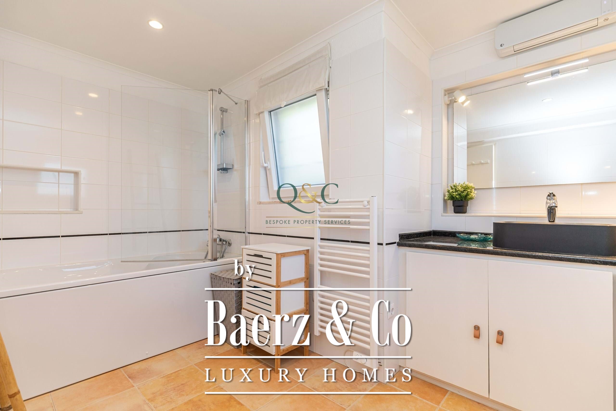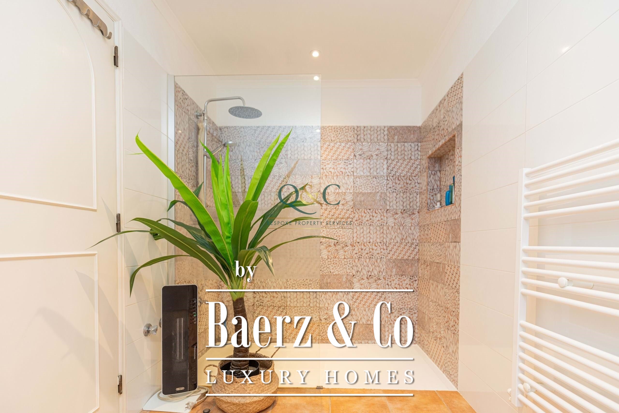 Set within a fully fenced plot, electric gates open to a sweeping calcada driveway leading to a garage, carport, and ample parking. The beautifully landscaped gardens feature mature trees and a well-chosen selection of drought-tolerant plants, creating a lush yet low-maintenance haven.