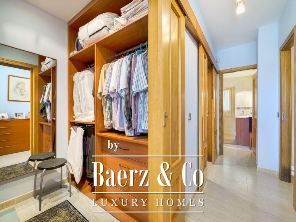 Gebouwd in 2005, staat de villa op een perceel van 990 m² en beschikt over een totale woonoppervlakte van 469 m², verdeeld over twee verdiepingen. Het ontwerp bevordert zowel privacy als samen leven, met zes slaapkamers, drie badkamers waarvan twee en suite, en twee inloopkasten. De begane grond loopt naadloos over van een royale woonkeuken naar een lichte woonkamer, grenzend aan een overdekt terras met uitzicht op de bergen en een glimp van de baai van Santa Ponsa in de verte.