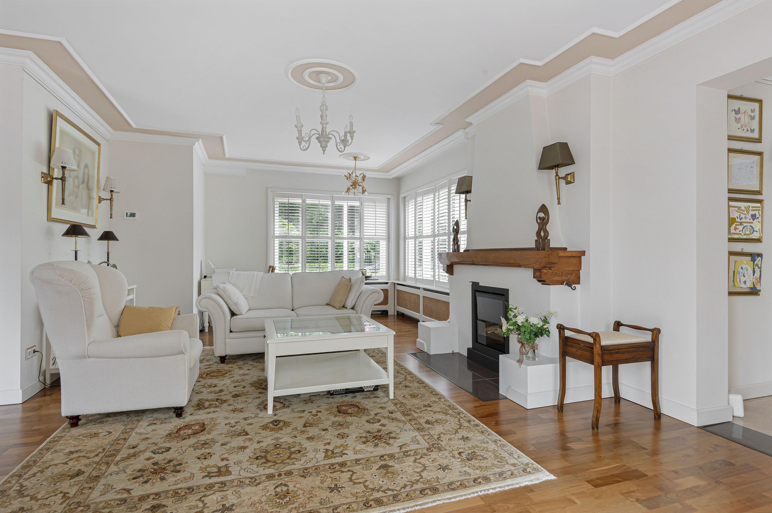 Entree in zeer ruime hal, sfeervolle glas in lood ramen, toilet en verdiepte garderobe. De woonkamer is opgesteld in L-vorm, heeft veel lichtinval, sfeervolle gashaard en is voorzien van een prachtige houten parketvloer. De serre en tweede woonkamer zijn later aangebouwd waardoor er veel extra ruimte is gecreëerd welke meerdere mogelijkheden geven. De serre en tweede woonkamer zijn voorzien van een nette tegelvloer met vloerverwarming. De keuken is gelegen aan de voorzijde van de woning welke tevens toegang biedt tot de ruime bijkeuken.