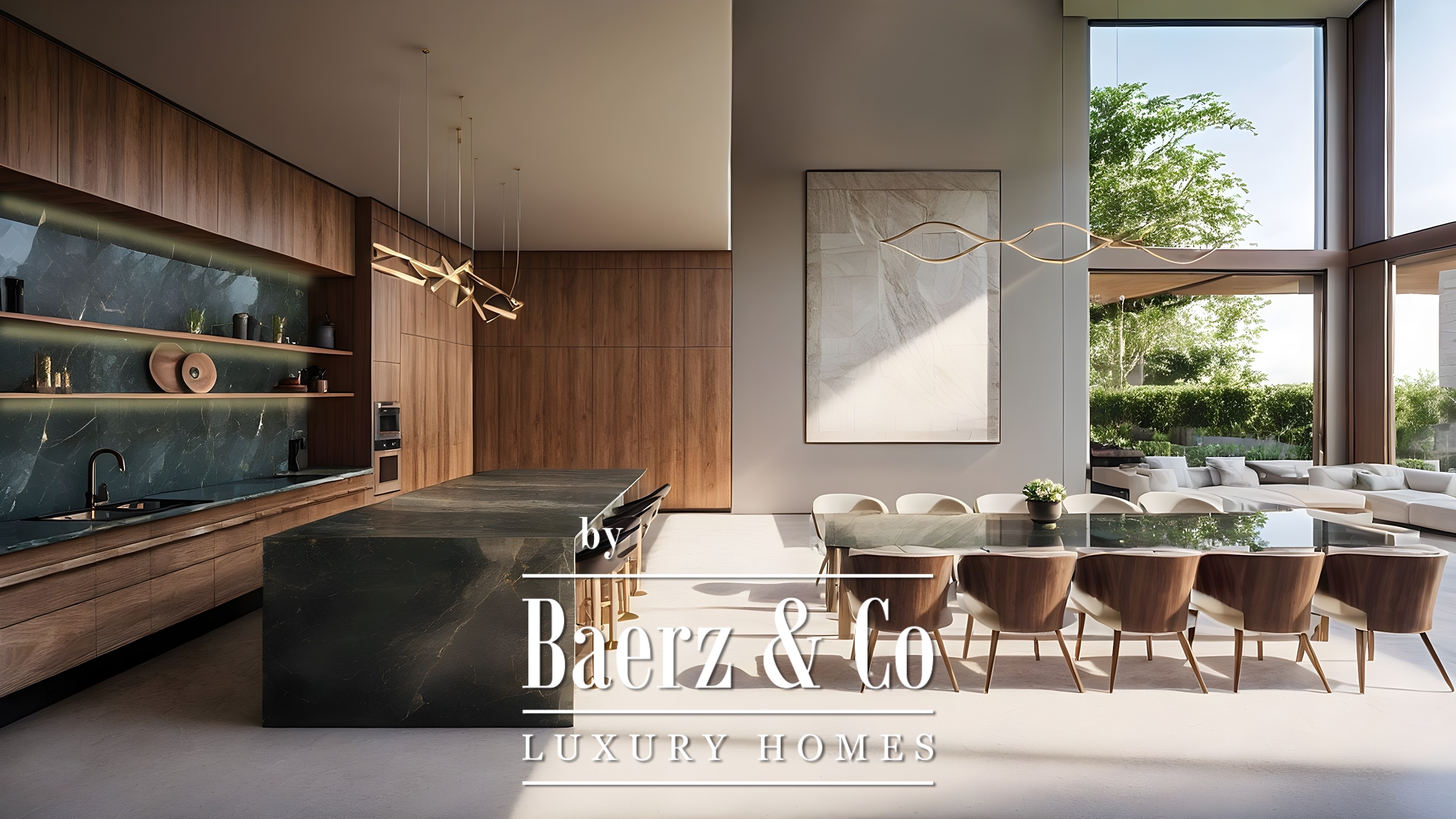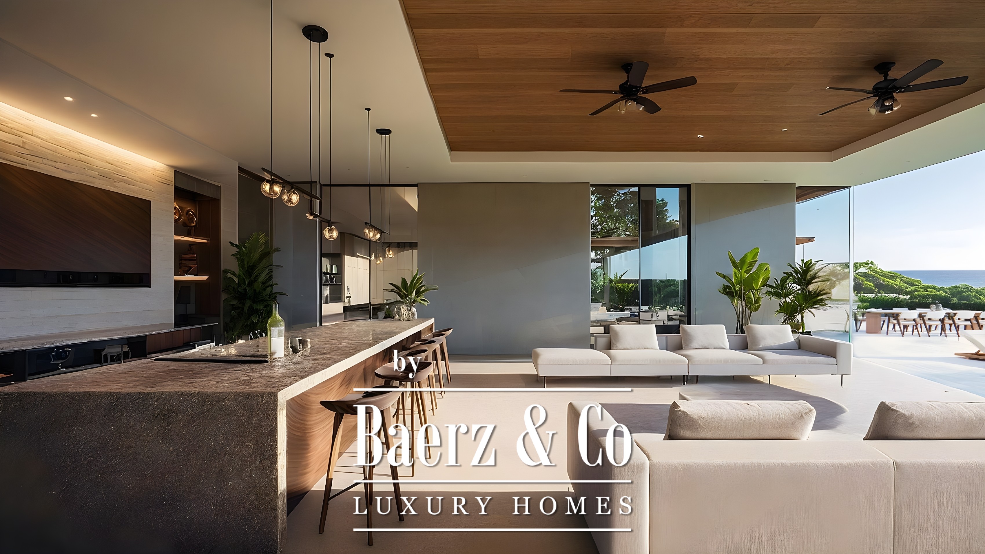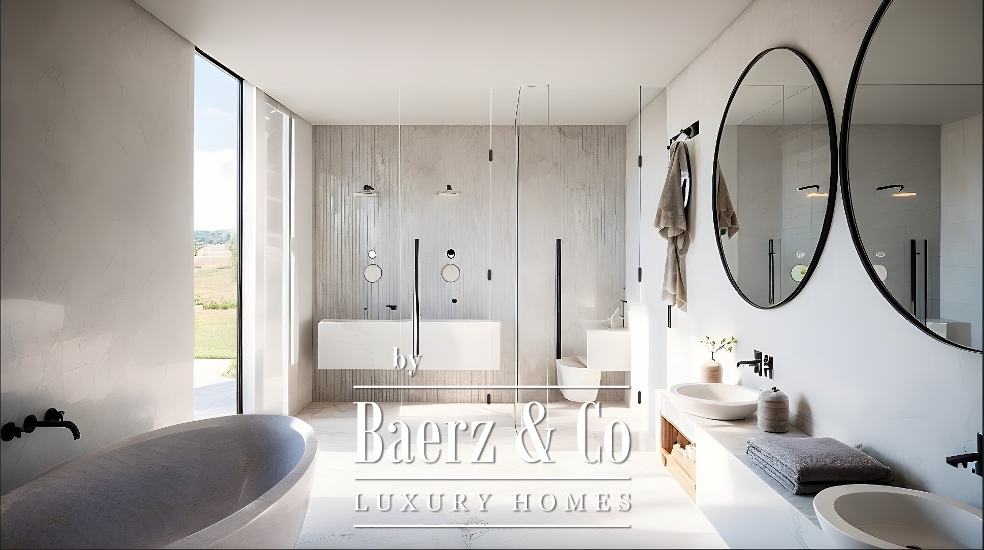 Bij binnenkomst openbaart de hoofdverdieping een woonruimte, eetkamer en keuken van ruim 150 m², die naadloos in elkaar overlopen en uitzicht bieden op de tuin en het zwembad via royale glaspartijen. Zo vervagen binnen- en buitenleven in elkaar. Op dit niveau bevinden zich twee master suites, elk met eigen badkamer en kleedruimte.