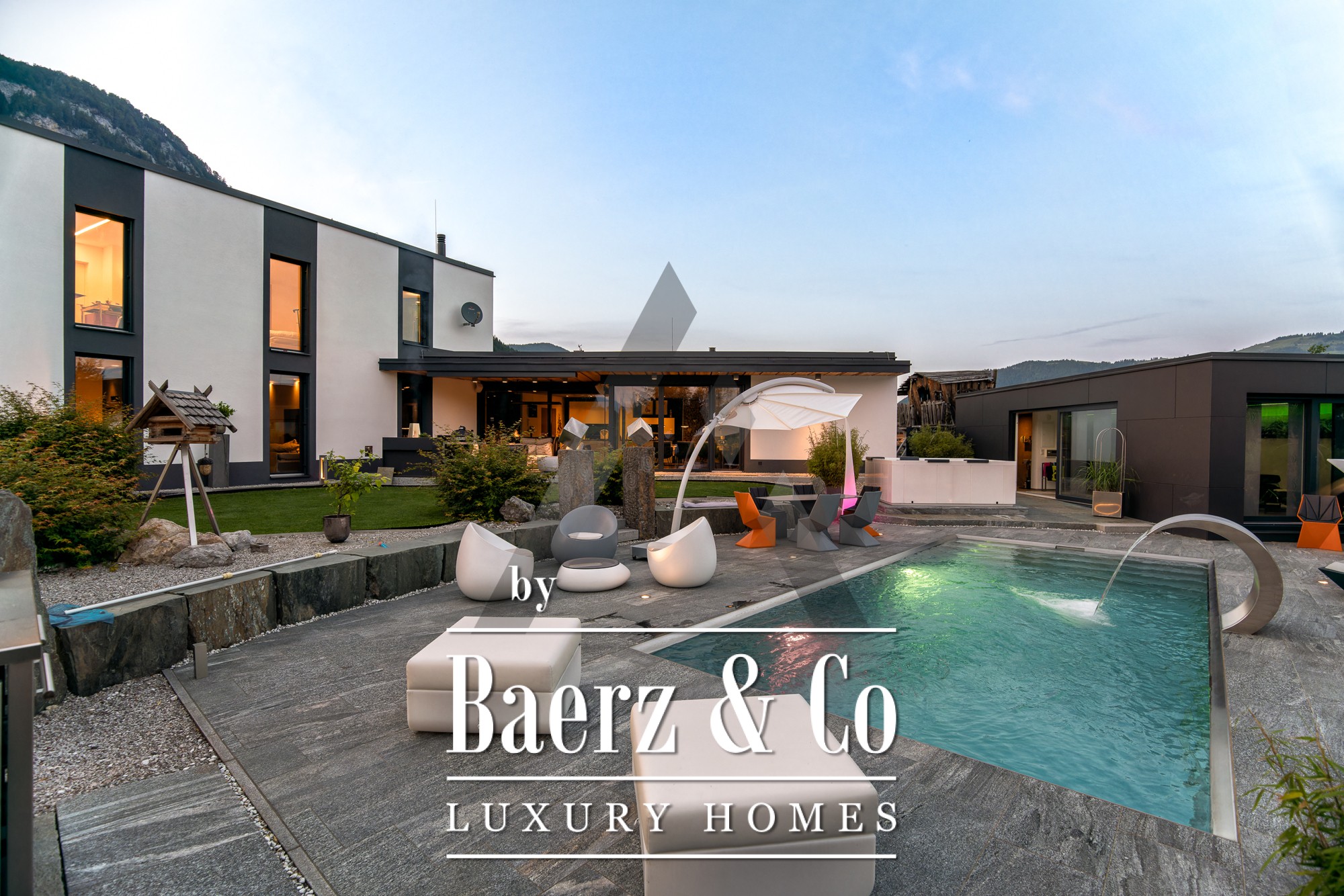 Binnen zorgen zichtbetonnen plafonds en gerecyclede eiken vloeren voor een subtiele verfijning. De open begane grond vormt het kloppend hart van de woning; panoramavensters vullen de woonkamer, eetkamer en de designkeuken van Miele met natuurlijk licht. Op de begane grond bevindt zich een mastersuite met dressing, een kinderkamer, ruime badkamers en praktische opbergruimte. Boven is een apart appartement met twee slaapkamers, een leefruimte met open haard en een dakterras met indrukwekkend bergzicht. Daarnaast is er op de verdieping een volledig geklimatiseerde fitnessruimte van 18 m² met toegang tot een eigen terras.