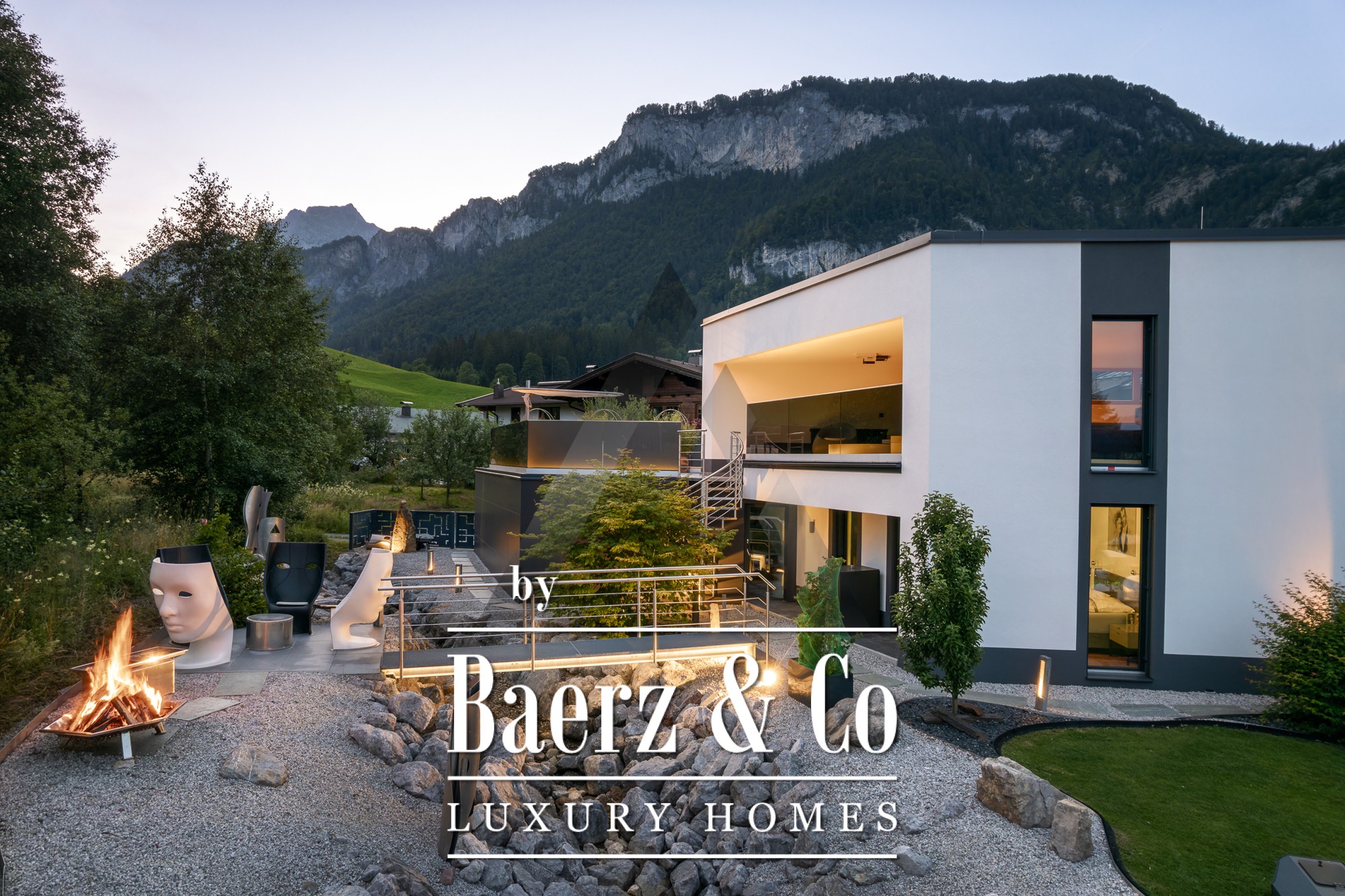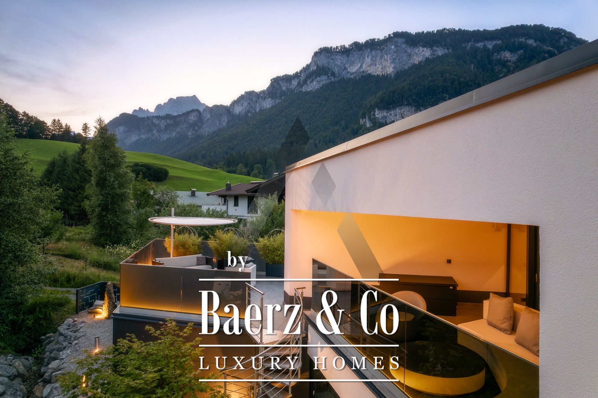 Vrijstaande woning St. Johann in Tirol is gelegen op een rustige, zonnige locatie met een weids uitzicht op de Kitzbüheler Horn en de Wilder Kaiser. Deze eigentijdse villa biedt 418 m² woonoppervlak op een perceel van 1.186 m² en belichaamt het verfijnde alpine leven. De idyllische tuin beschikt over een vijver, aangelegde beekjes, royale terrassen en een panoramisch berglandschap. Buiten geniet u van een roestvrijstalen zwembad, een Treesse designer whirlpool en een sauna, ideaal voor ontspannen ochtenden en verkwikkende middagen.