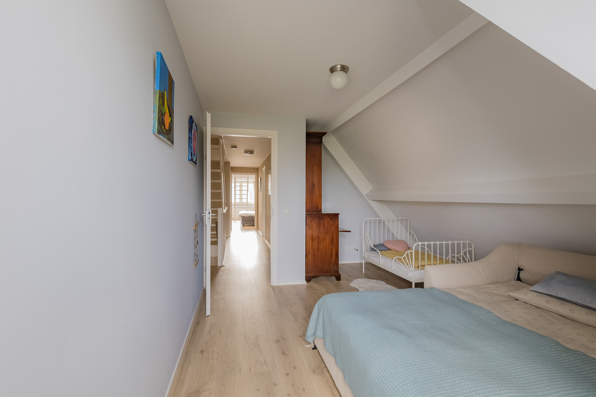 Via de open trap kom je op de eerste verdieping. De vide en overloop zorgen voor een open en ruimtelijk gevoel. Je hebt hier vier royale slaapkamers waarvan er één momenteel in gebruik is als kleedkamer.