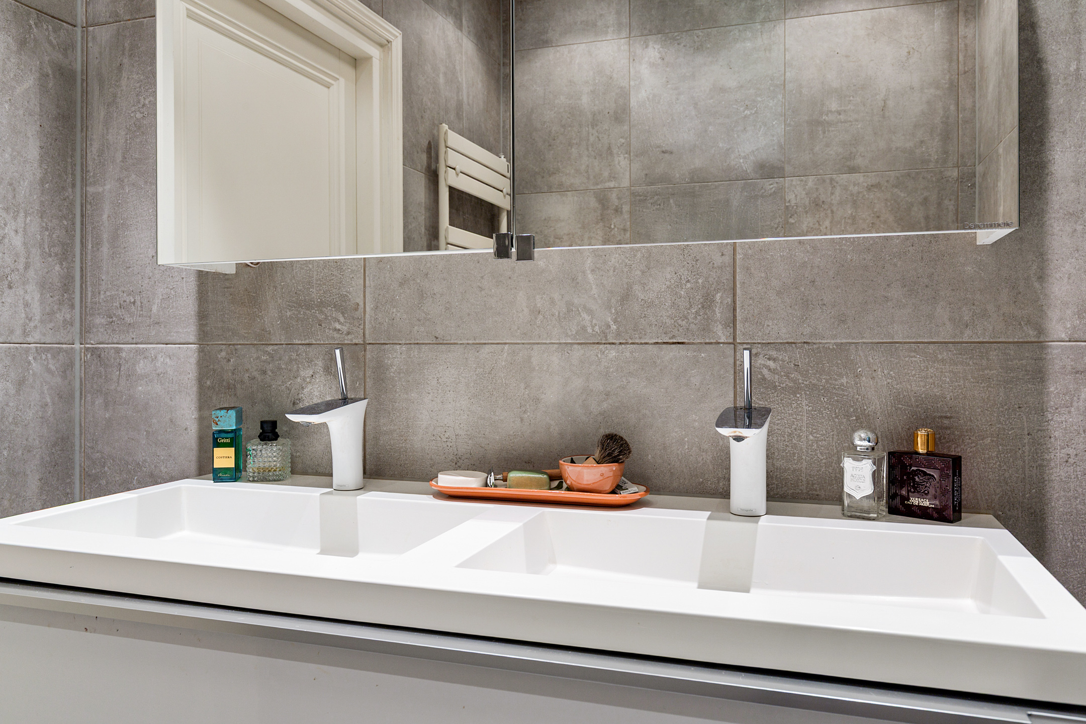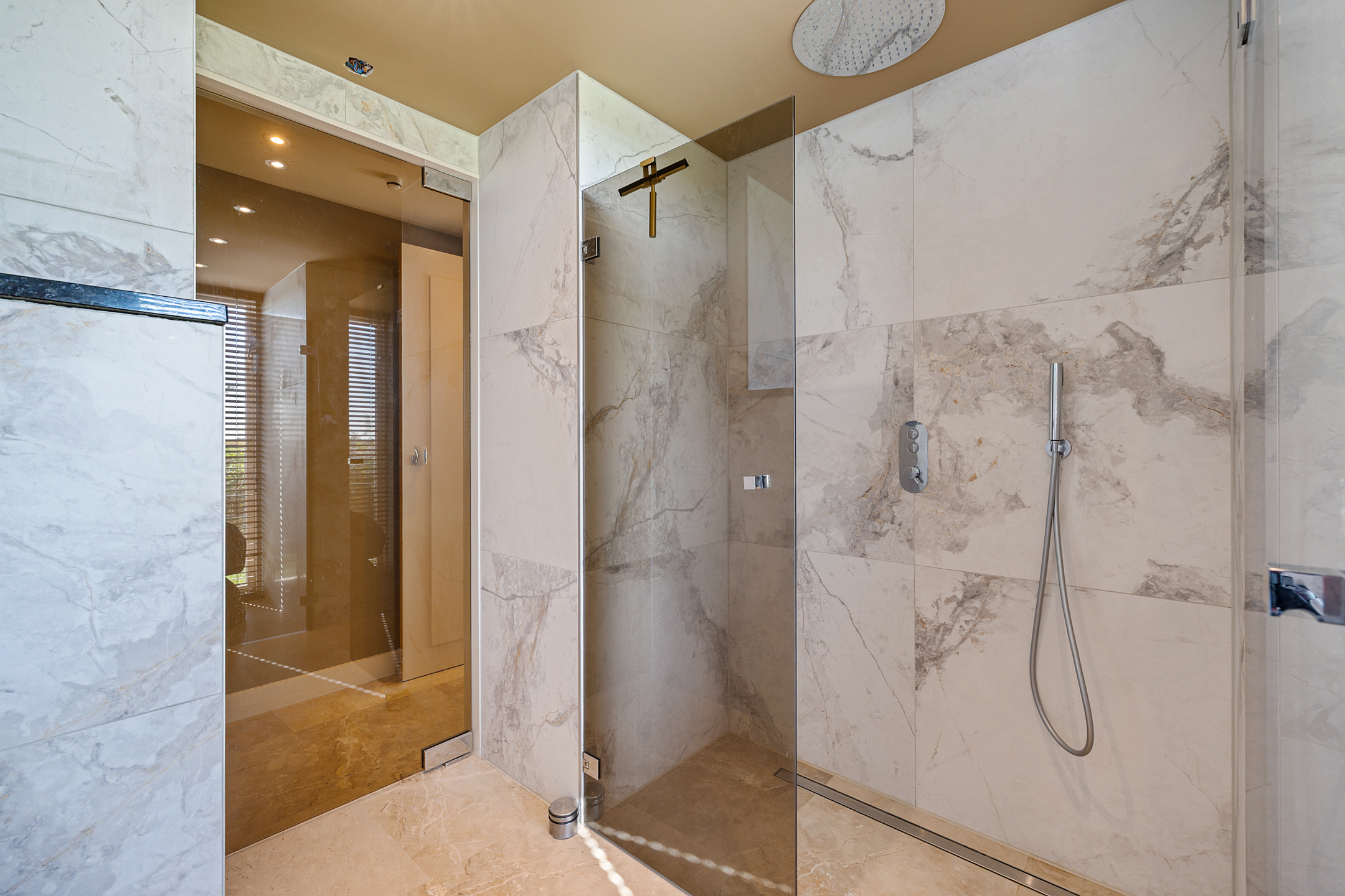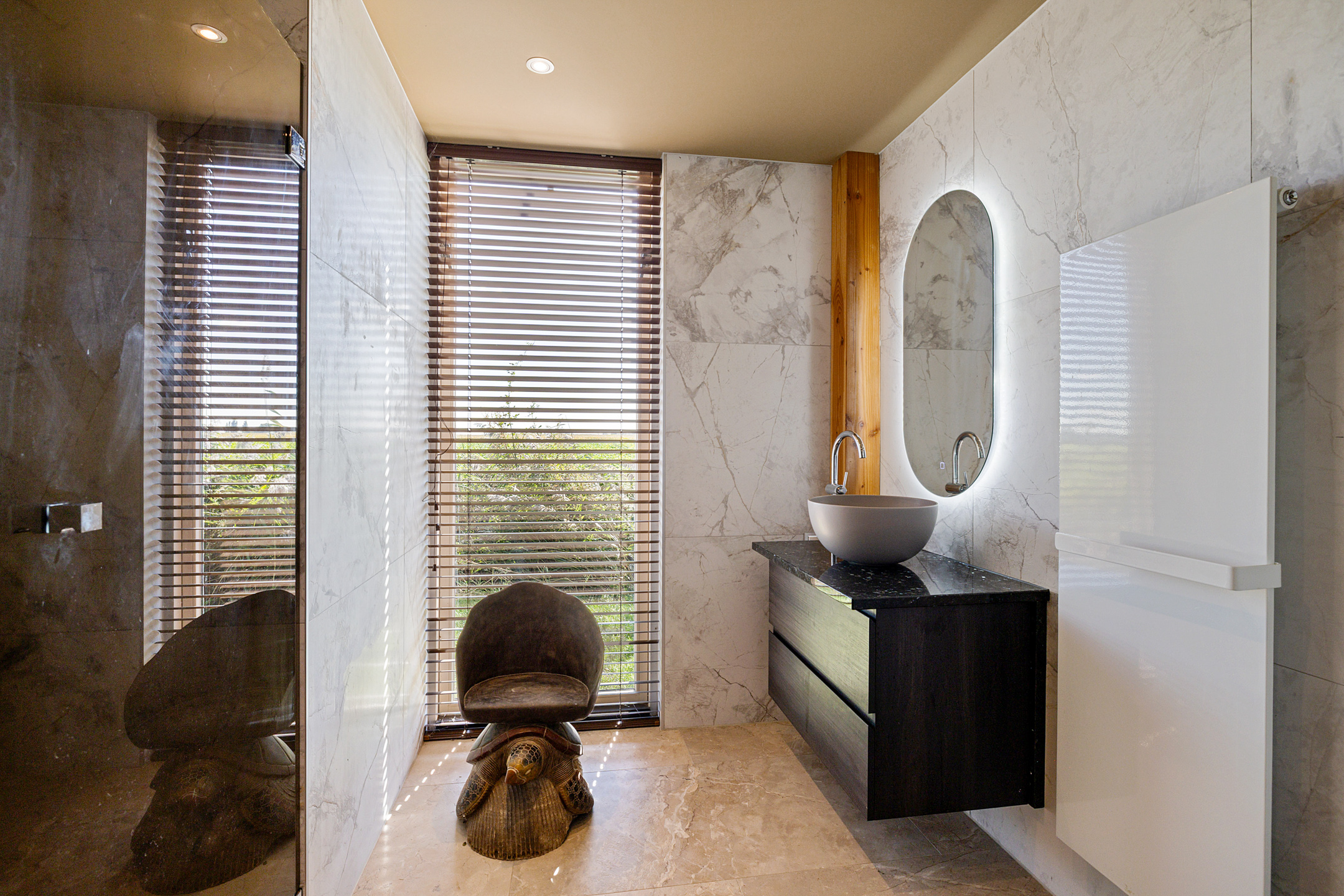 De luxe vloer met keramische tegels is voorzien van vloerverwarming, en de verlichting is domotica gestuurd.