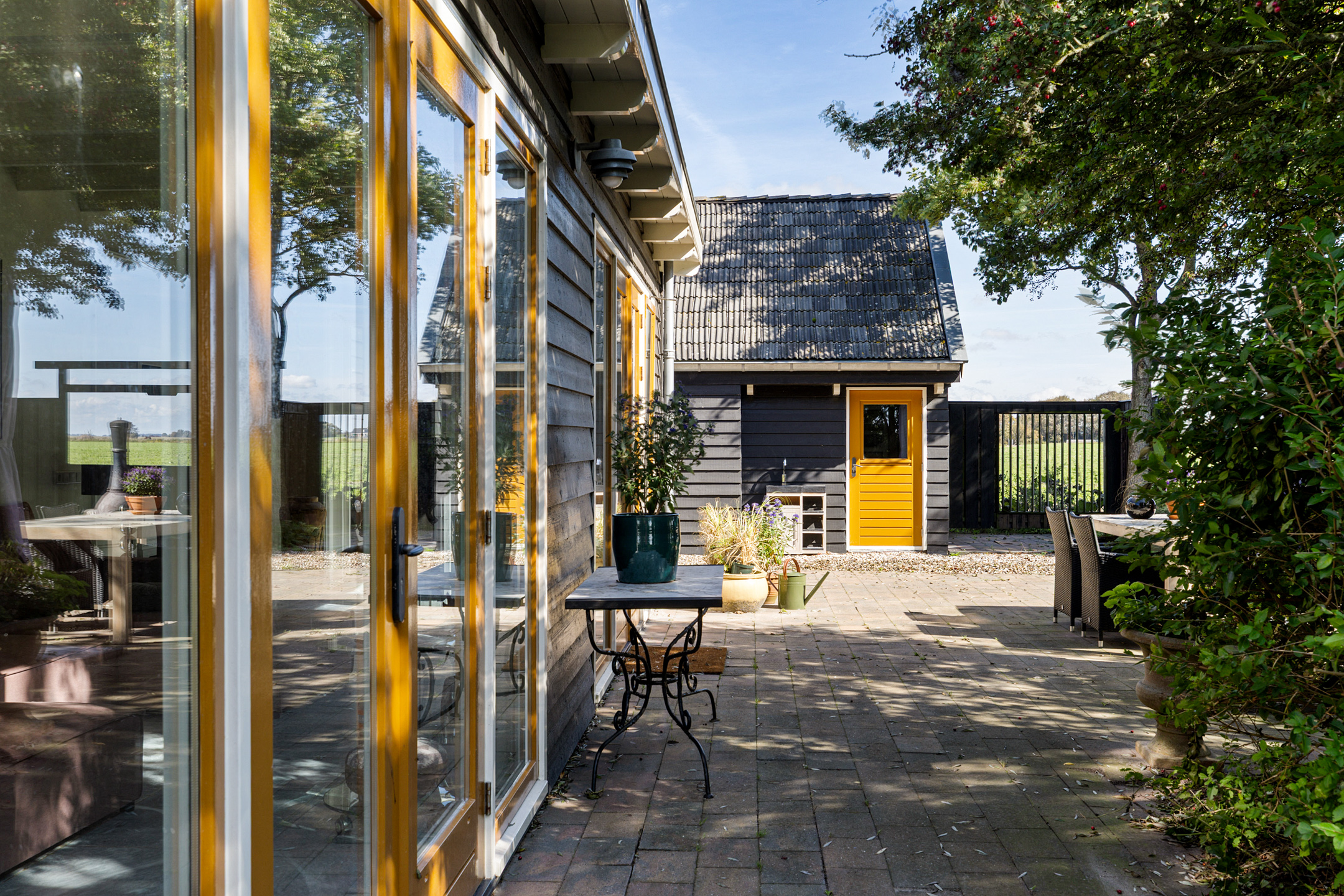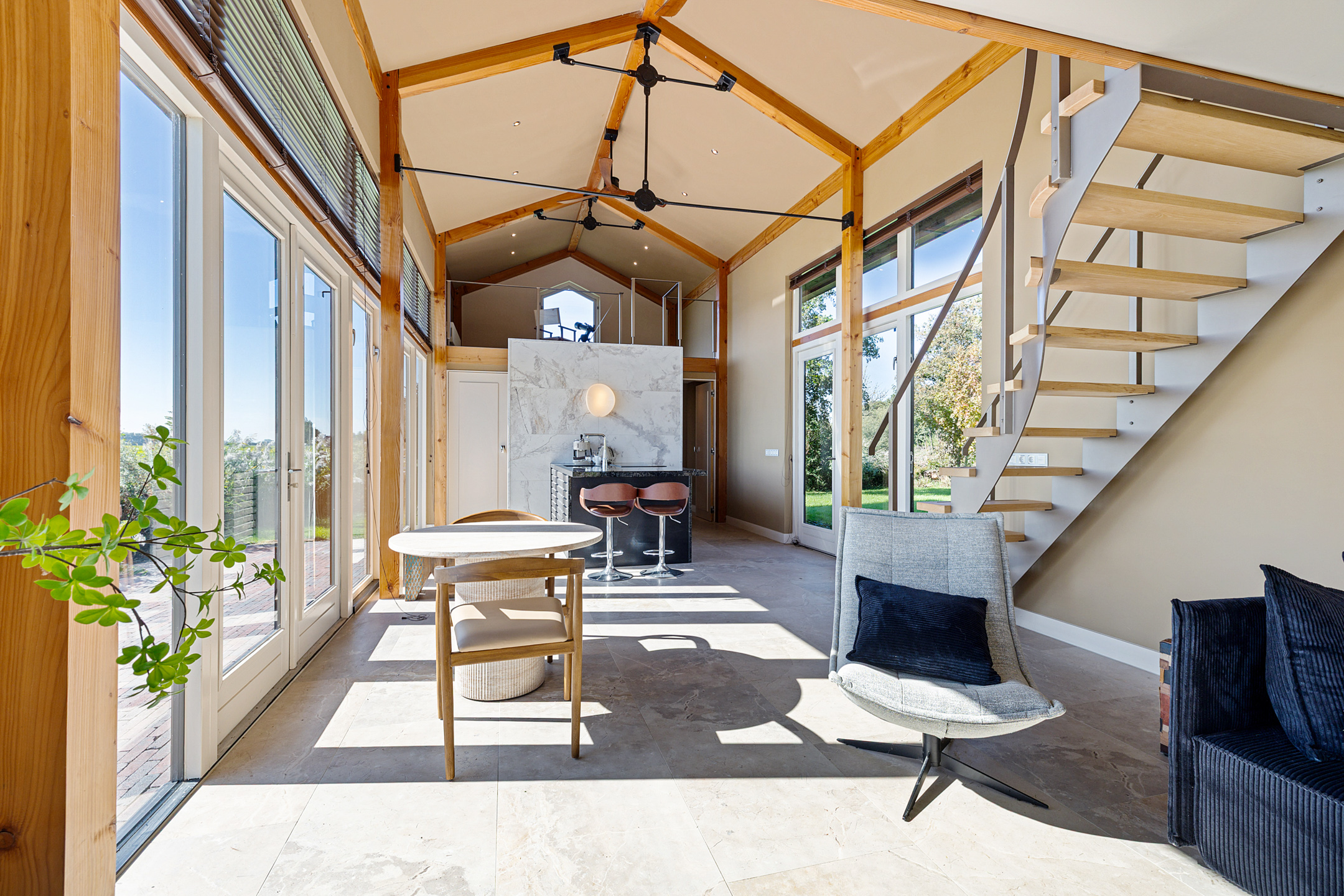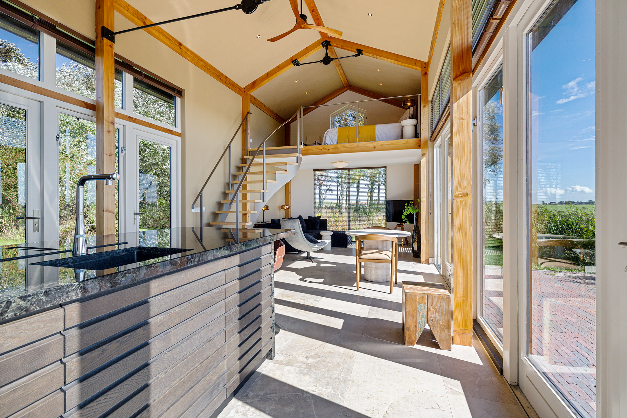 Het bijhuis, type schuurwoning (ca 13x4.5m) is onder architectuur gebouwd, volledig geïsoleerd en rondom voorzien van hoge raampartijen (HR++) met panoramisch zicht. De huisje is aan de lange zijde zowel aan de voorkant als aan de achterkant middels openslaande tuindeuren te betreden. Met aan beide zijden terrassen met handgevormde klinkers. De lichte hoge ruimte met stoere douglas spanten in het zicht benadrukken het leven in en met de natuur. Dankzij het dark-sky gebied is de prachtige sterrenhemel helder in volle glorie te zien. Zelfs het Noorderlicht vertoont zich hier geregeld. En wat van de overvliegende zwermen water-, trek- en weidevogels..