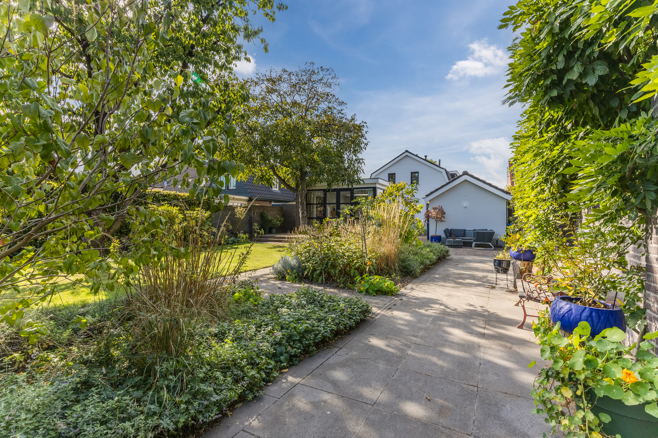 De fraai aangelegde tuin is een ware eyecatcher. Met meerdere terrassen, een gazon en borders met bloemen en planten is dit een heerlijke plek om te ontspannen en te genieten van het buitenleven. Op het eigen perceel bevinden zich tevens een garage en een ruime oprit met parkeergelegenheid voor meerdere auto’s.