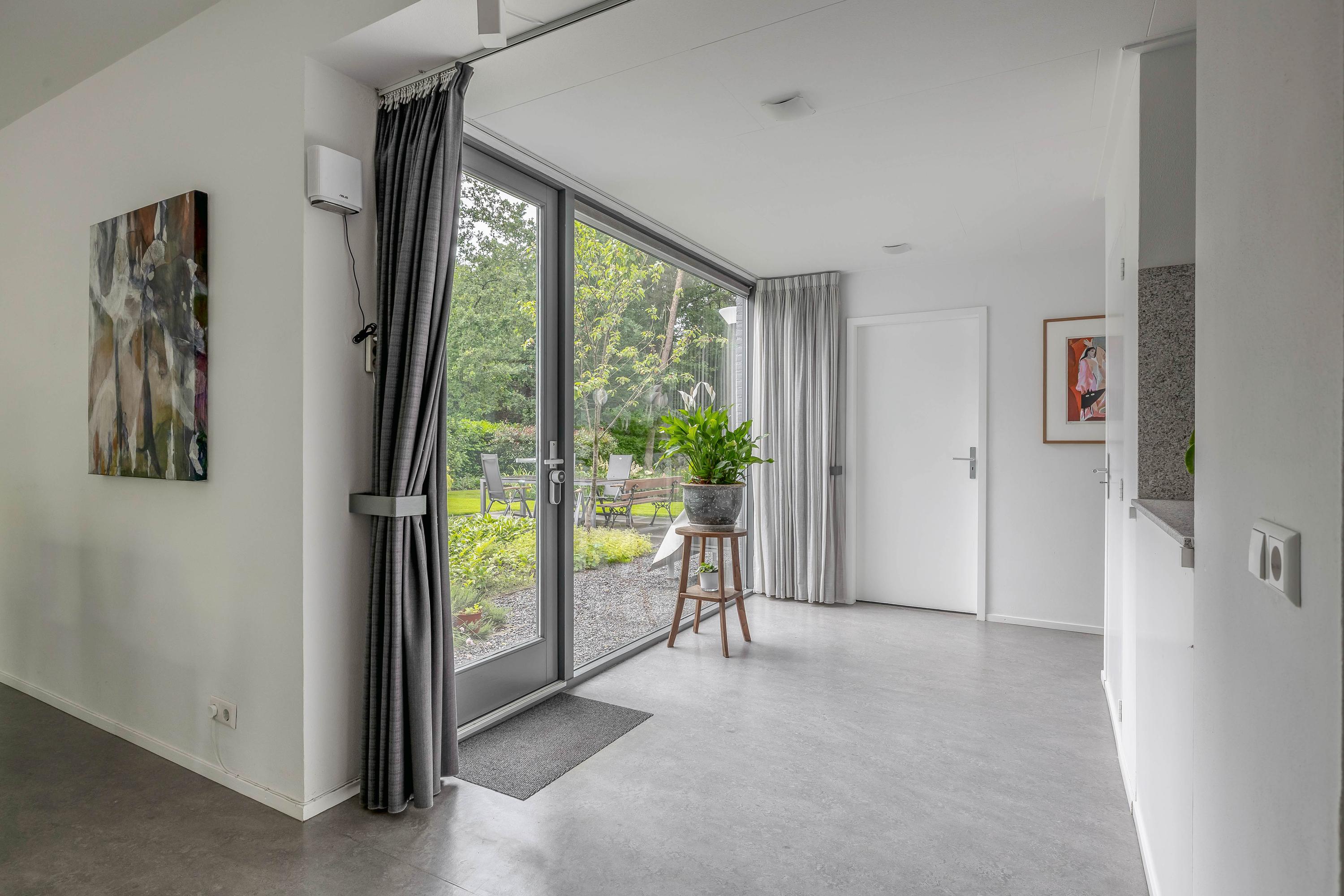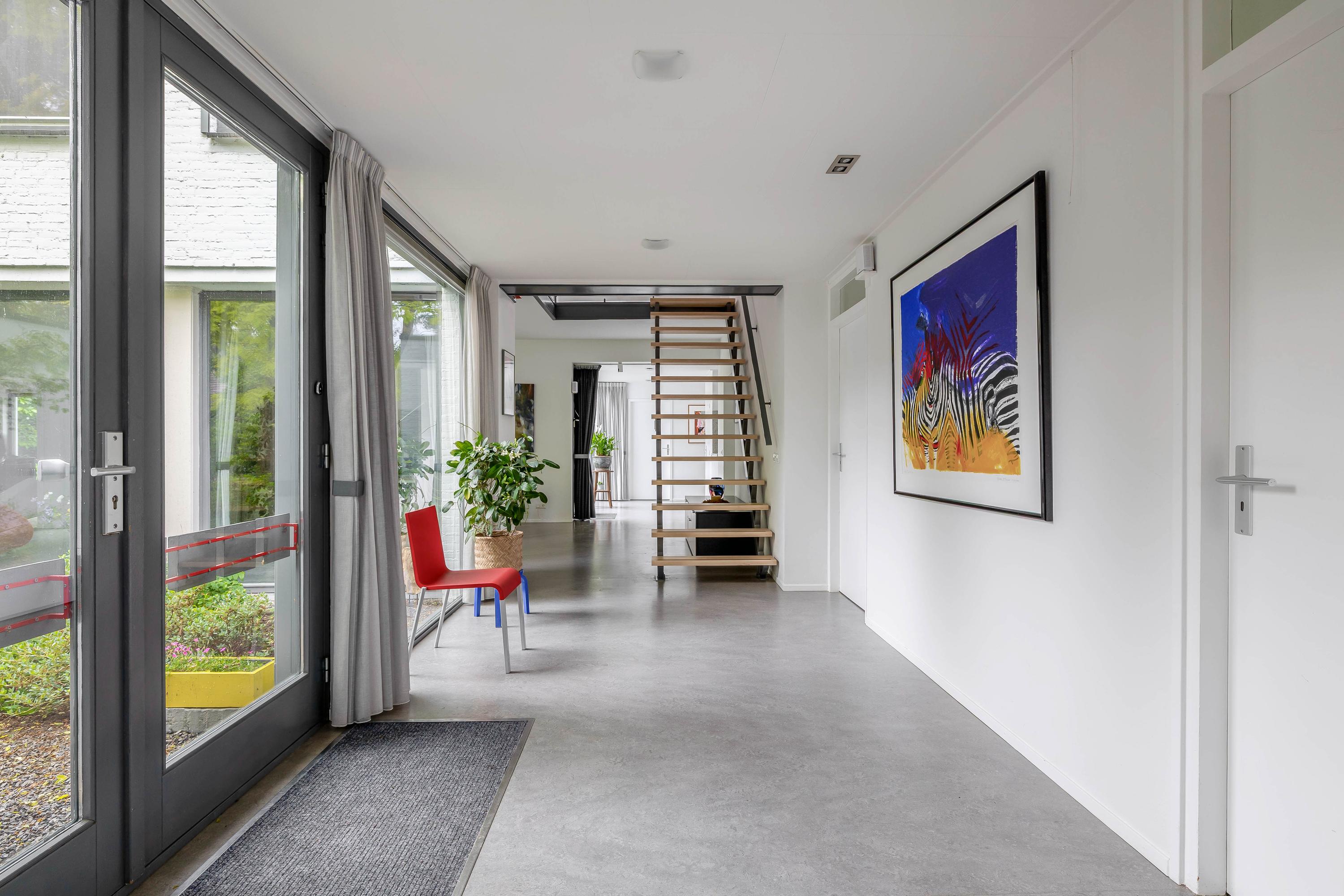 Je betreedt de woning via een royale, open entreehal met dubbele deuren. Deze beschikt over veel natuurlijke lichtinval dankzij de grote raampartijen.