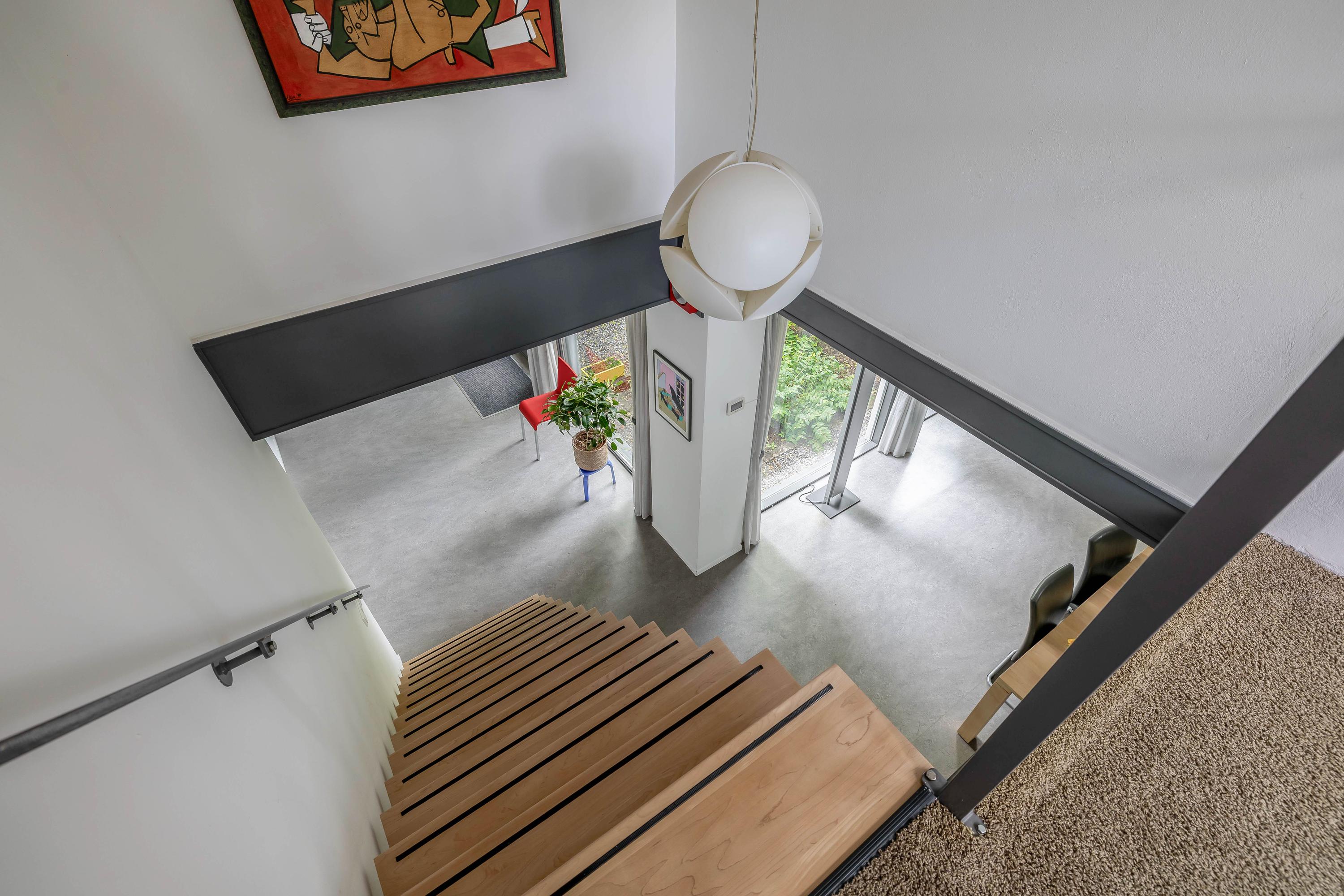 De open doorloop vanuit de entreehal leidt je naar de lichte en ruime woonkamer. Deze is afgewerkt met strak stucwerk op de wanden en de grote raampartijen tot vloerniveau bieden zicht op de patiotuin . Vloeren zijn uitgevoerd met vloerverwarming alsmede de mogelijkheid tot verkoeling, wat zorgt voor een aangenaam klimaat in elk seizoen. Een blikvanger in de woonkamer is de open trapopgang van esdoornhout en staal naar de verdieping.
